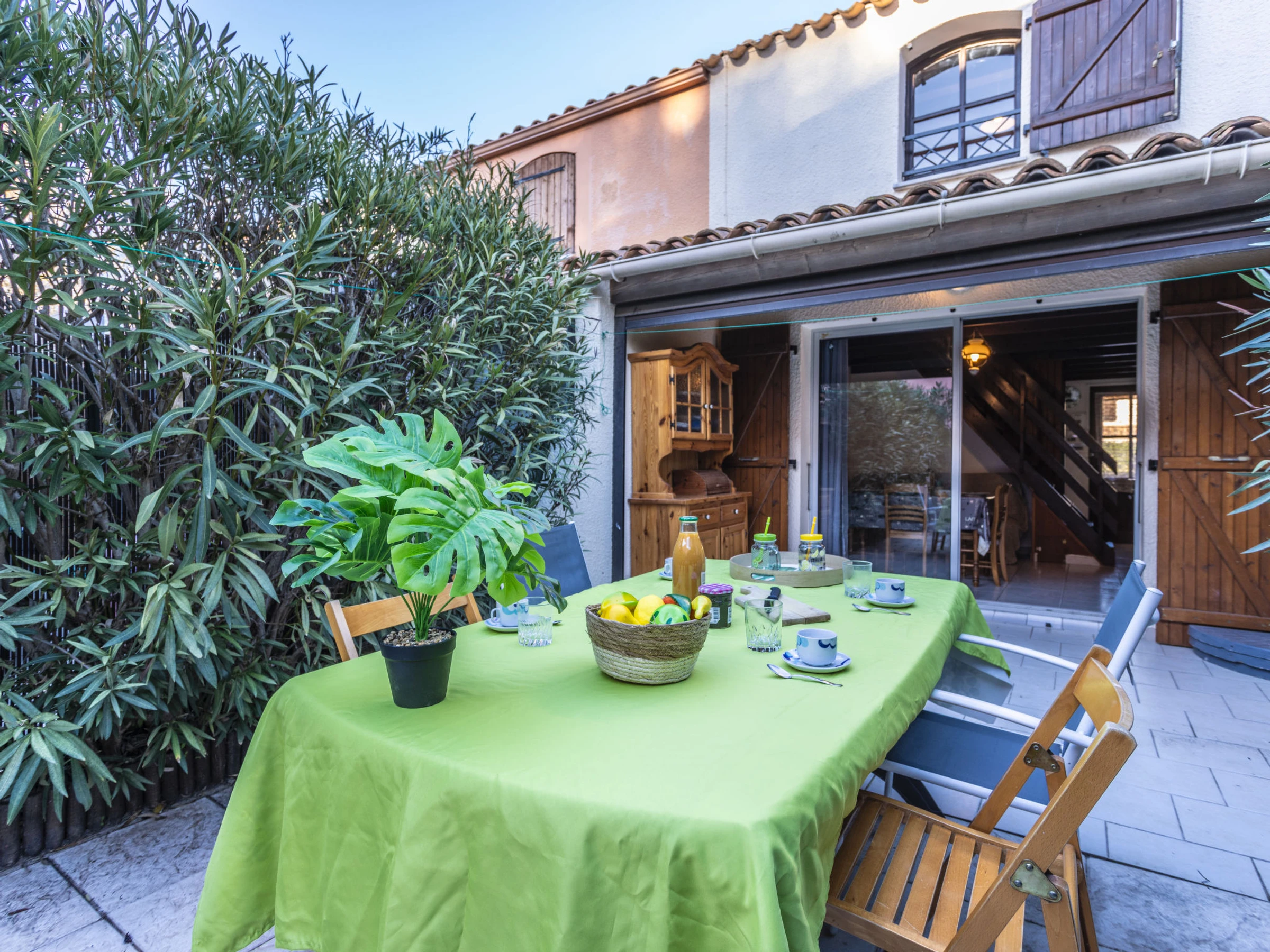 Maison mitoyenne 3 pièces 40 m2 sur 2 niveaux. Séjour/salle à manger avec TV (écran plat). Sortie sur la terrasse. Coin cuisine (lave-vaisselle, 4 plaques à induction, grille-pain, bouilloire électrique, micro-ondes, cafetière électrique). Douche/WC. À l'étage supérieur: 1 chambre avec 1 grand-lit (140 cm, longueur 190 cm). 1 chambre avec 2 lits (90 cm, longueur 190 cm). Terrasse 30 m2, situation sud-ouest. Meubles de terrasse. A disposition: lave-linge. Internet (Connexion WIFI, en sus). Place de parking No 10, hauteur 190 cm, largeur 215 cm. Veuillez noter: logement non-fumeur. Détecteur de fumée. Annonce d'un particulier (art 155, IV du CGI).