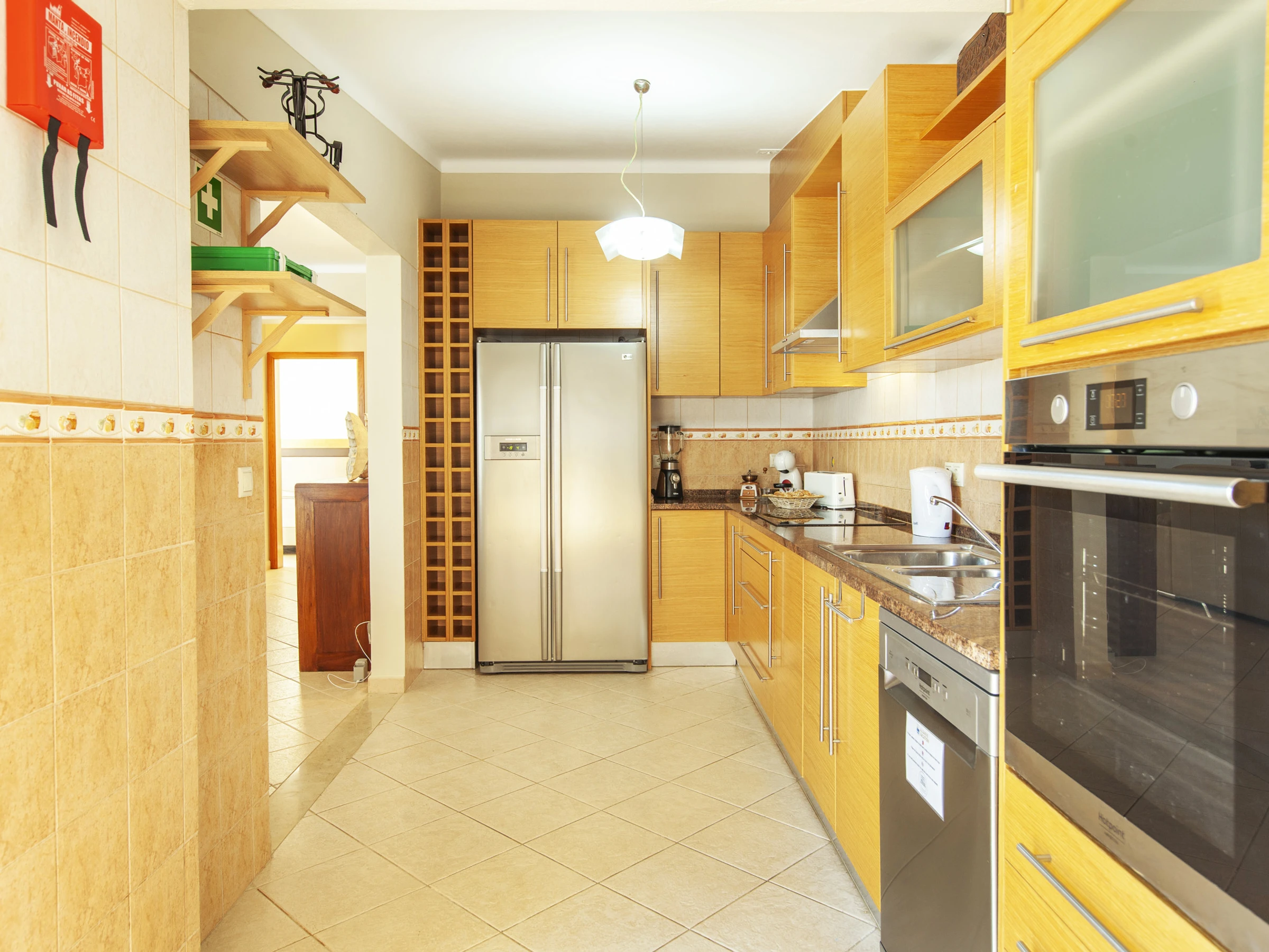 La cuisine est entièrement équipée, pratique et organisée, offrant un espace agréable pour préparer des repas en famille, avec un accès facile à la zone extérieure.