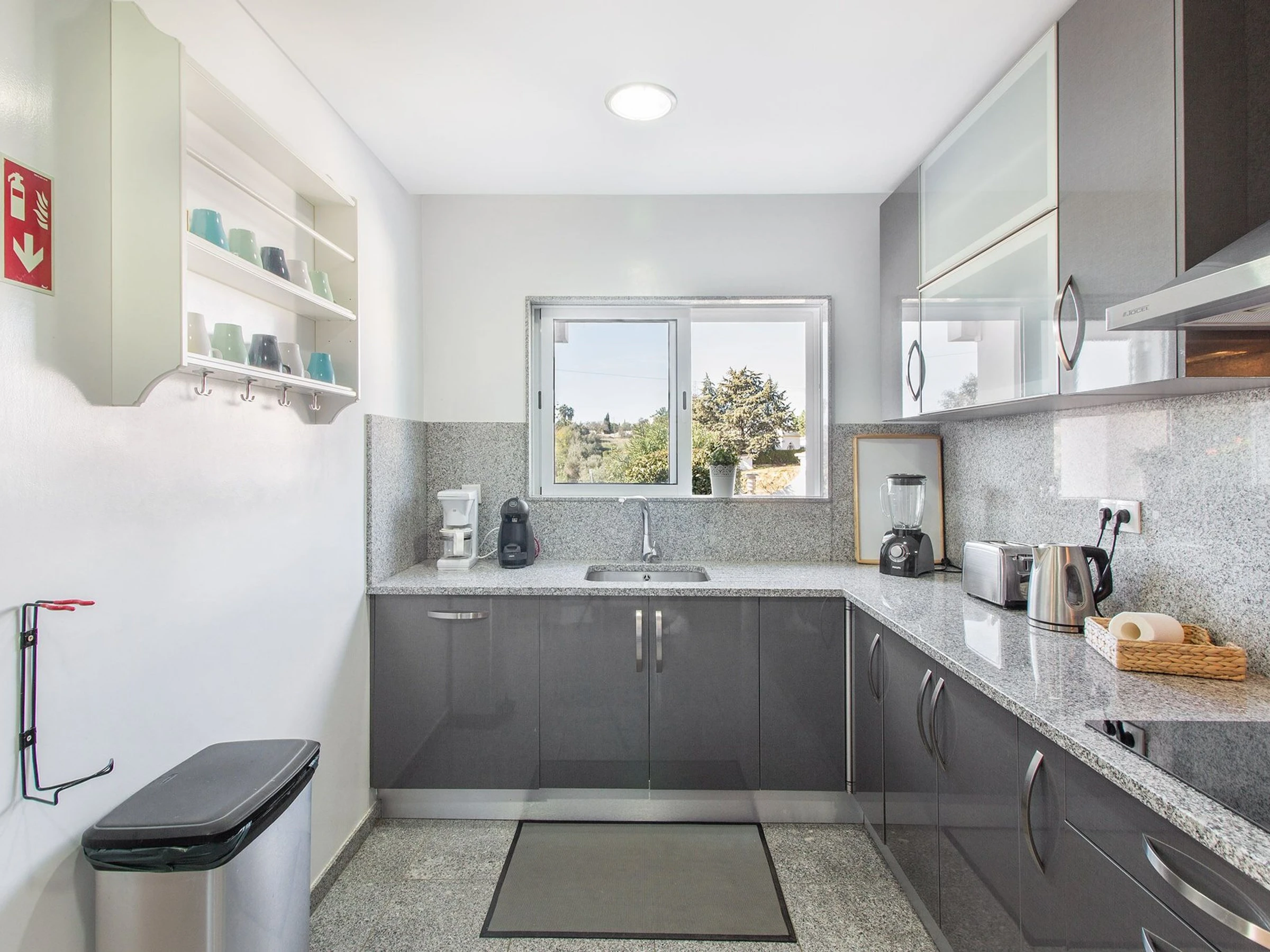 La cuisine, est équipée avec réfrigérateur, micro-ondes, four, lave-vaisselle, cafetière, grille pain et bouilloire.