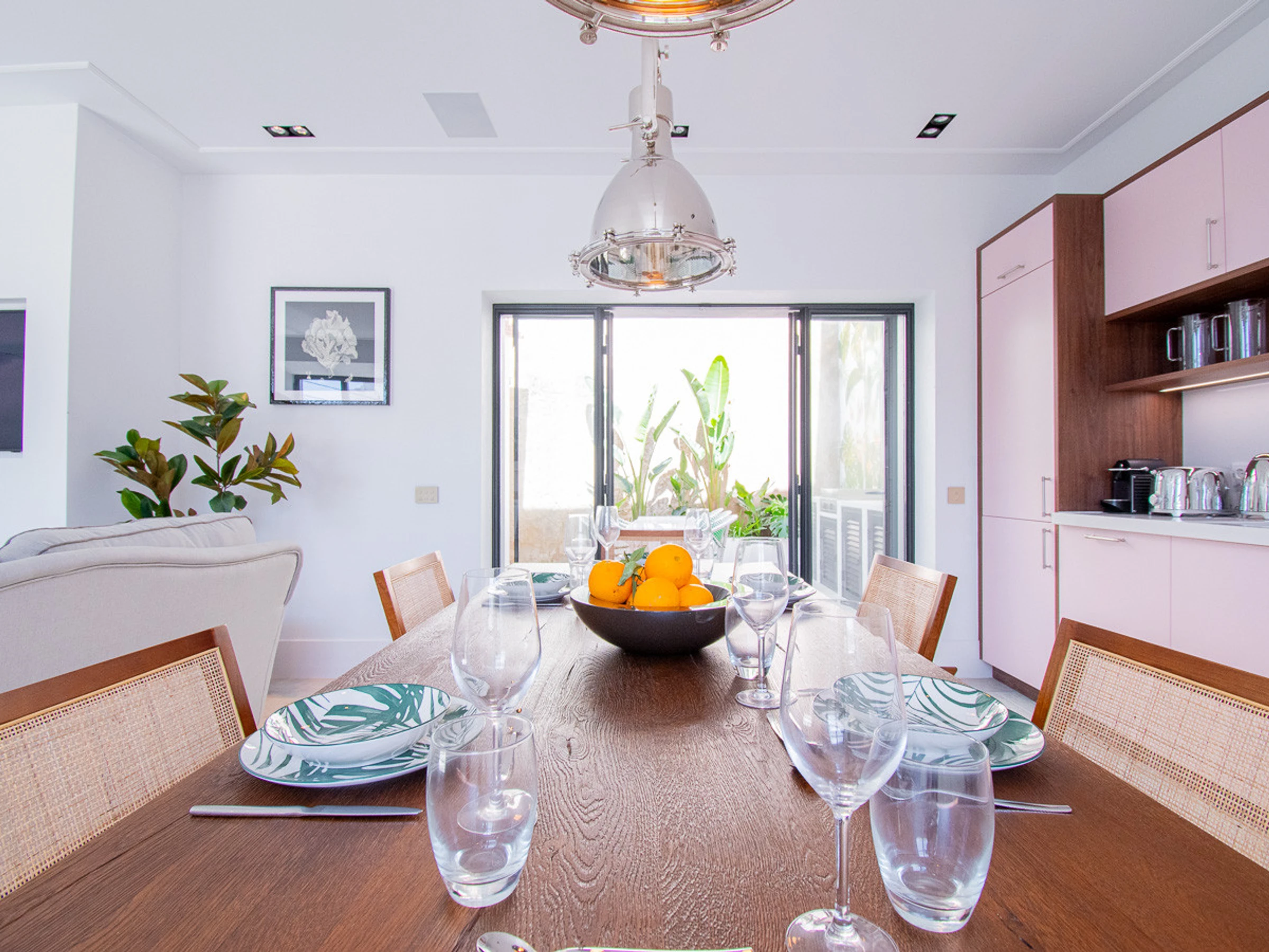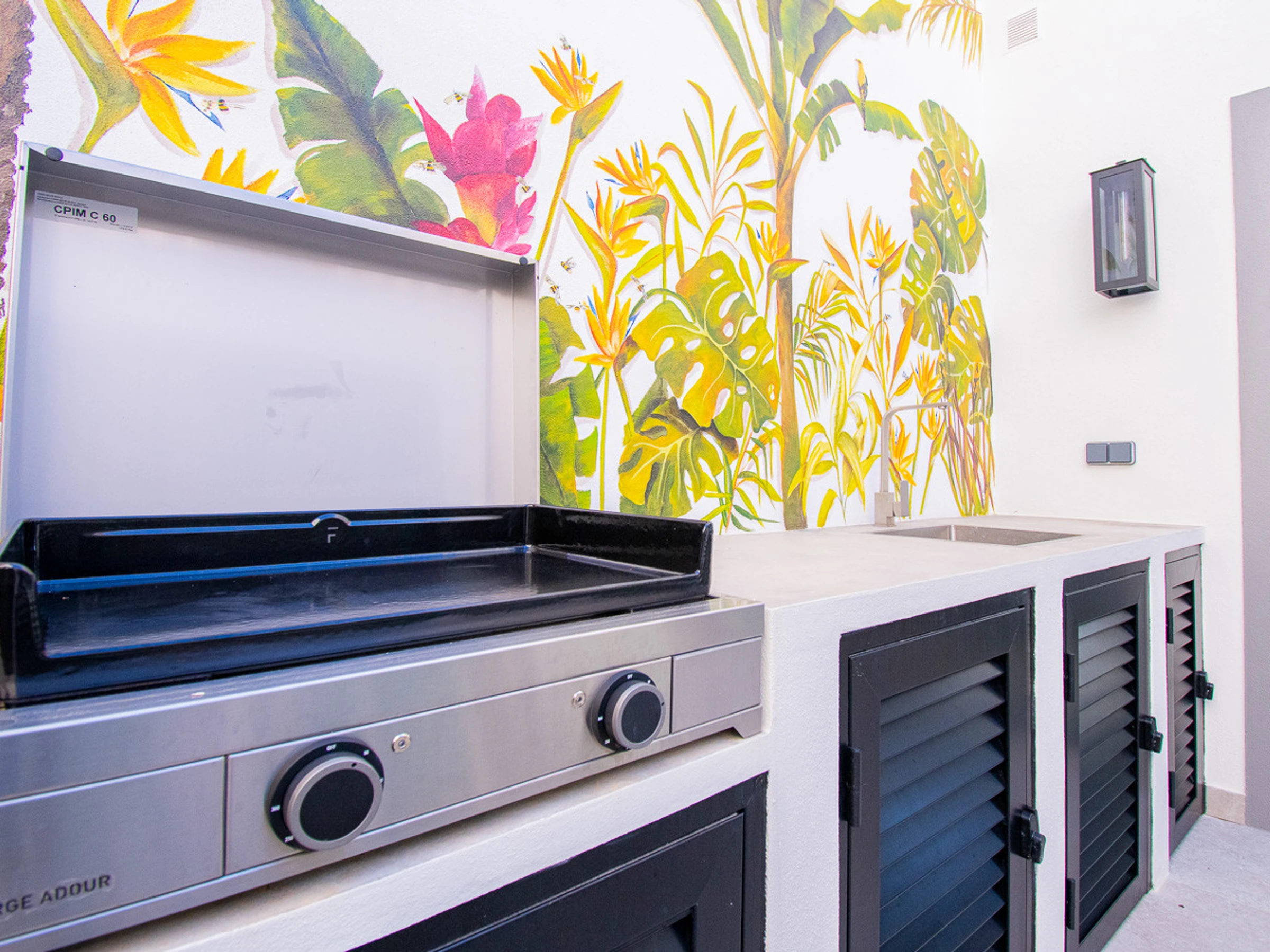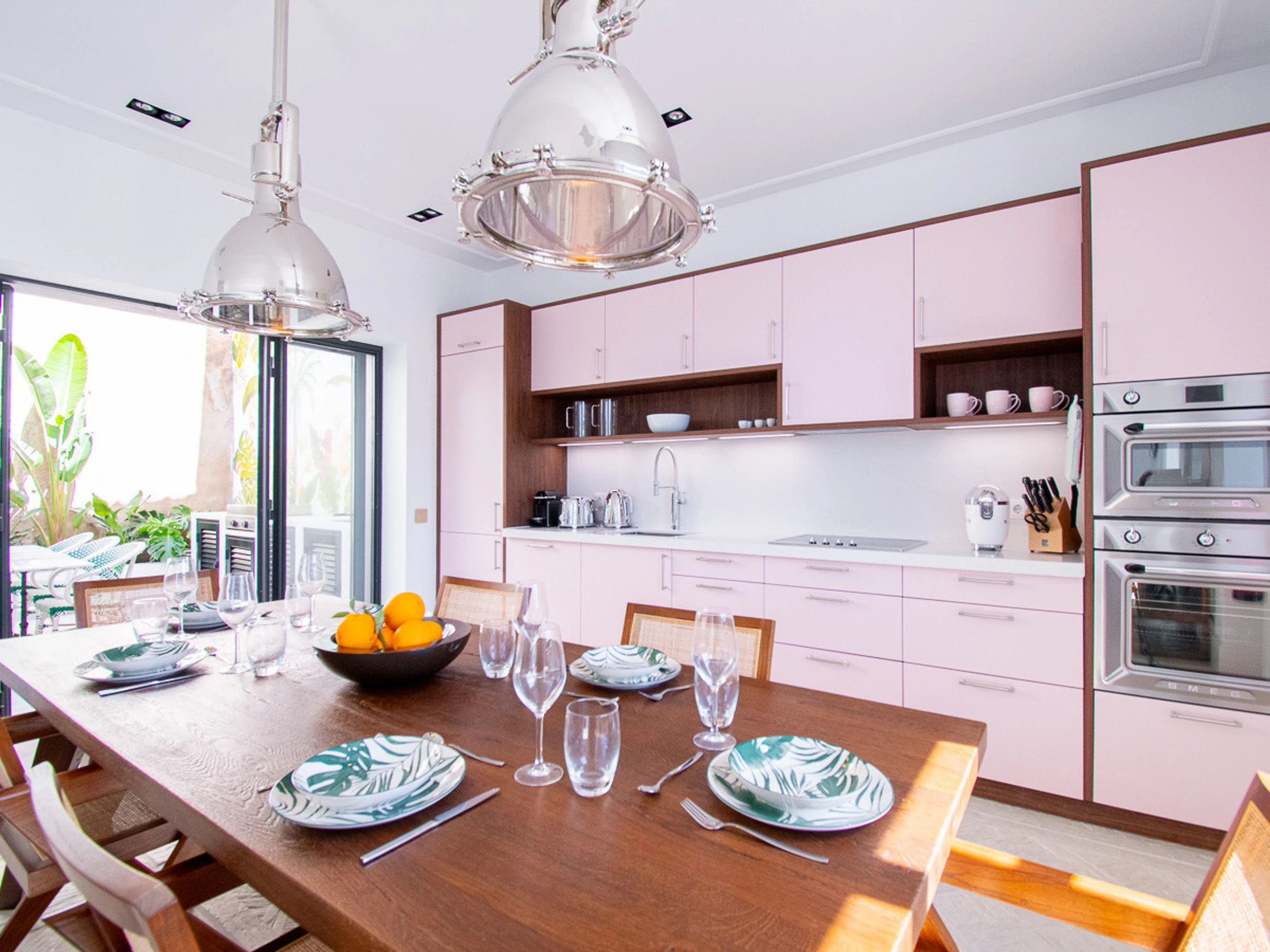 La cuisine américaine, à induction, est équipée avec réfrigérateur, micro-ondes, four, congélateur, lave-vaisselle, vaisselle/couverts, ustensiles/cuisine, cafetière, grille pain, bouilloire et presse-agrumes.