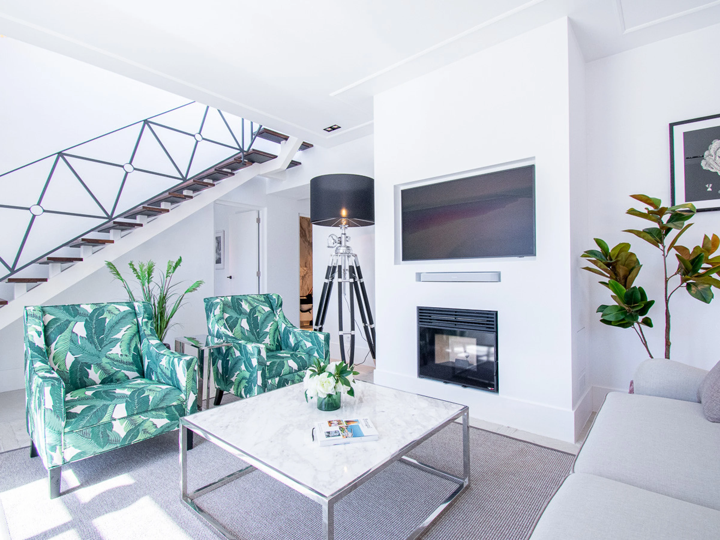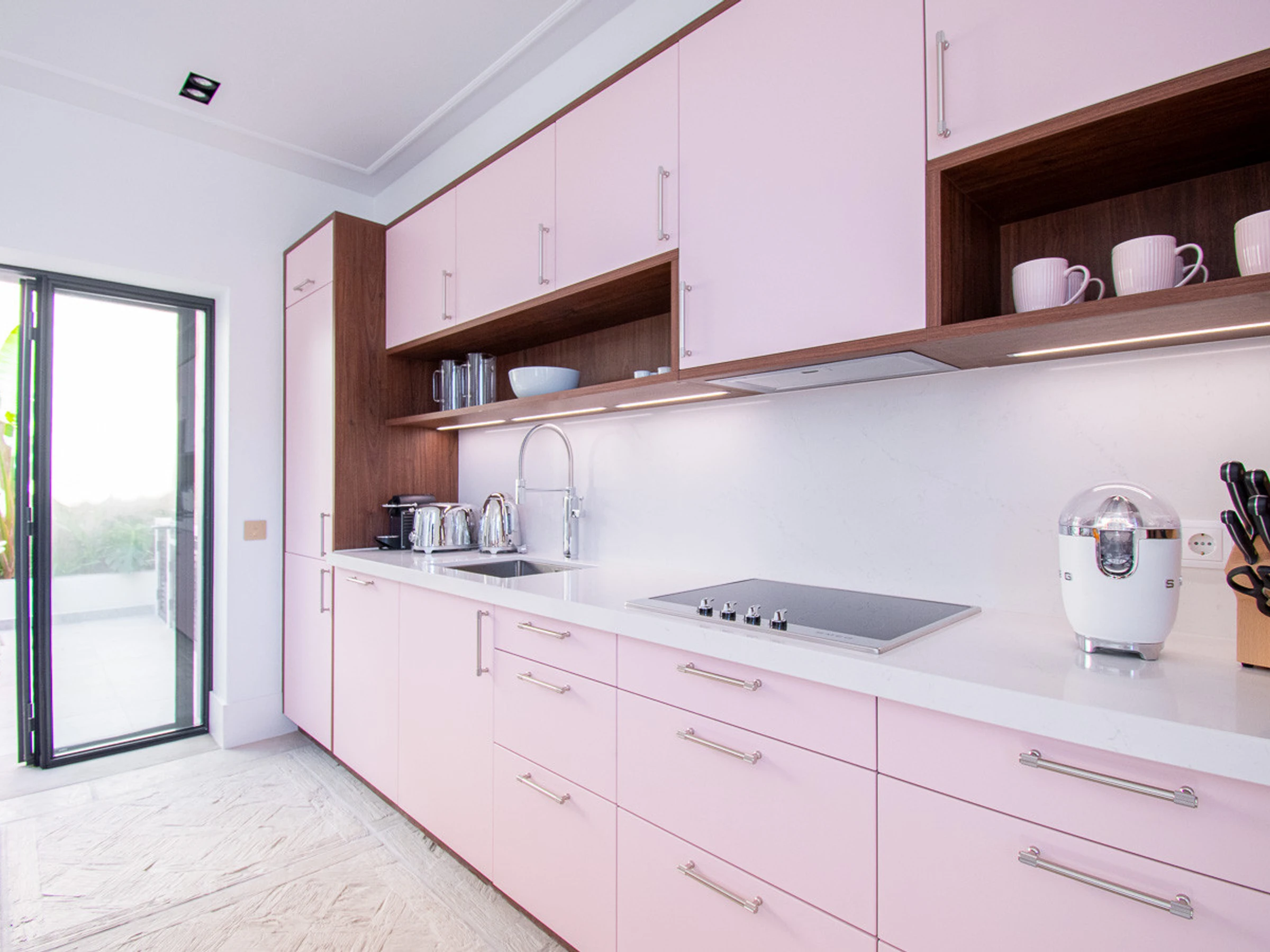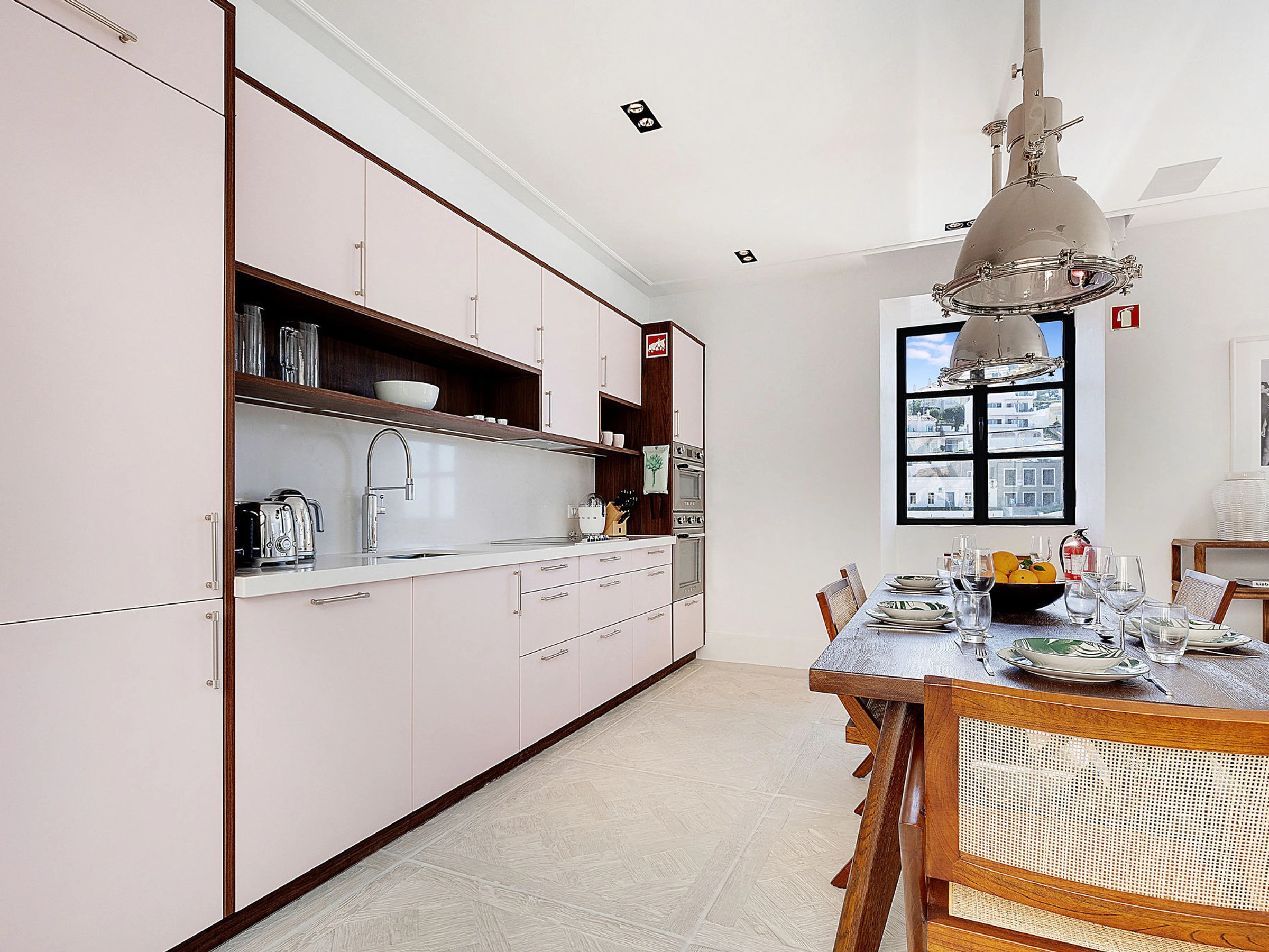 La cuisine américaine, à induction, est équipée avec réfrigérateur, micro-ondes, four, congélateur, lave-vaisselle, vaisselle/couverts, ustensiles/cuisine, cafetière, grille pain, bouilloire et presse-agrumes.