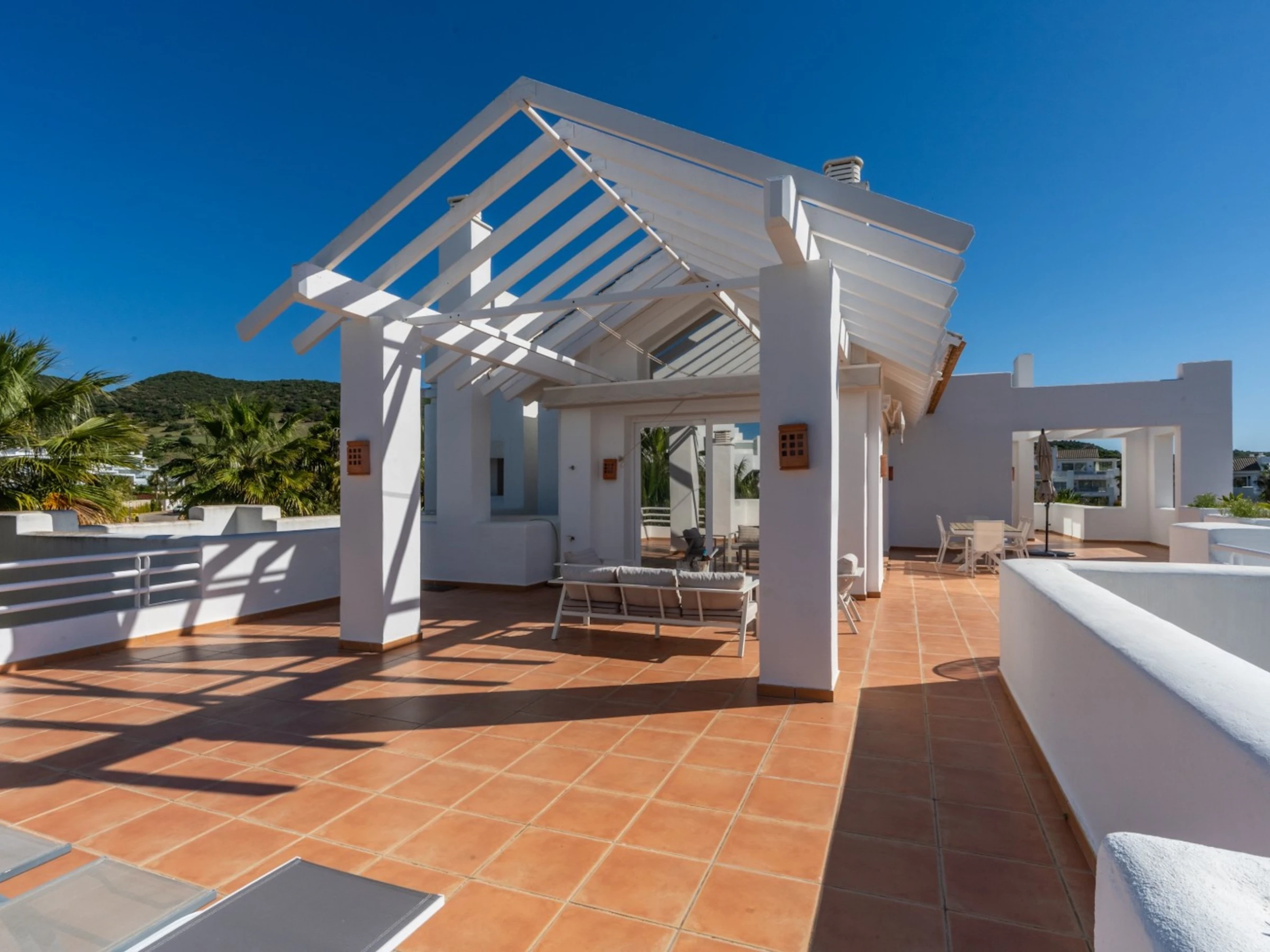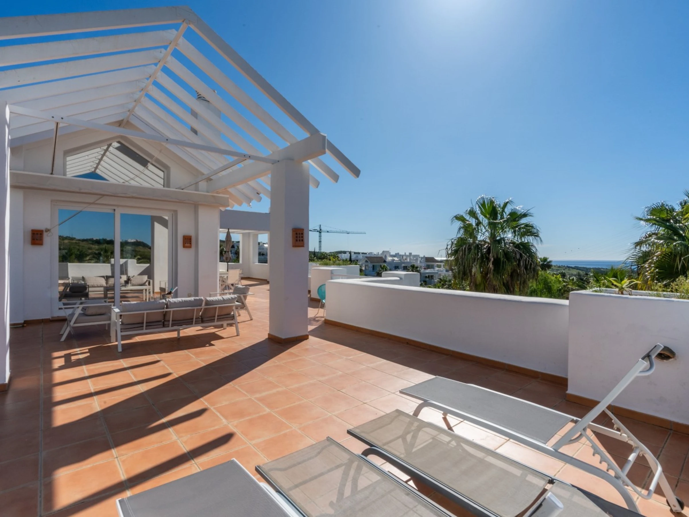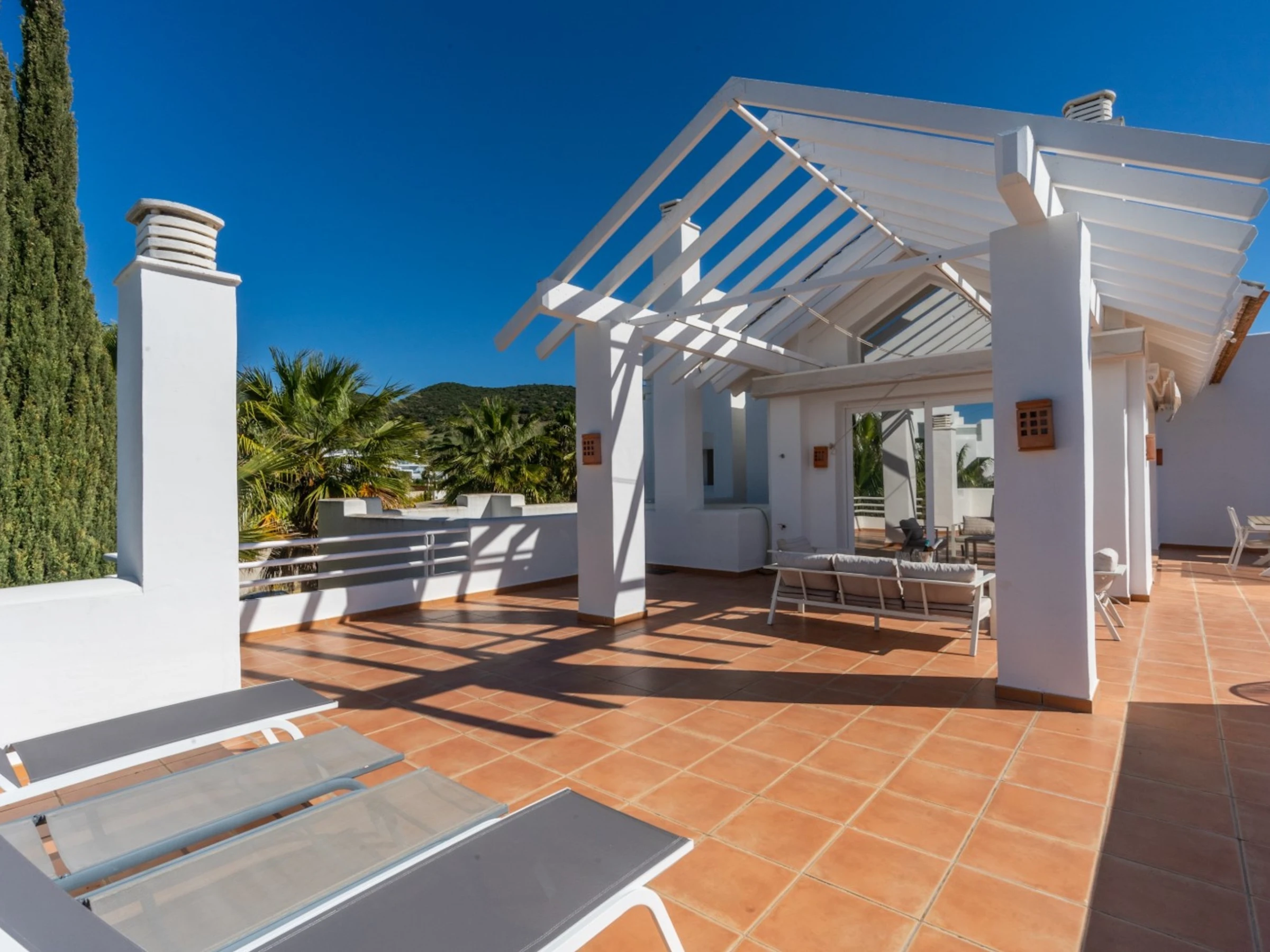•Terrasse gigantesque avec salon, salle à manger et chaises longues