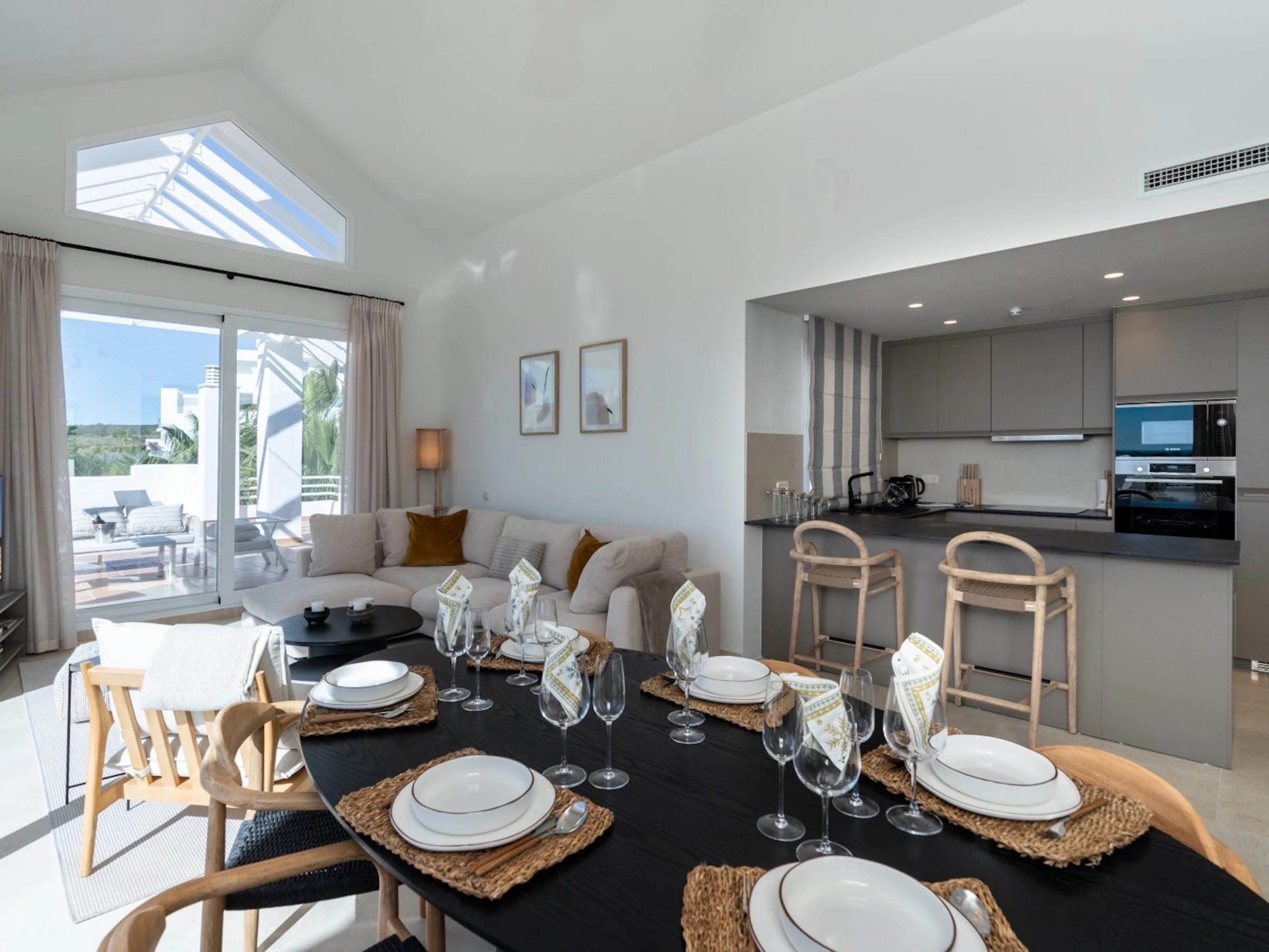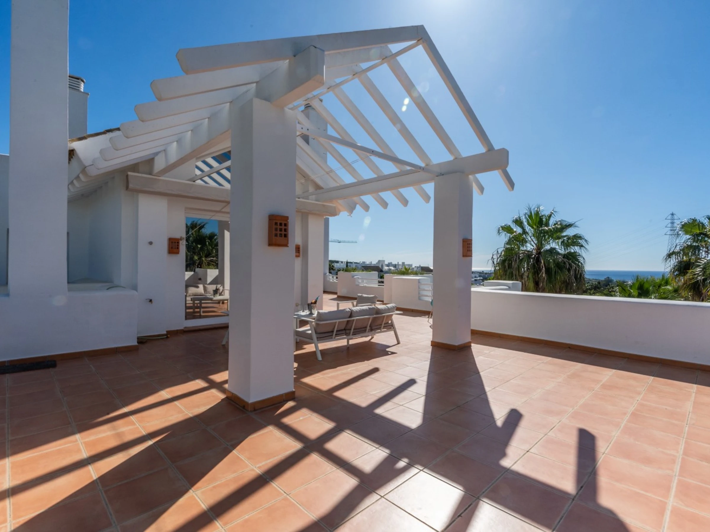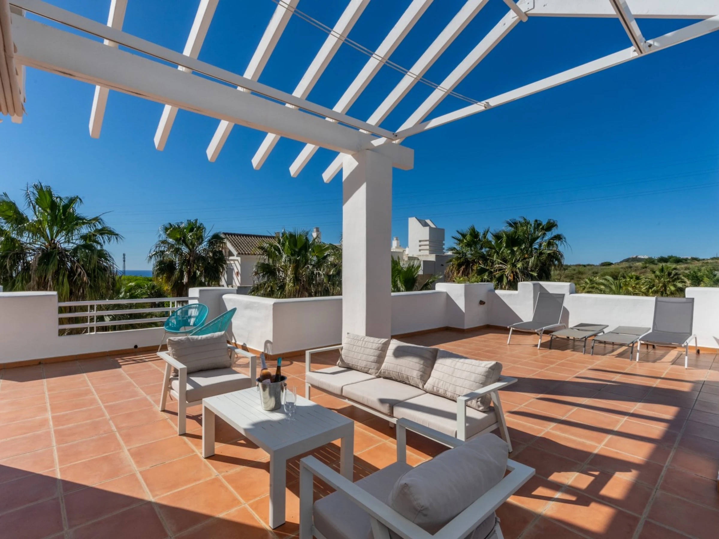•Terrasse gigantesque avec salon, salle à manger et chaises longues