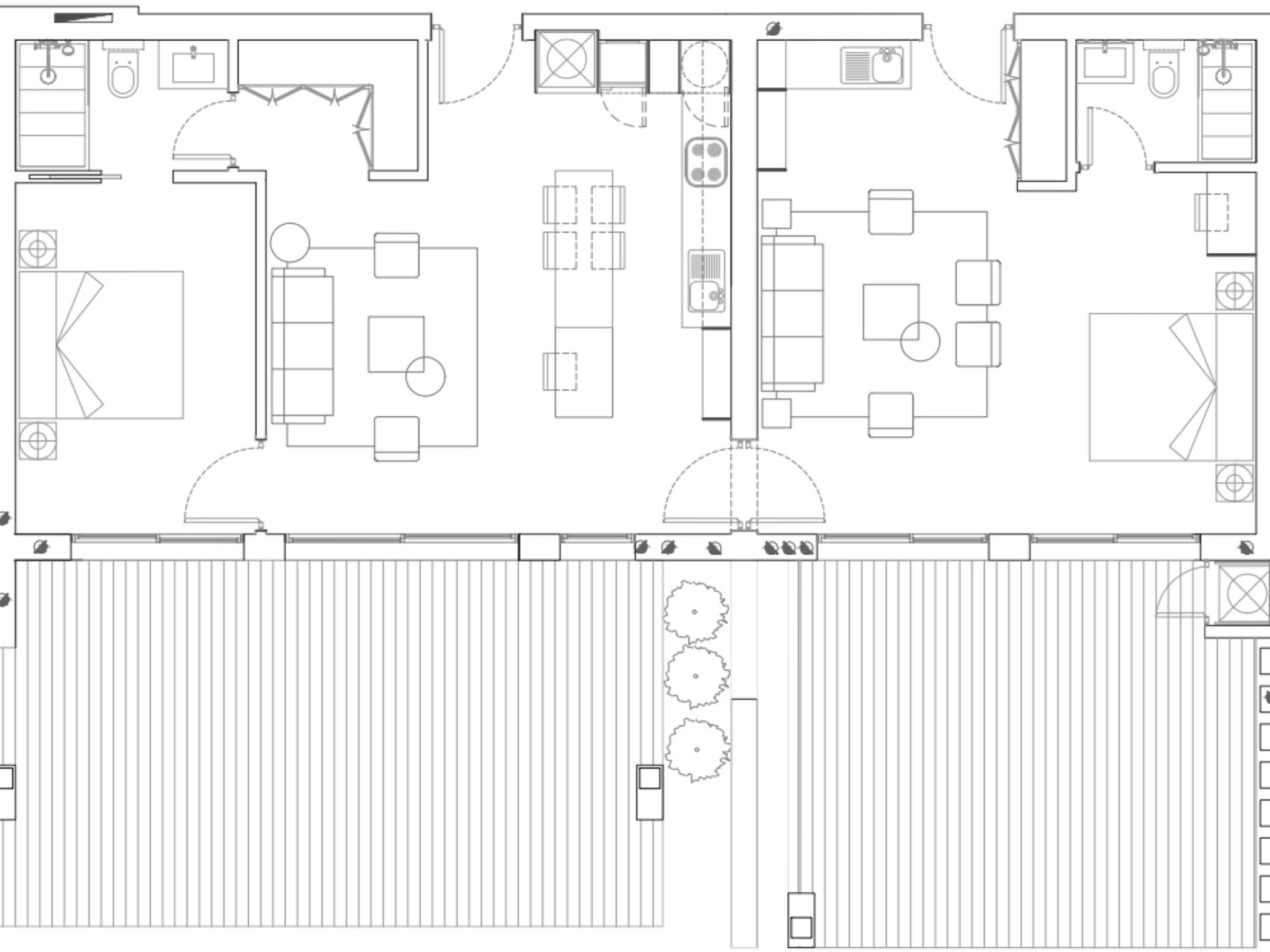 Cet appartement moderne, entièrement équipé, offre confort, intimité et un accès direct aux équipements de resort premium. Deux appartements d'une chambre séparés par une porte. Pratique pour 2 couples ou une famille avec enfants.