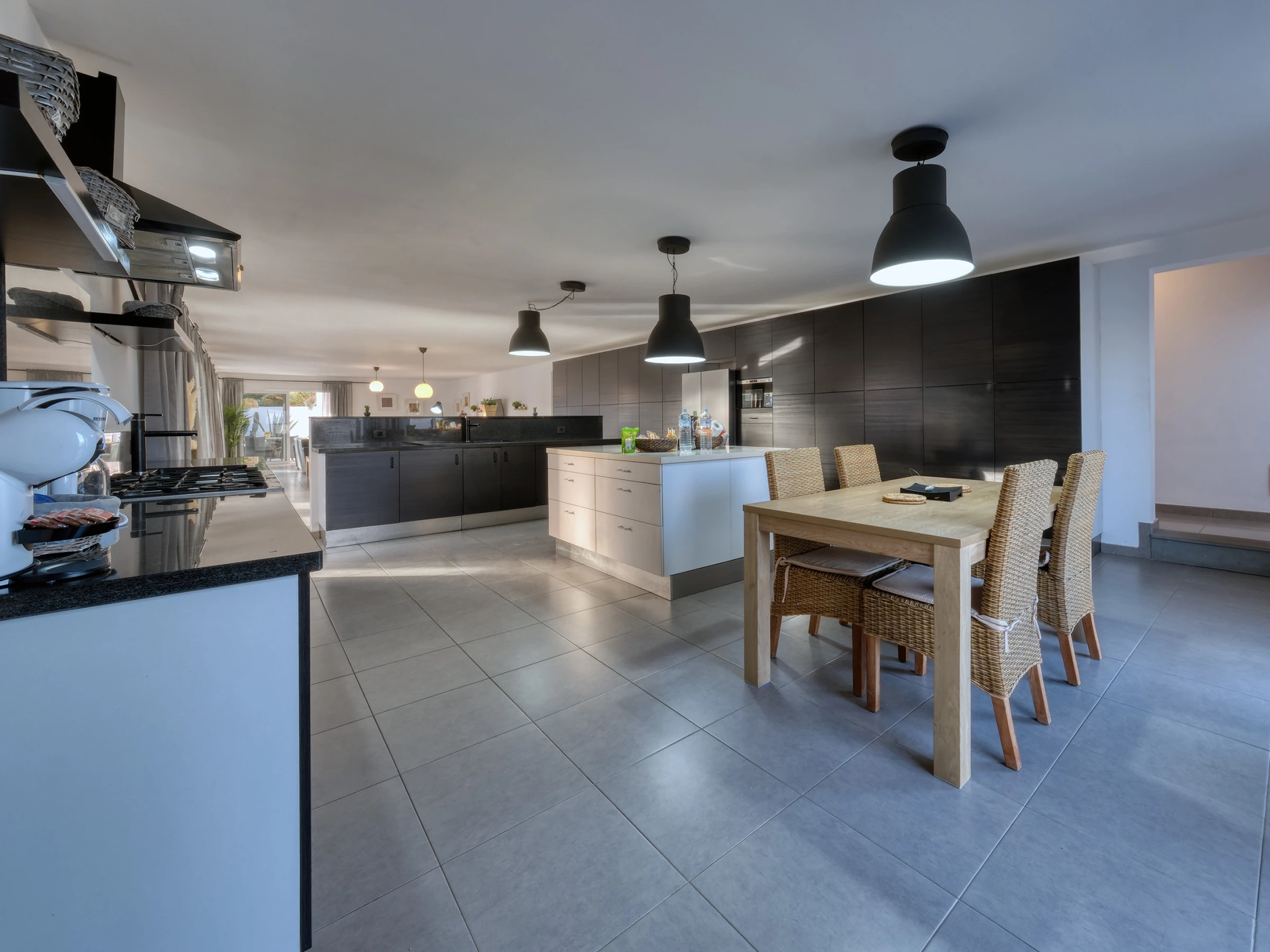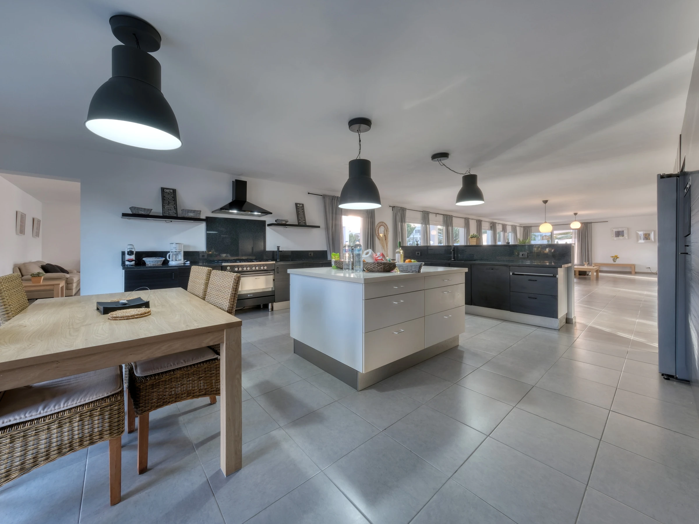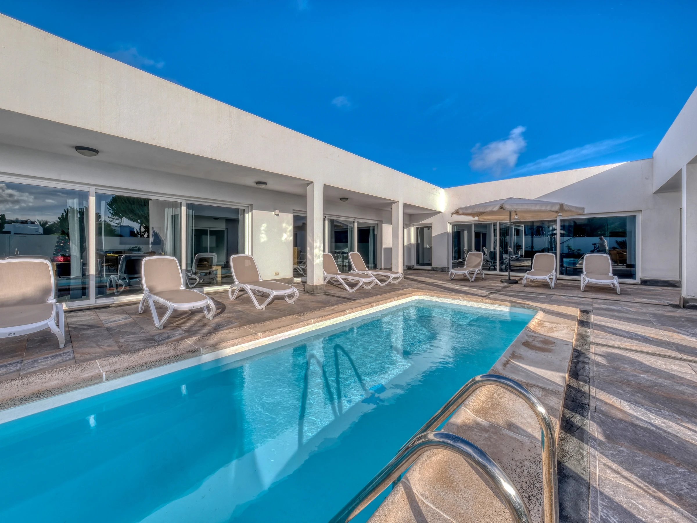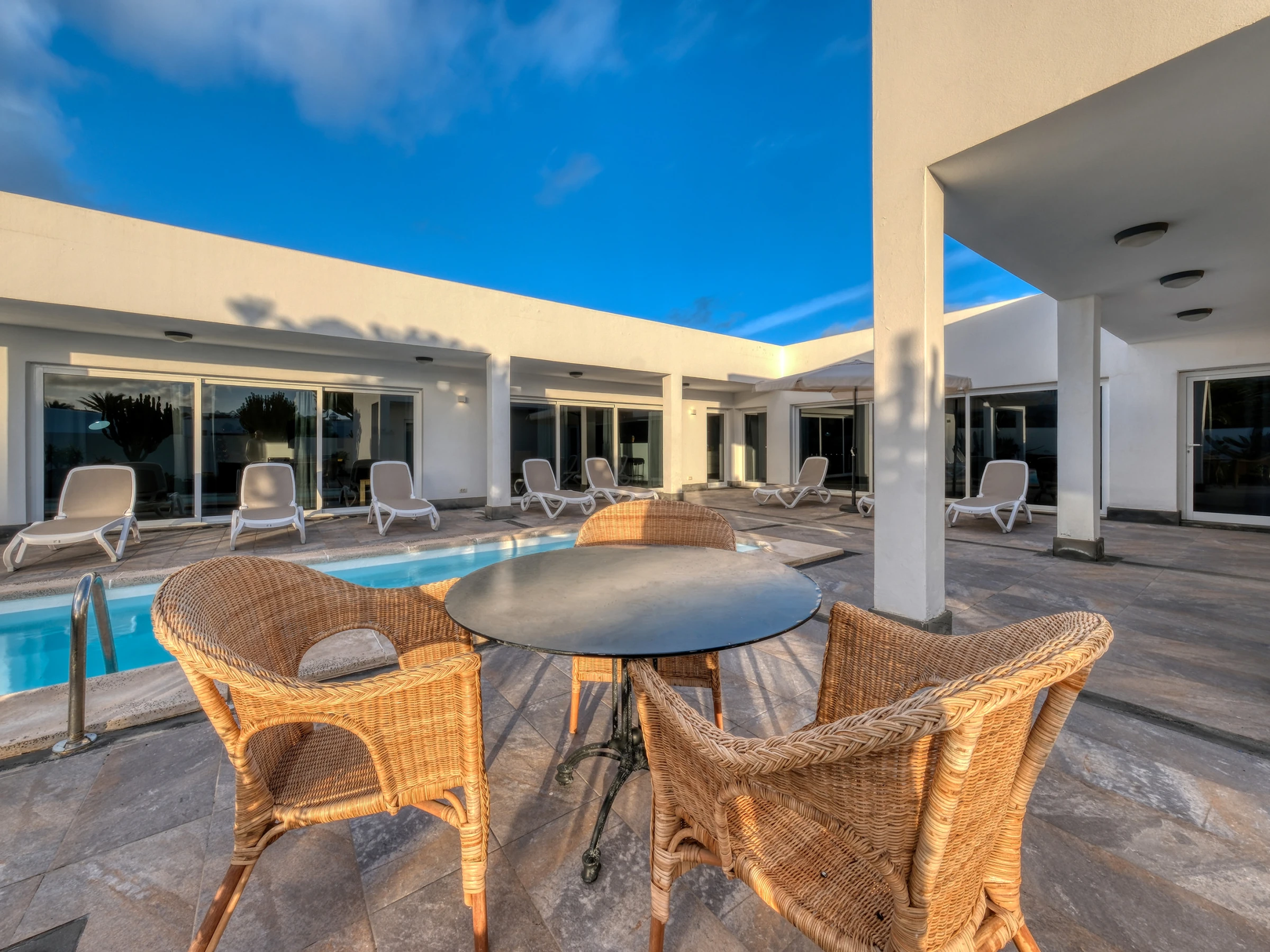 La conception ouverte intègre une cuisine moderne entièrement équipée —lave-vaisselle, four, micro-ondes, cafetière, grille-pain, bouilloire et tous les ustensiles nécessaires— avec la salle à manger et un grand salon. Cet espace s'ouvre sur l'extérieur à travers de grandes baies vitrées, offrant un accès direct à la piscine privée, entourée de chaises longues, parfaite pour profiter du soleil de Lanzarote toute l'année.