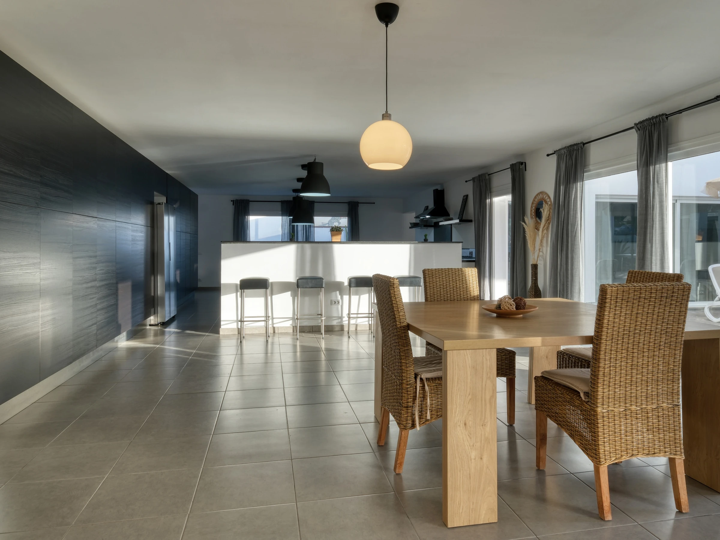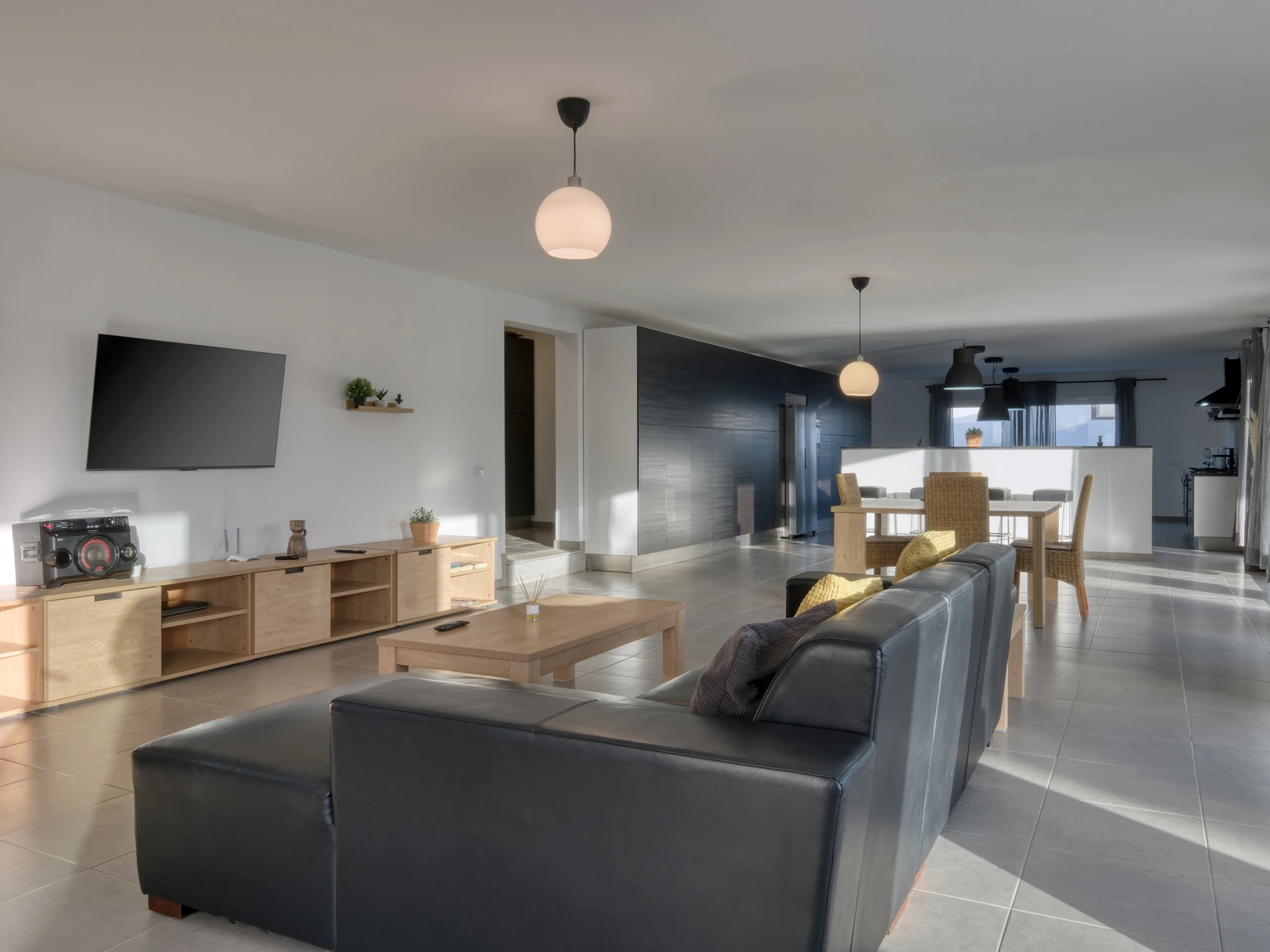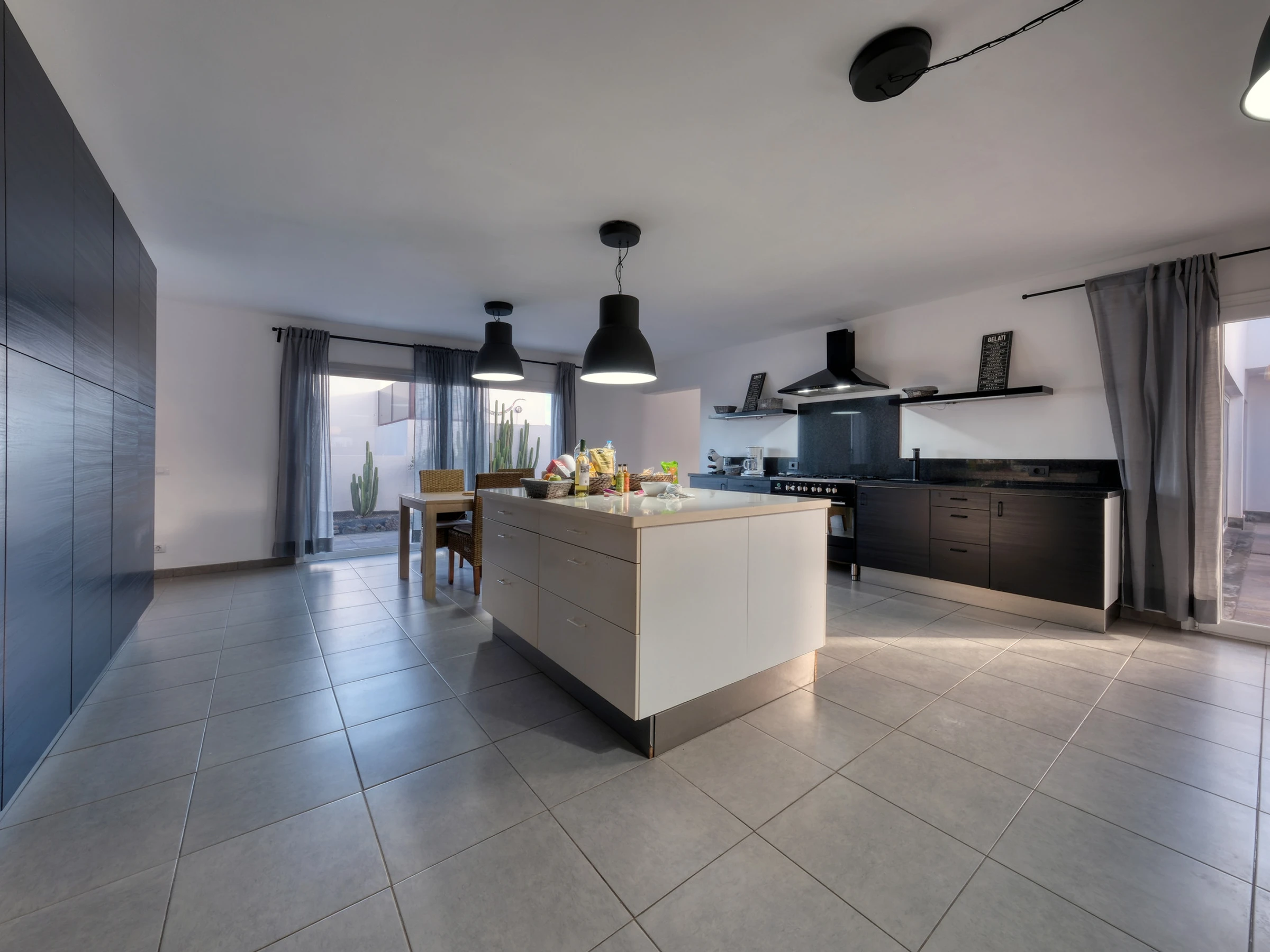 La conception ouverte intègre une cuisine moderne entièrement équipée —lave-vaisselle, four, micro-ondes, cafetière, grille-pain, bouilloire et tous les ustensiles nécessaires— avec la salle à manger et un grand salon. Cet espace s'ouvre sur l'extérieur à travers de grandes baies vitrées, offrant un accès direct à la piscine privée, entourée de chaises longues, parfaite pour profiter du soleil de Lanzarote toute l'année.
