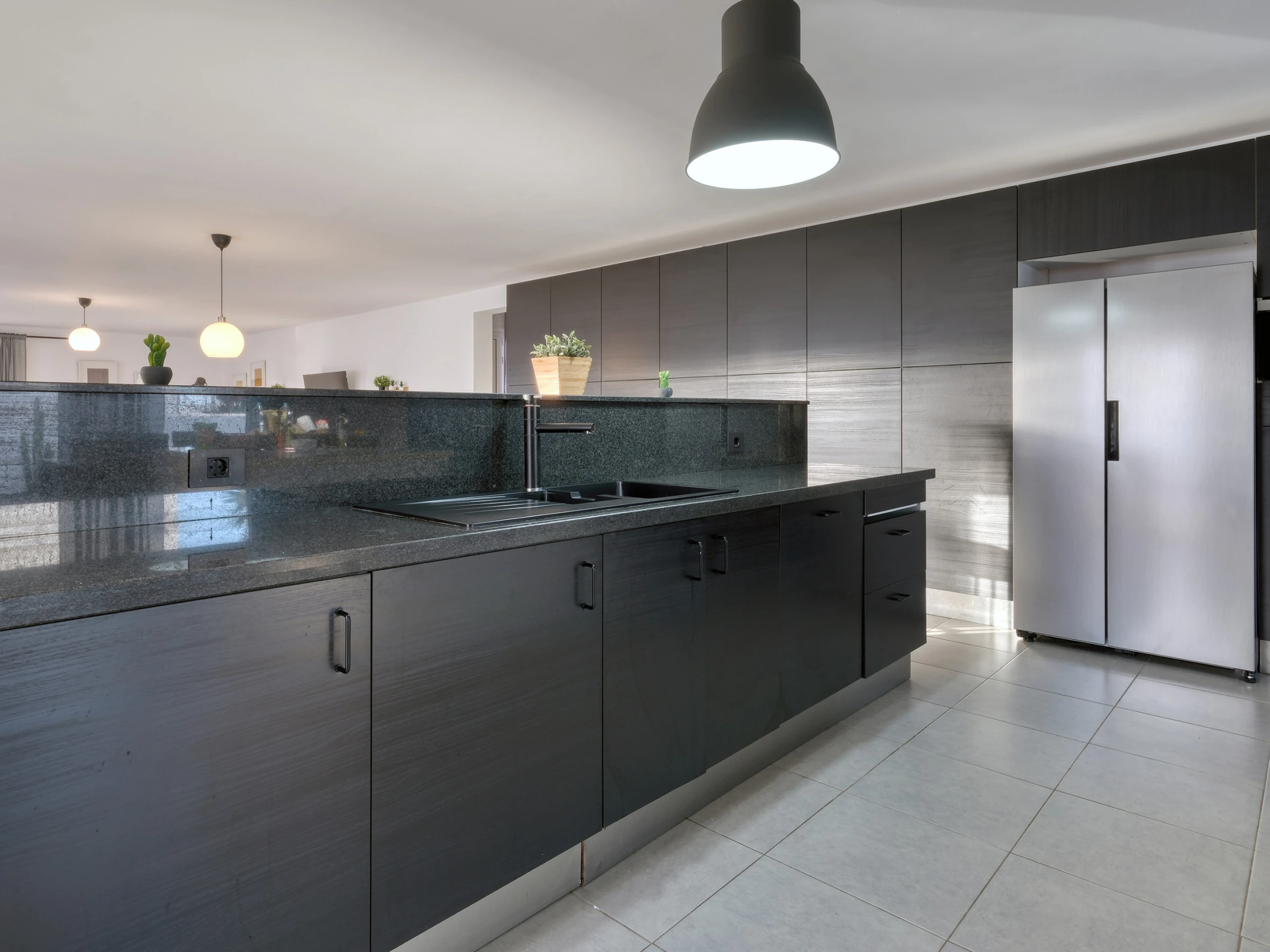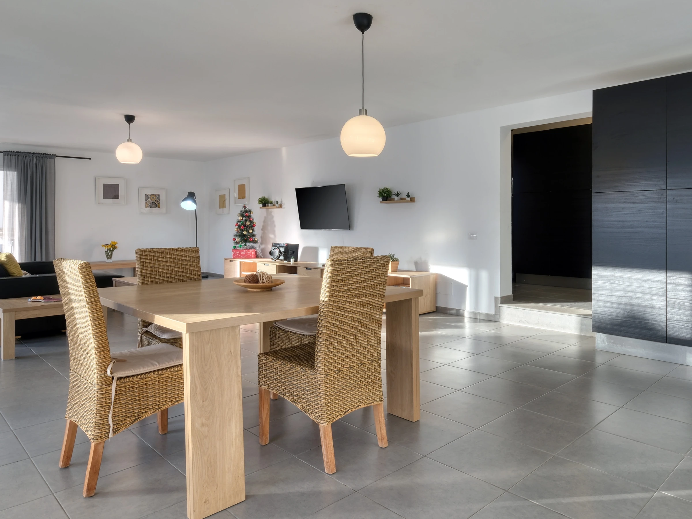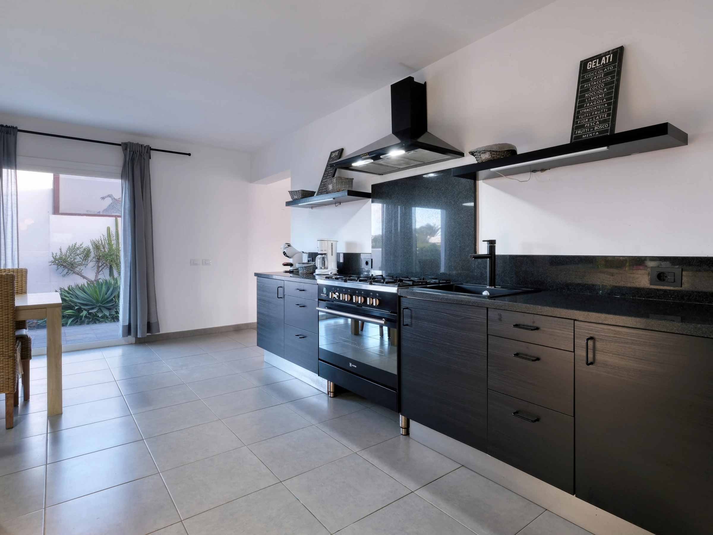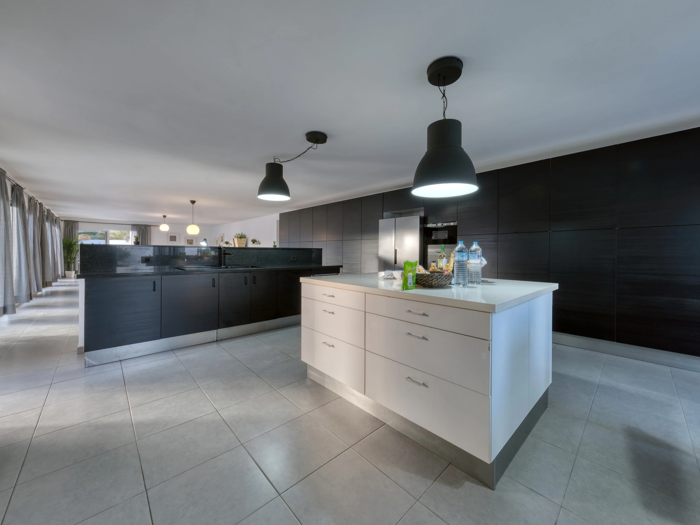 La conception ouverte intègre une cuisine moderne entièrement équipée —lave-vaisselle, four, micro-ondes, cafetière, grille-pain, bouilloire et tous les ustensiles nécessaires— avec la salle à manger et un grand salon. Cet espace s'ouvre sur l'extérieur à travers de grandes baies vitrées, offrant un accès direct à la piscine privée, entourée de chaises longues, parfaite pour profiter du soleil de Lanzarote toute l'année.