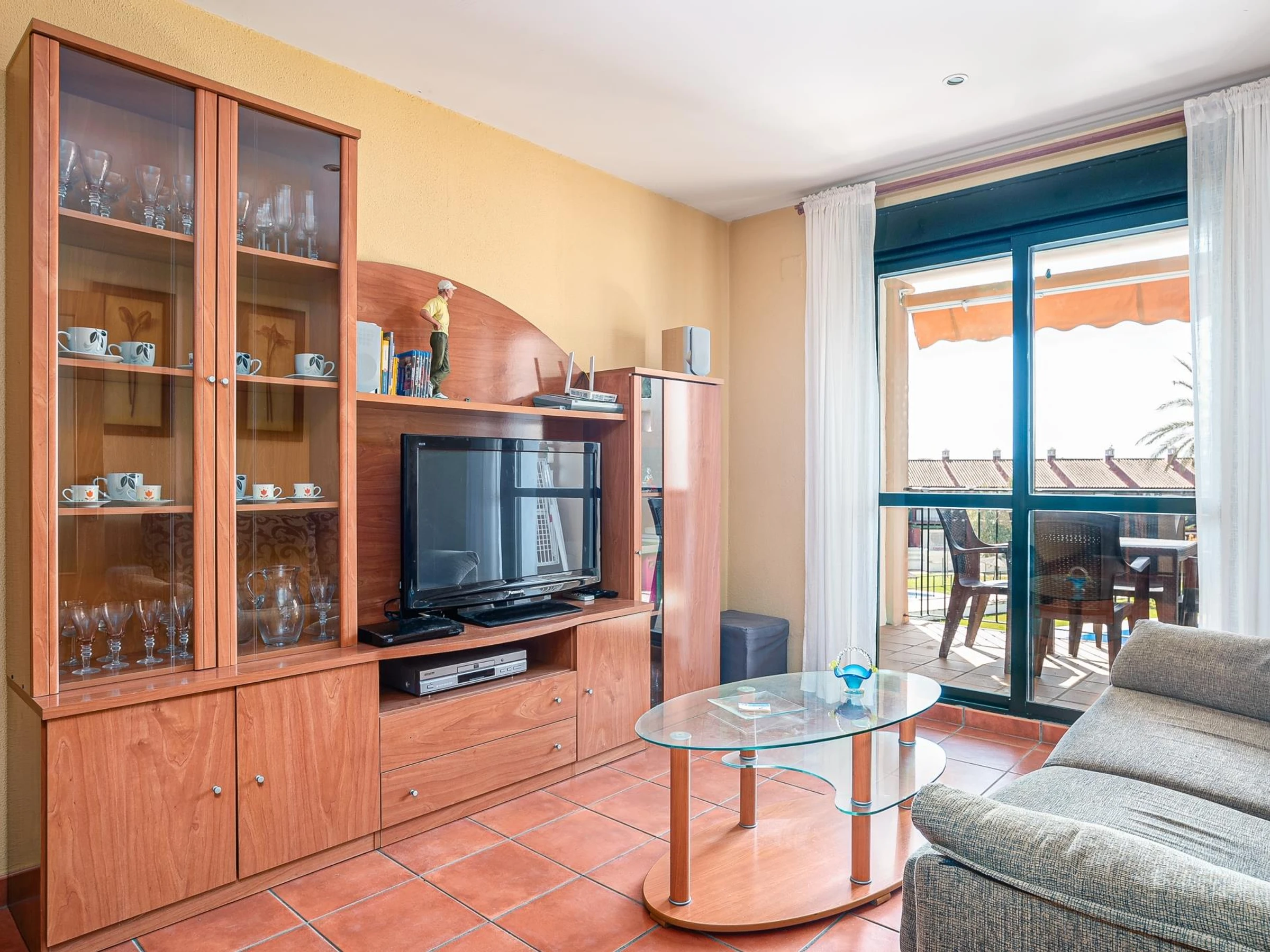 La salle de bain, conçue pour le confort et la fonctionnalité, est entièrement équipée et invite à la détente. La cuisine, située de manière indépendante, est non seulement équipée de tous les appareils nécessaires, mais offre également un environnement fonctionnel où n'importe quel repas peut être facilement préparé. Le cœur de l'appartement est le spacieux salon-salle à manger, un lieu où la lumière naturelle inonde chaque recoin. Cette chambre dispose de la climatisation et d'un accès direct à une magnifique terrasse. La terrasse, équipée de mobilier d'extérieur, permet non seulement de profiter du climat exceptionnel de la région mais offre également une vue panoramique sur les jardins et les piscines du complexe résidentiel. Que vous appréciiez le petit-déjeuner dans la sérénité du matin, que vous déjeunions sous le soleil, que vous dîniez en plein air ou que vous profitiez simplement du coucher de soleil avec un verre, cet espace devient l'endroit idéal pour vivre de beaux moments.