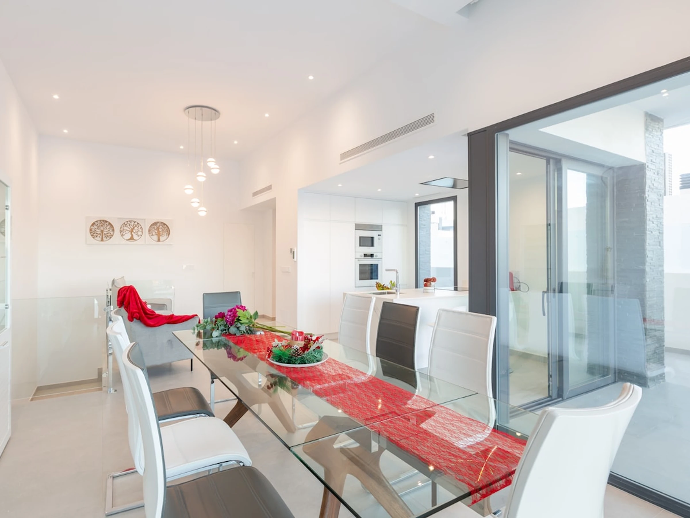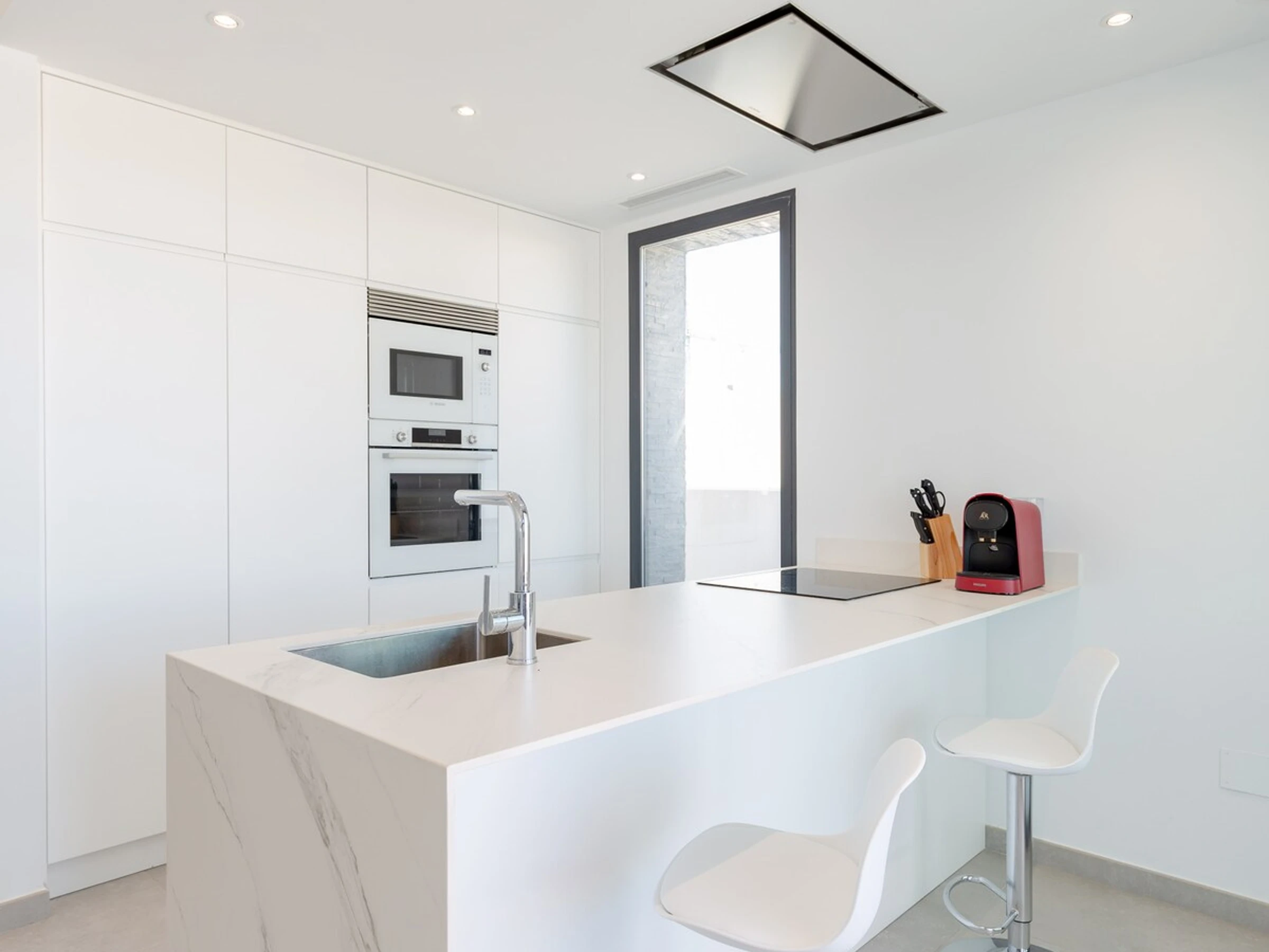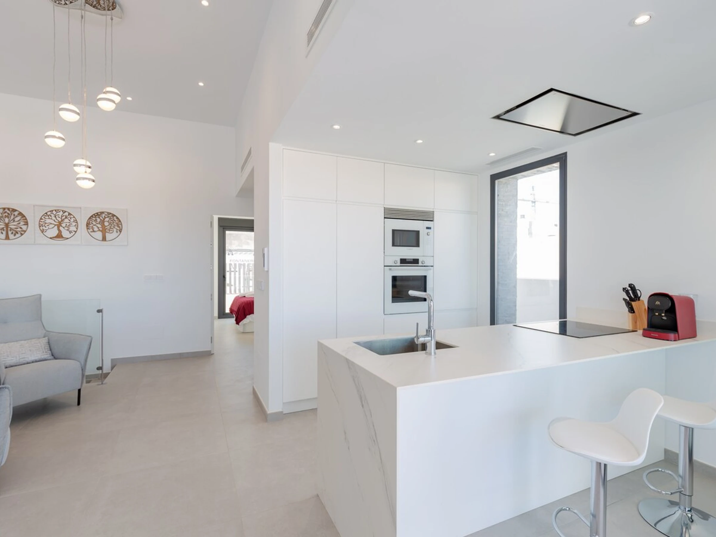 La cuisine, est équipée avec réfrigérateur, micro-ondes, four, congélateur, lave-vaisselle, cafetière et grille pain.
