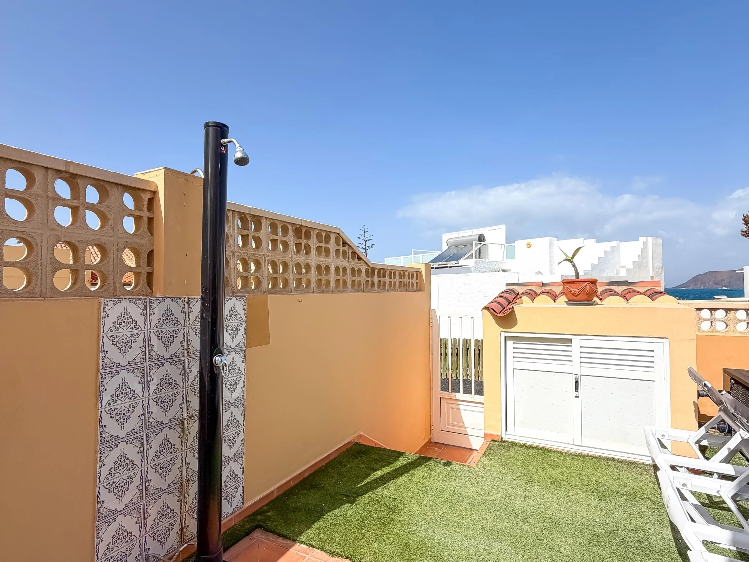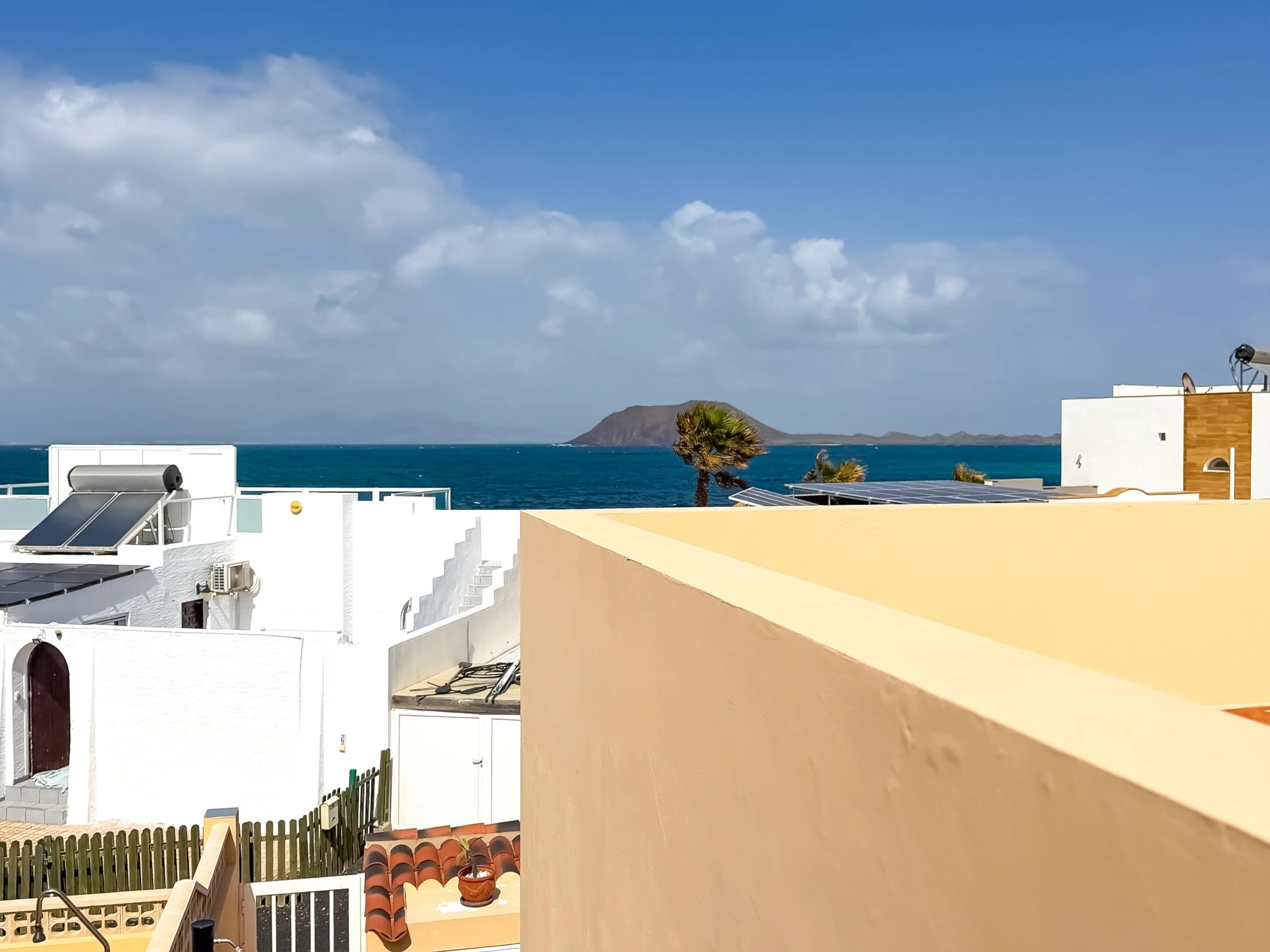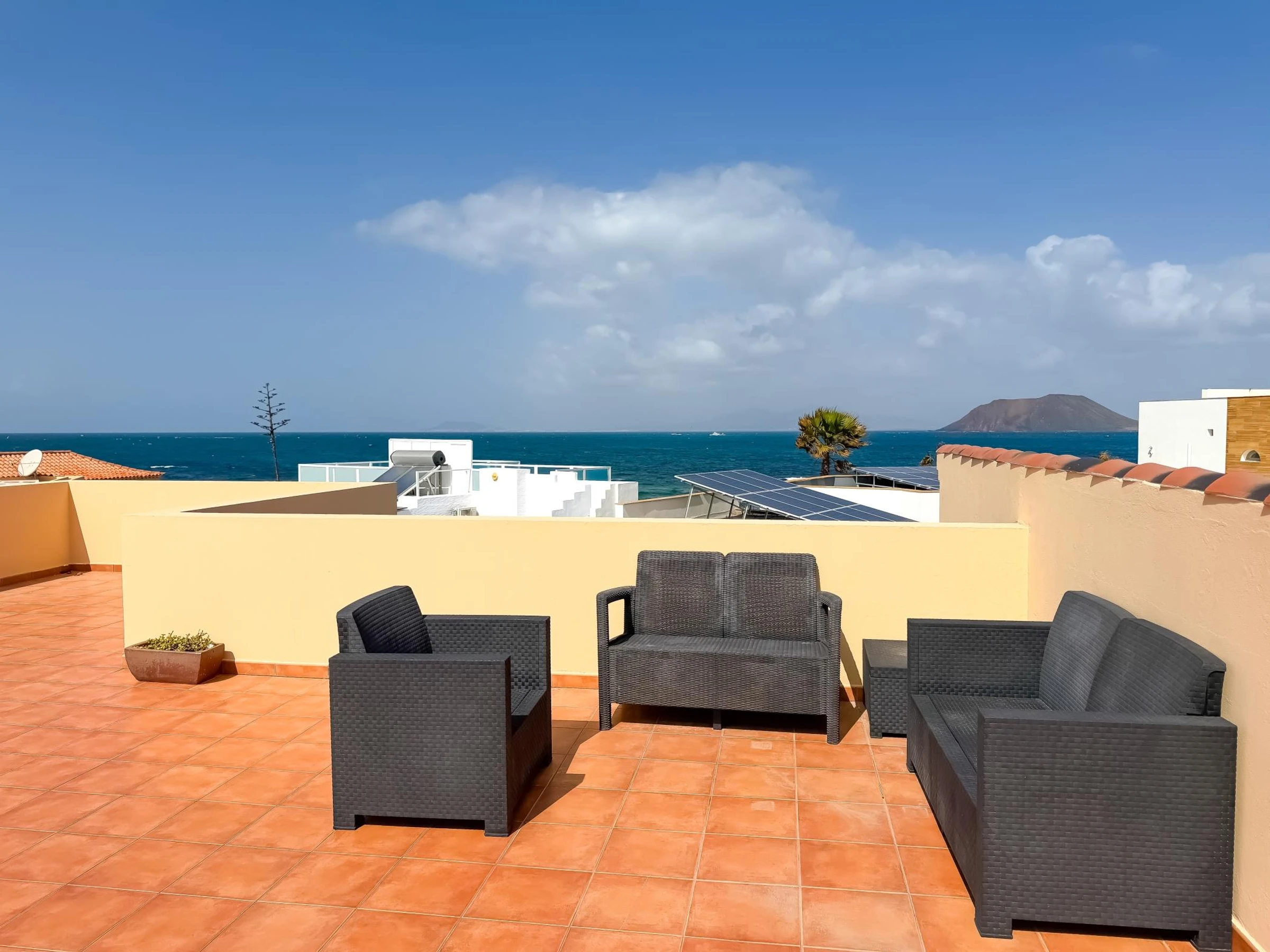 Terrasse panoramique avec vue sur la mer et sur l’île de Lobos, idéale pour les couchers de soleil et les moments de détente.