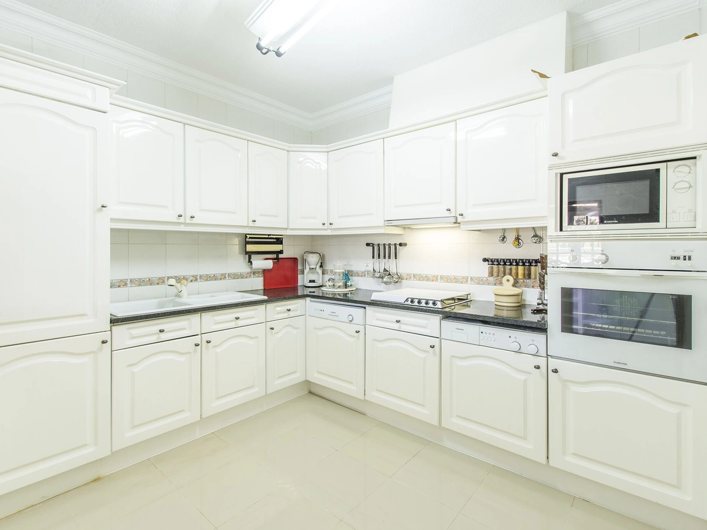 La cuisine, est équipée avec réfrigérateur, micro-ondes, four, lave-vaisselle, cafetière, grille pain et bouilloire.