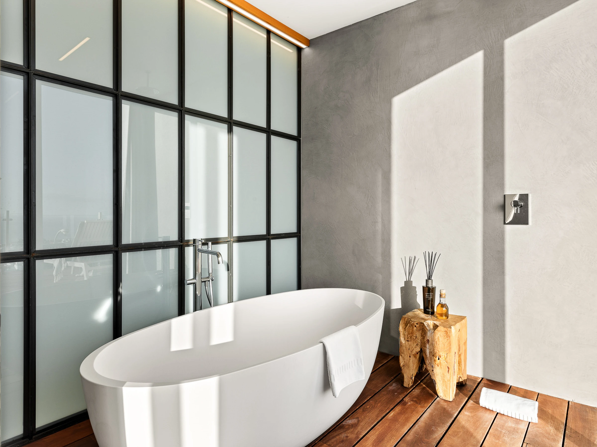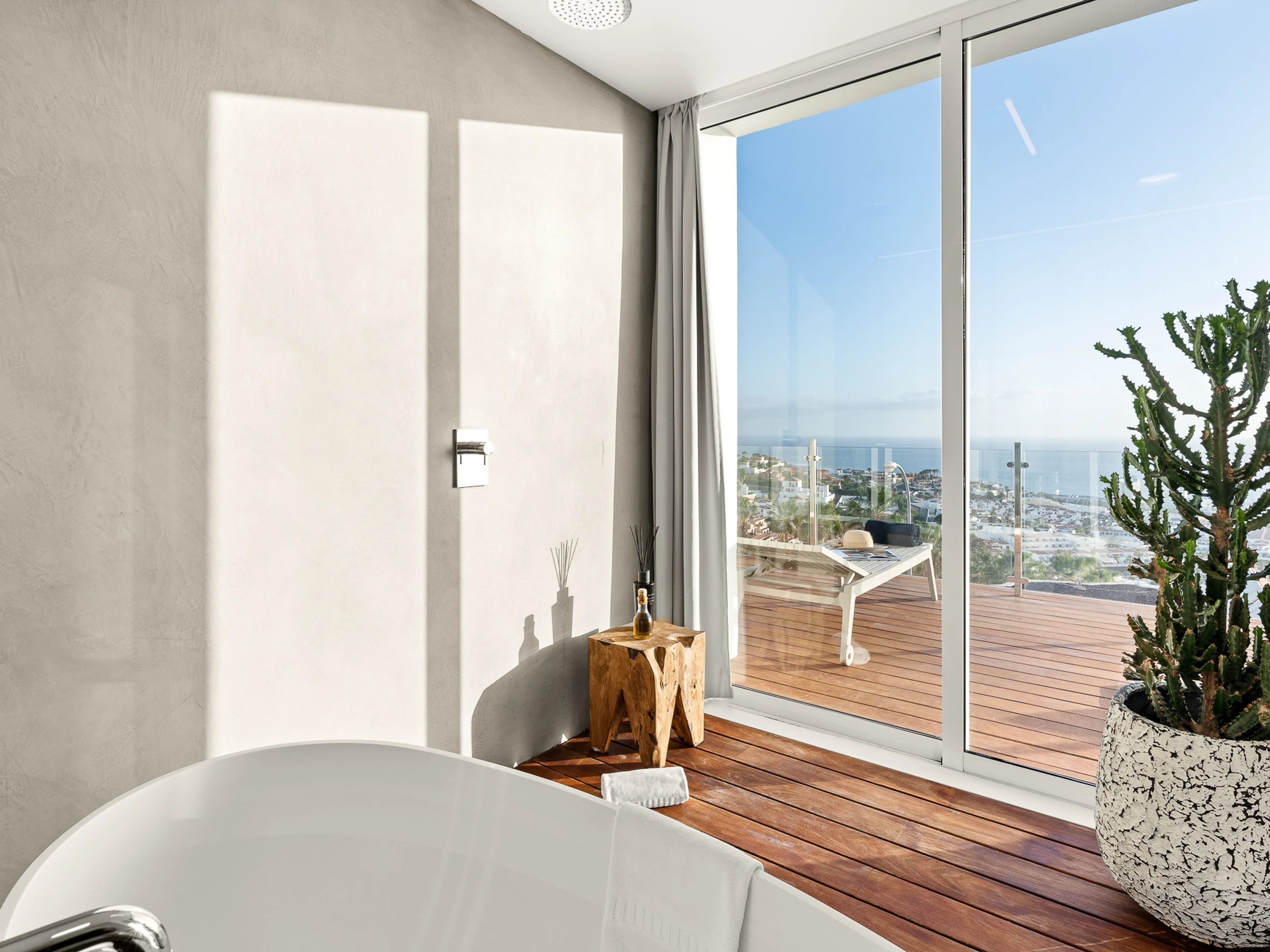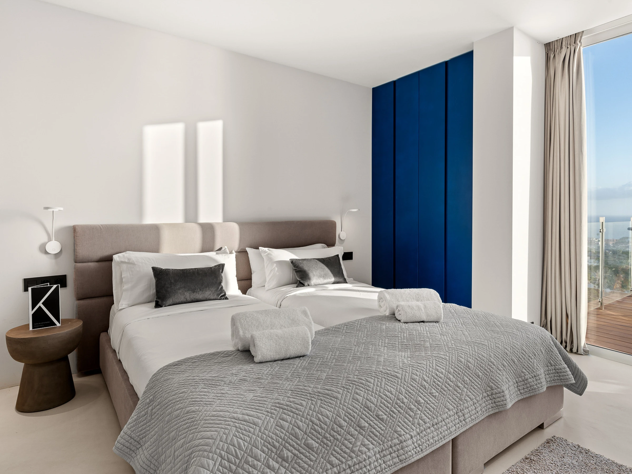 Sa conception architecturale moderne et soignée laisse place à des intérieurs d'élégance sereine. La villa dispose de trois chambres de type suite, chacune conçue pour offrir intimité et repos. La chambre principale devient un véritable sanctuaire, avec une baignoire design qui invite à des moments de détente absolue, accompagnés de lumière naturelle et de vues exceptionnelles.