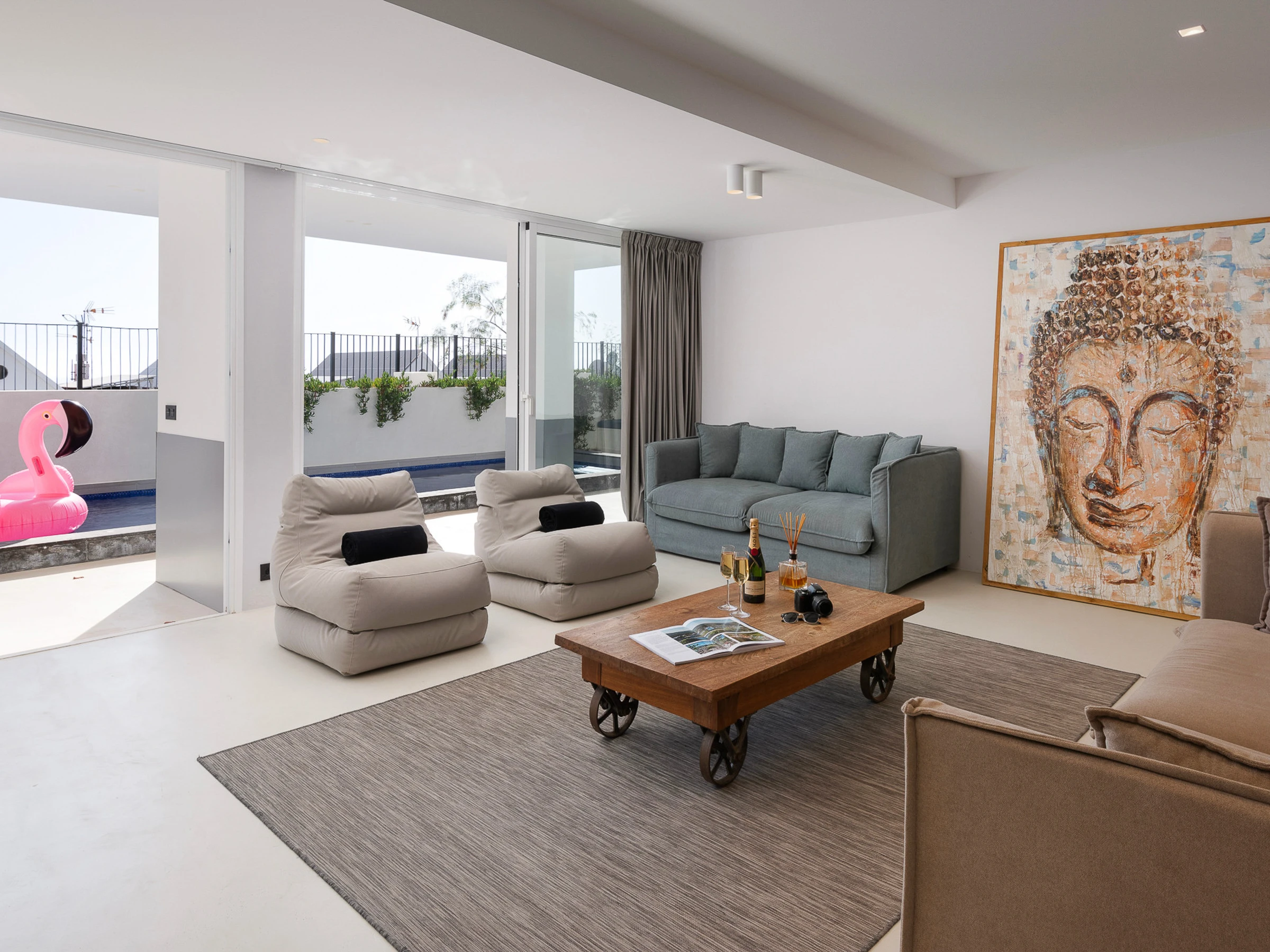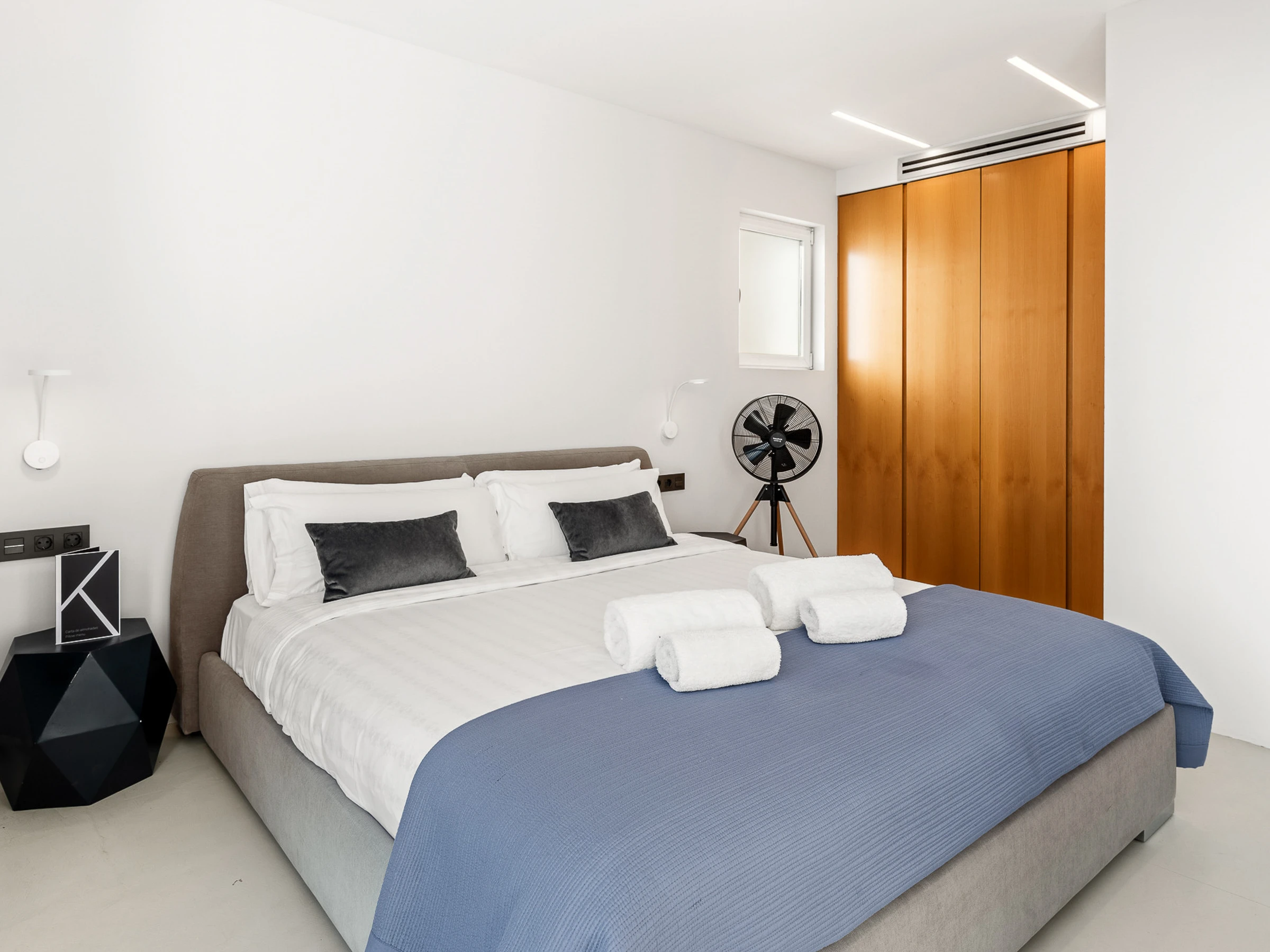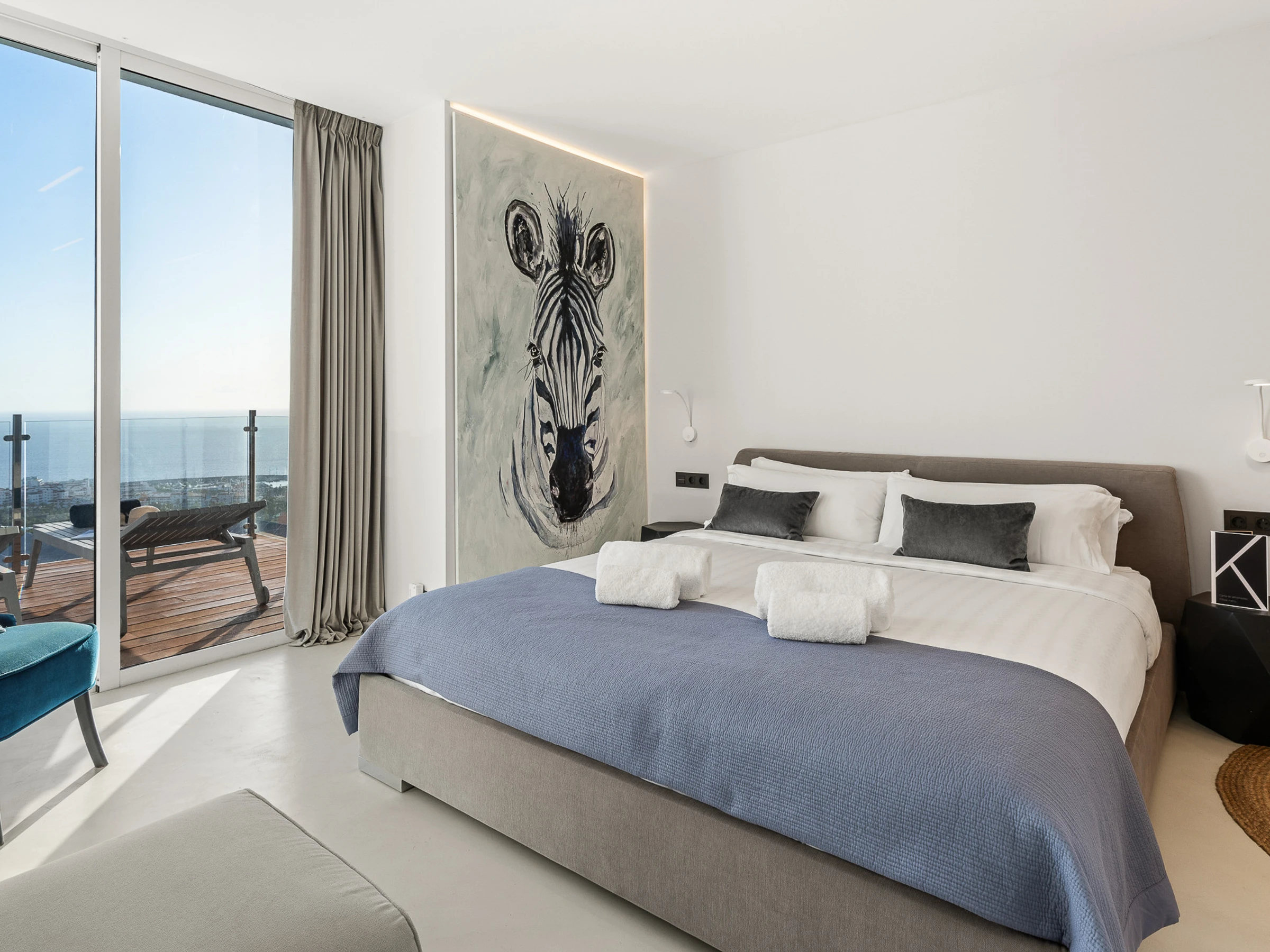 Sa conception architecturale moderne et soignée laisse place à des intérieurs d'élégance sereine. La villa dispose de trois chambres de type suite, chacune conçue pour offrir intimité et repos. La chambre principale devient un véritable sanctuaire, avec une baignoire design qui invite à des moments de détente absolue, accompagnés de lumière naturelle et de vues exceptionnelles.