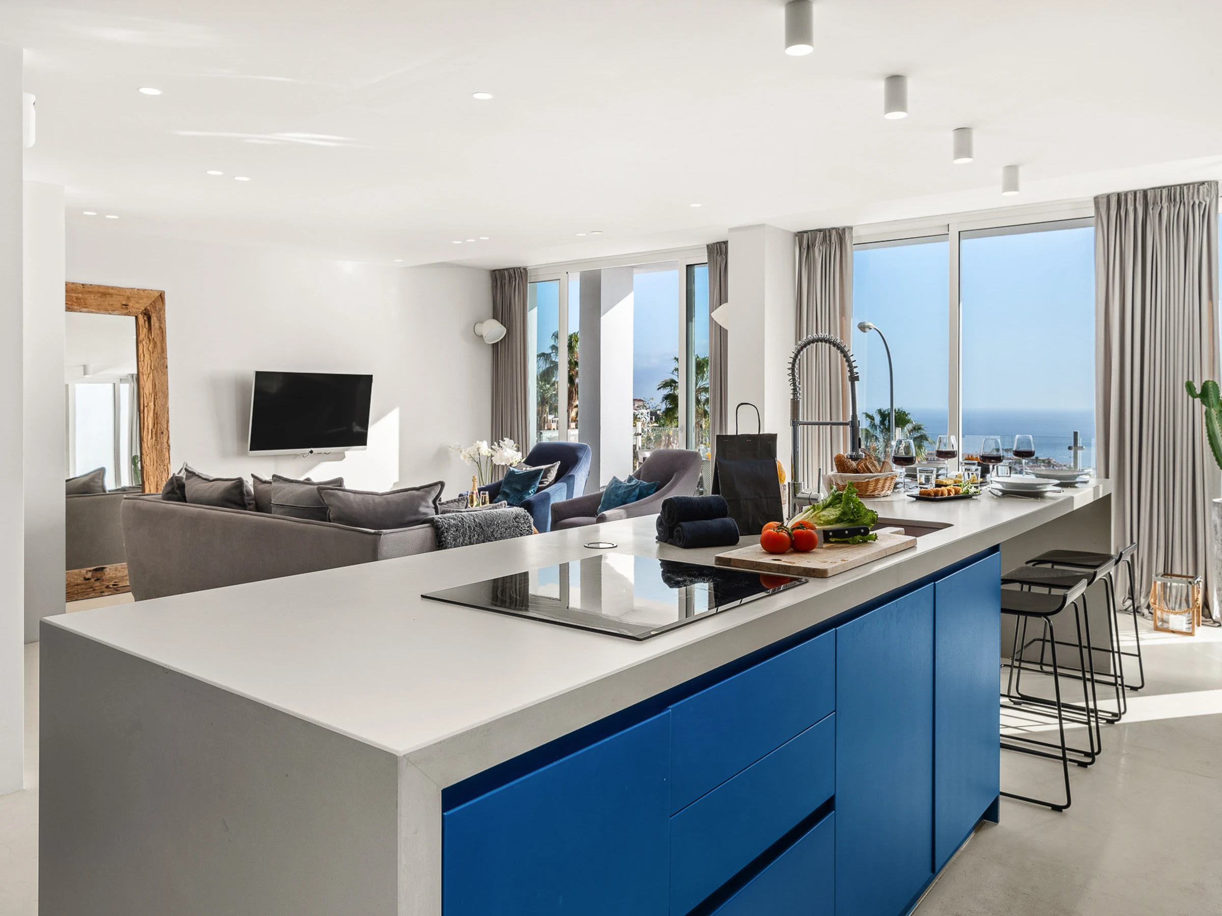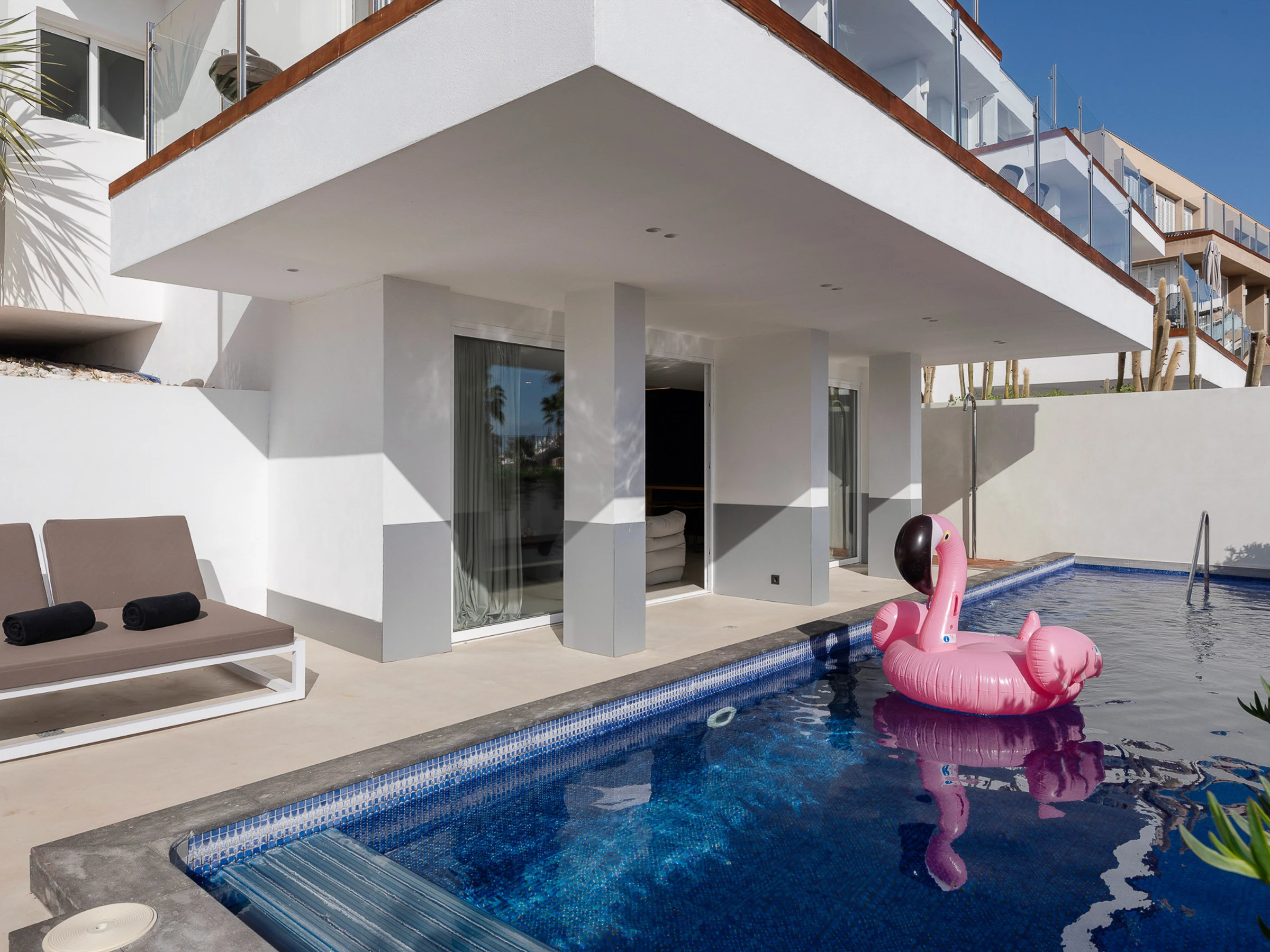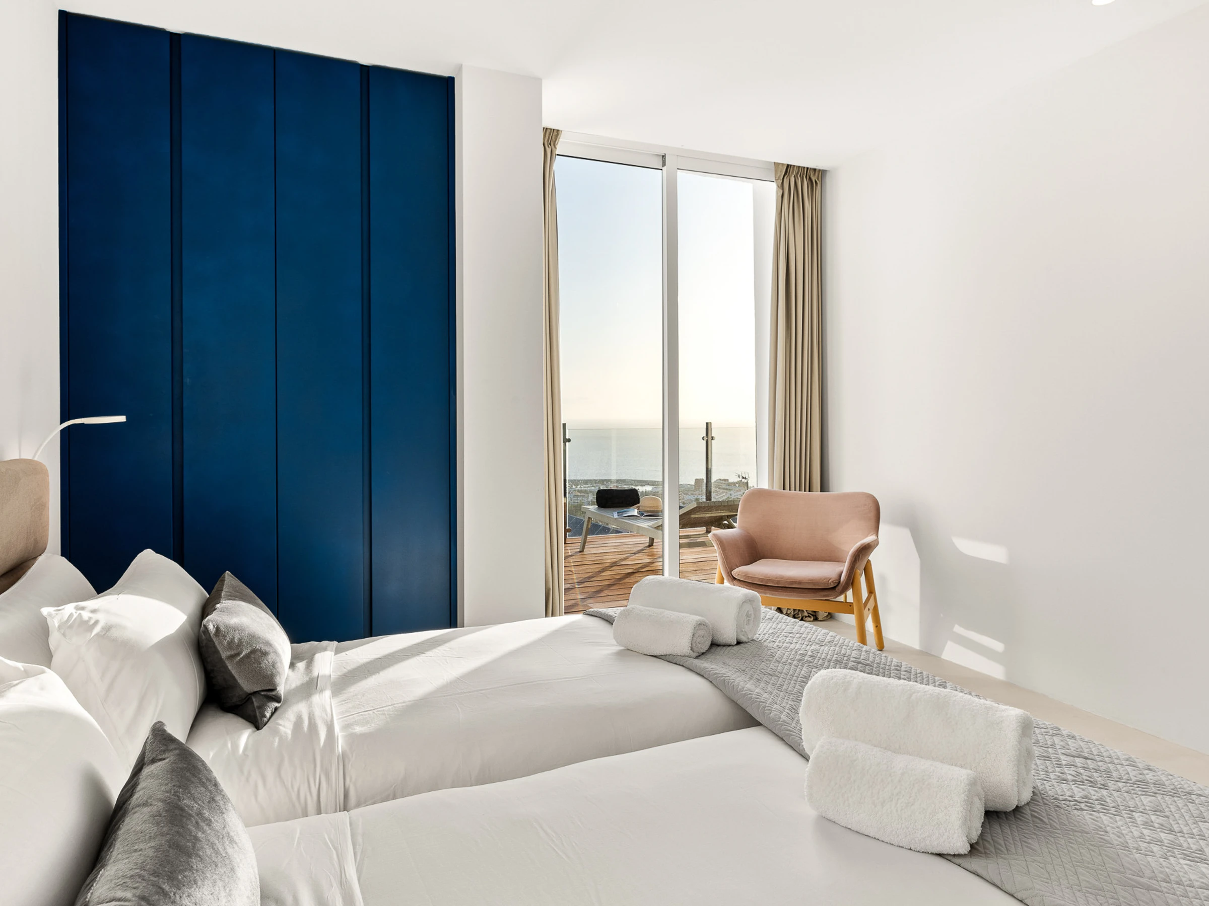 Les chambres principales s'ouvrent sur une grande terrasse privée, où les vues infinies sur la mer et le ciel canarien accompagnent chaque moment, depuis un café le matin jusqu'à un verre au crépuscule.