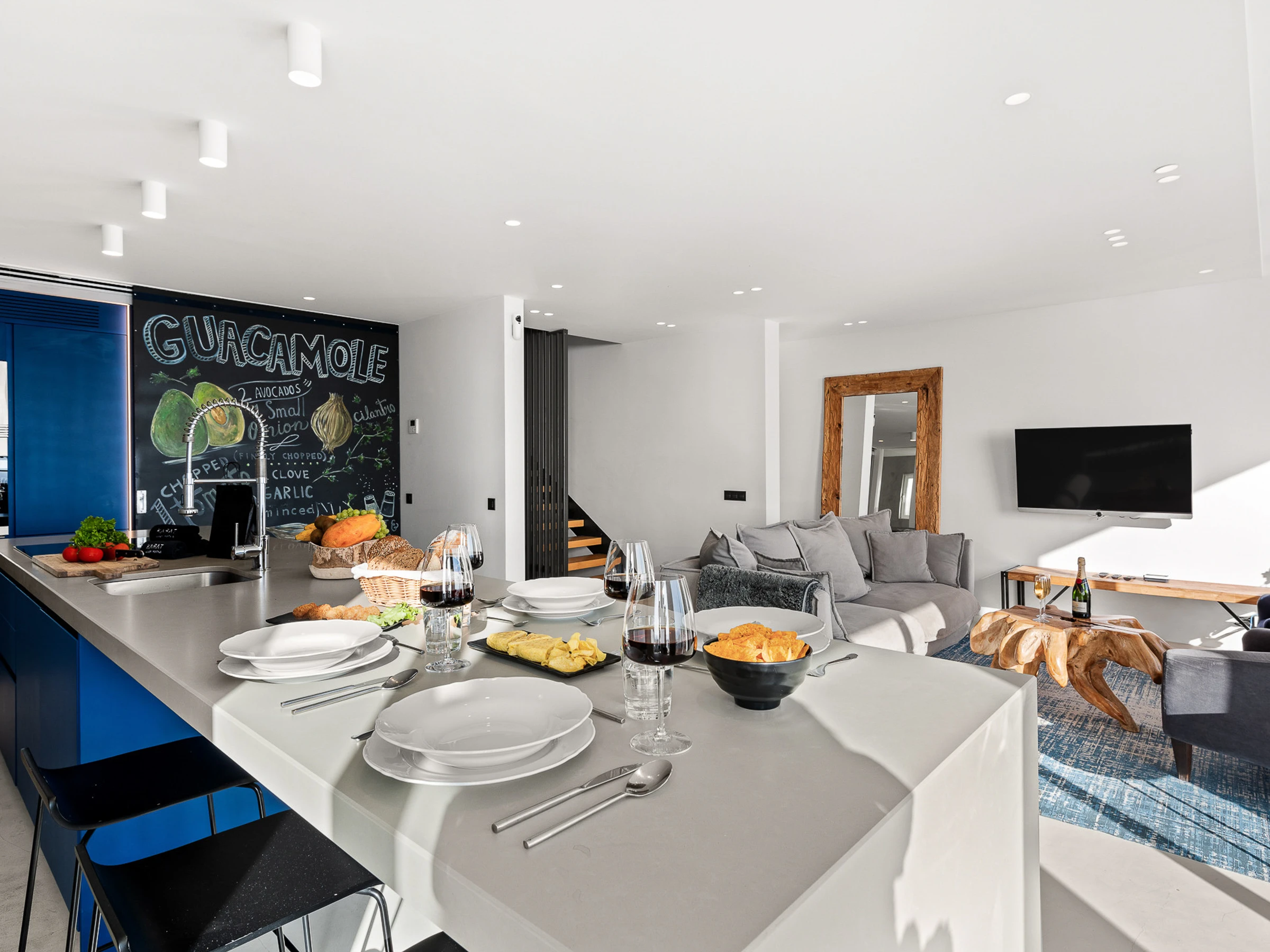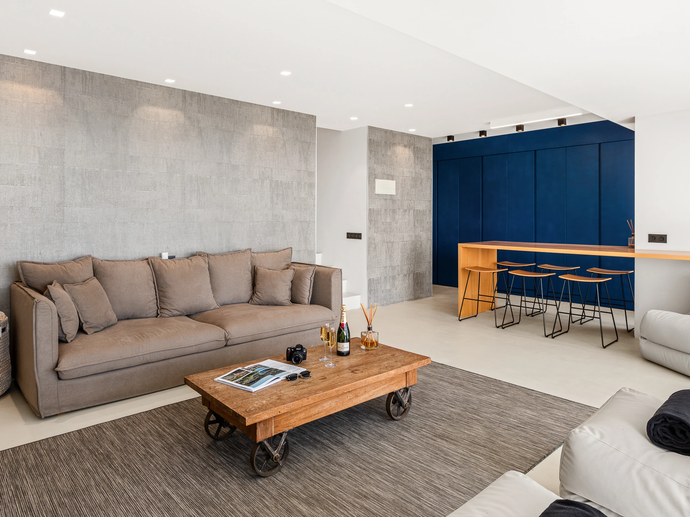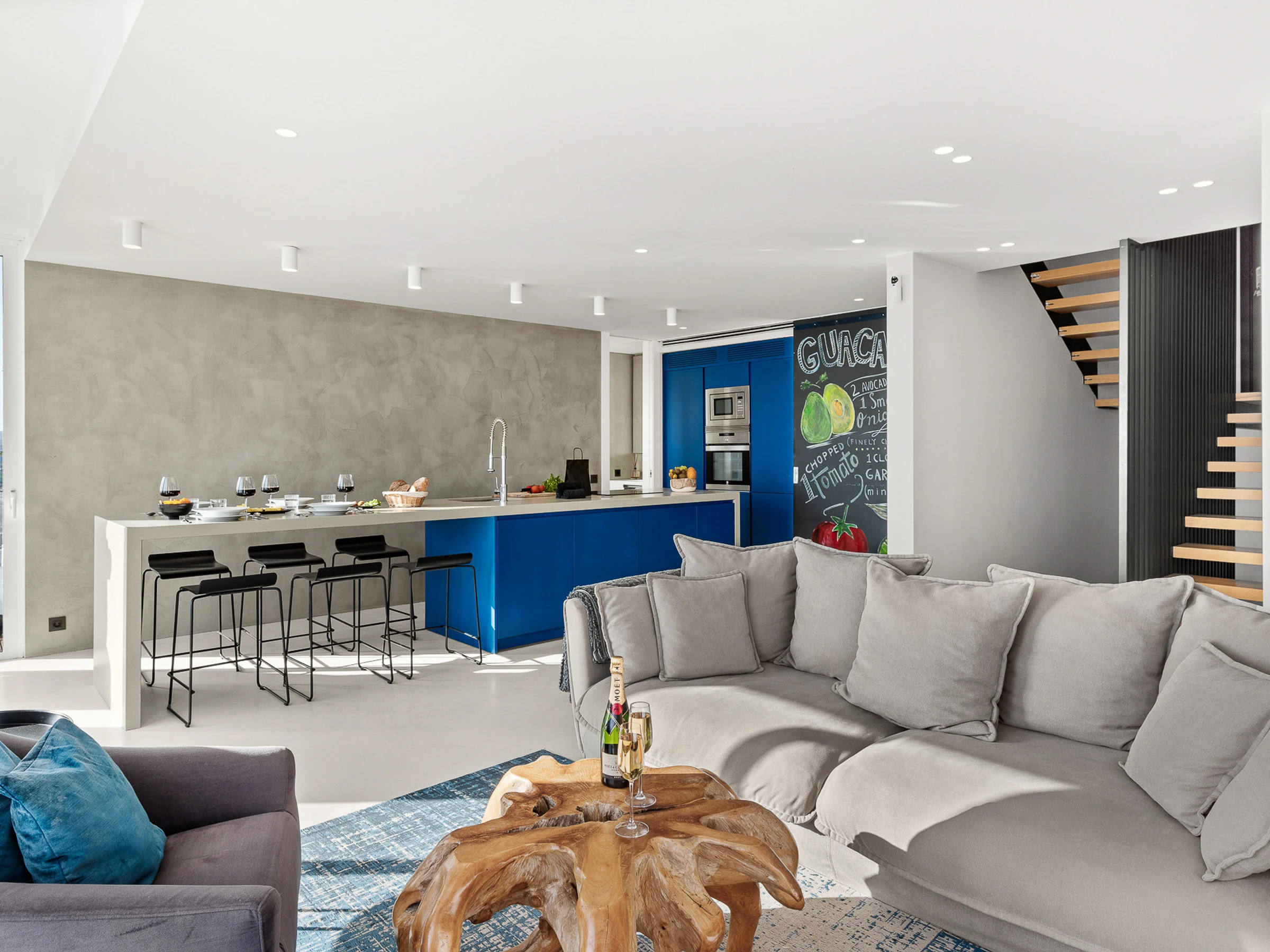 La zone de jour relie une cuisine d'îlot avant-gardiste au salon principal, créant un espace fluide et lumineux idéal tant pour profiter en couple que pour partager avec des amis ou la famille. À l'étage inférieur, un grand salon avec téléviseur dernier cri offre une atmosphère chaleureuse pour des après-midis cinéma ou de divertissement en groupe.
