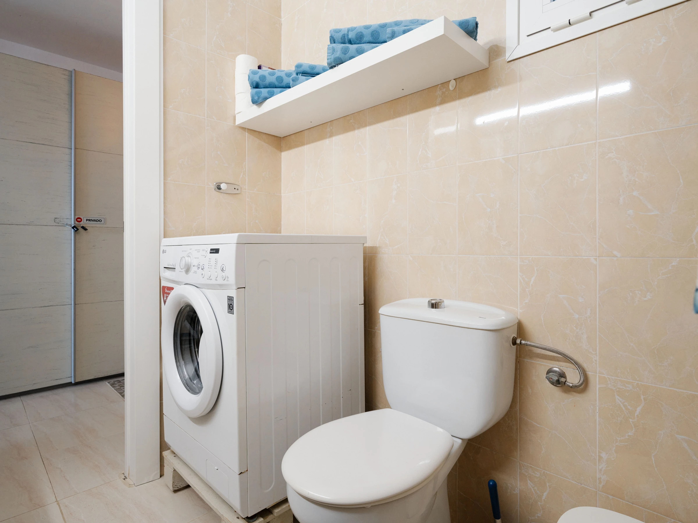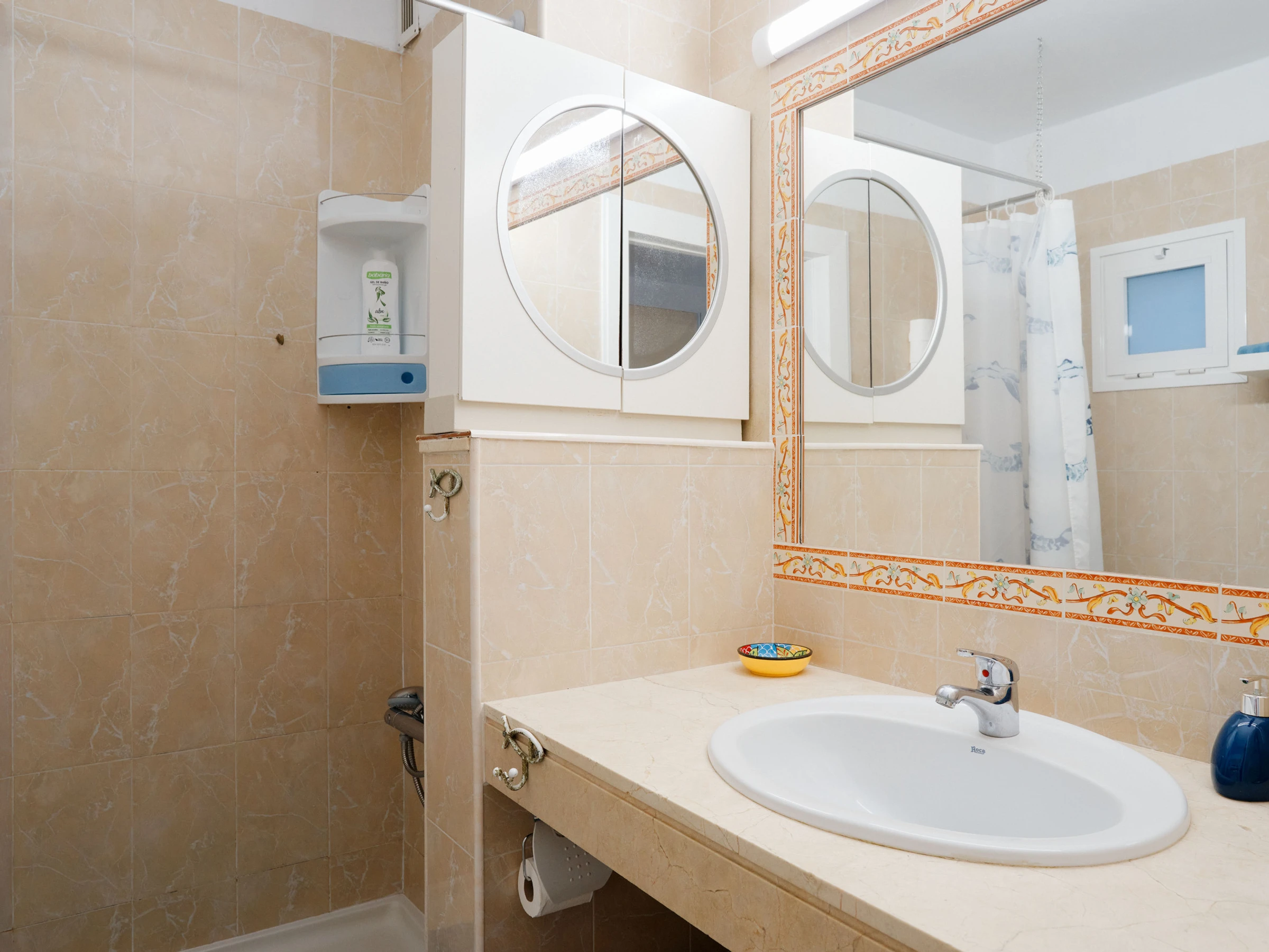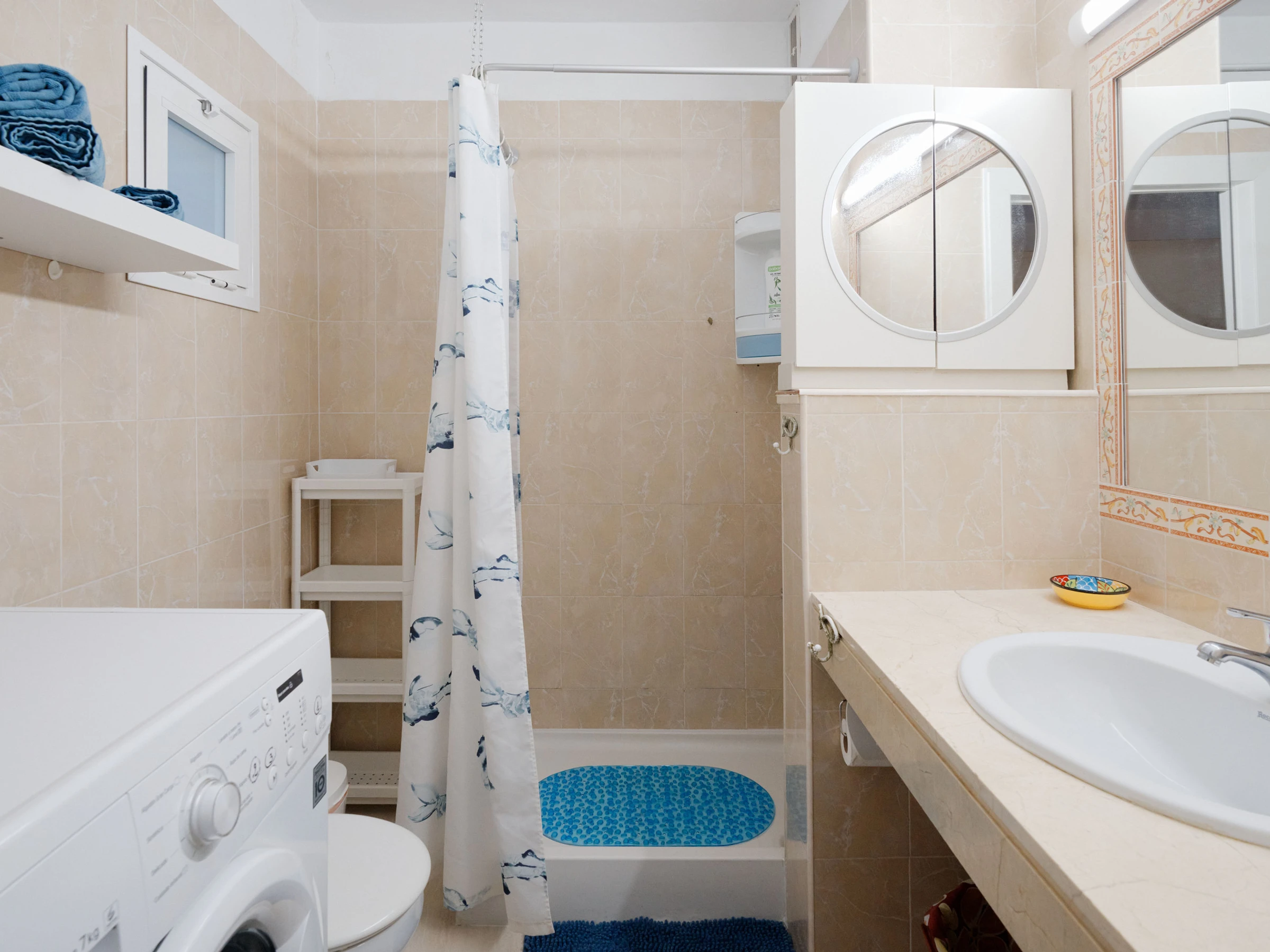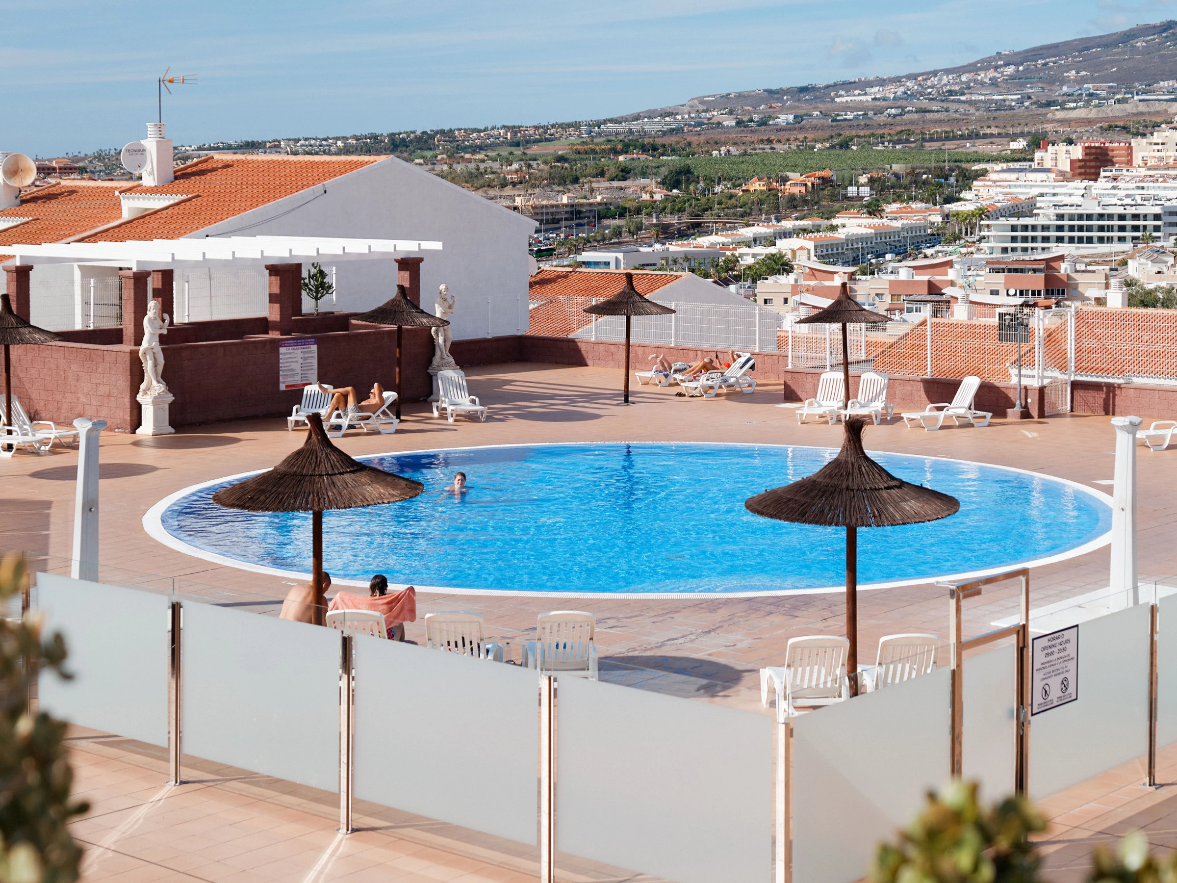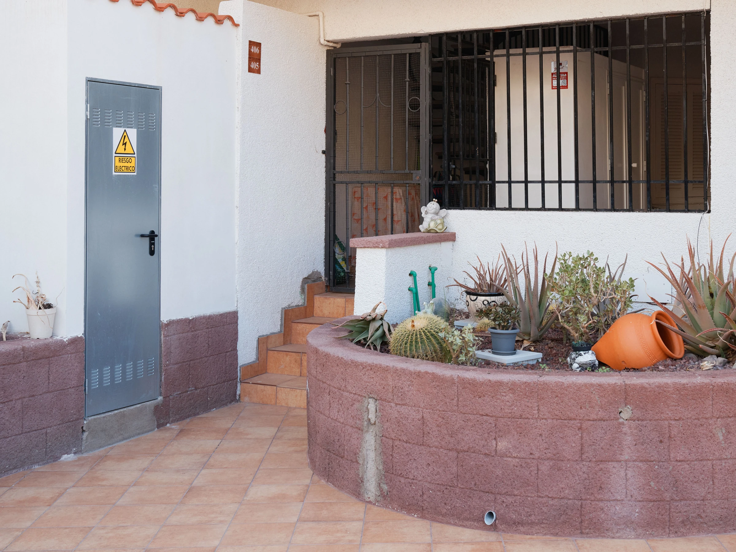 Il se trouve dans un complexe calme et soigné, où la zone extérieure invite à se détendre : une piscine communautaire de chlore, de 5 x 5 mètres et 1,4 mètres de profondeur, entourée de transats et de parasols, idéale pour bronzer tranquillement. L'enceinte dispose également d'une douche extérieure, en plus du terrain de football et de basket.