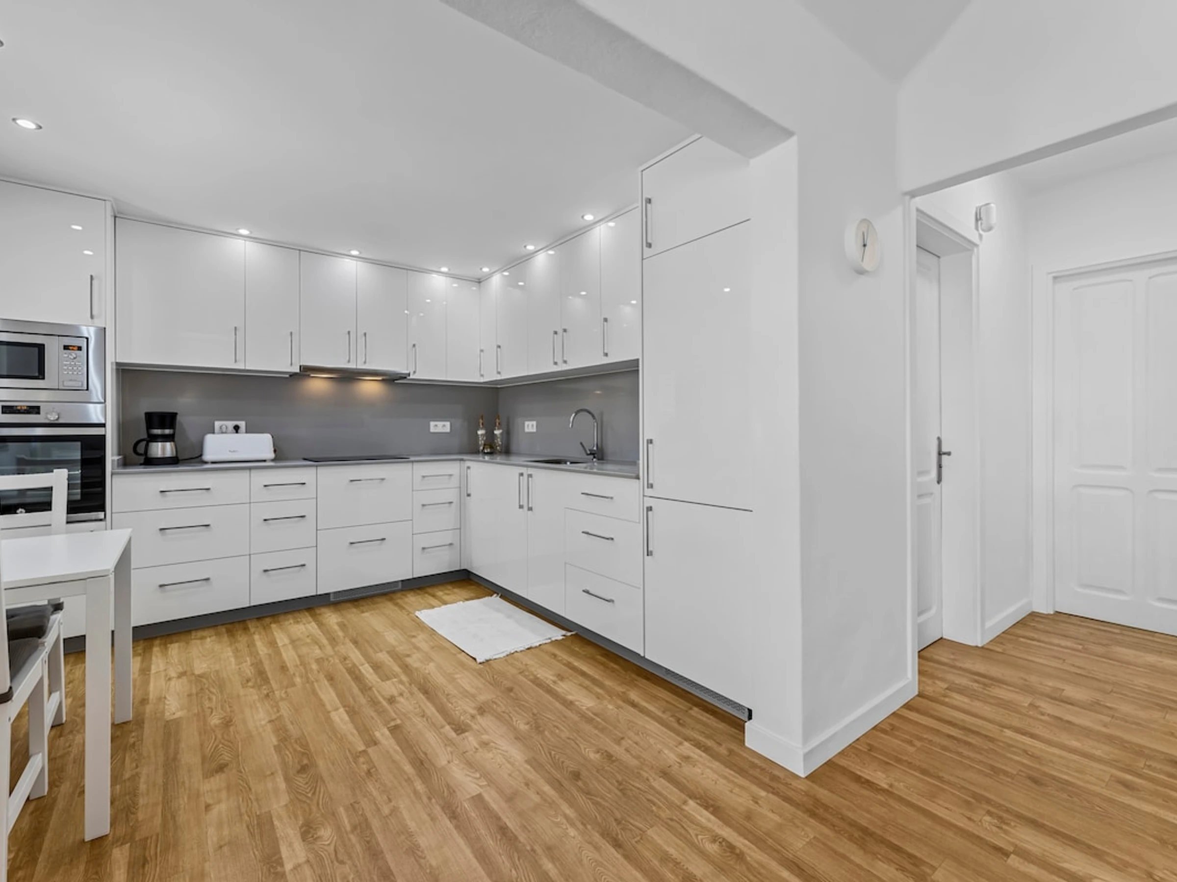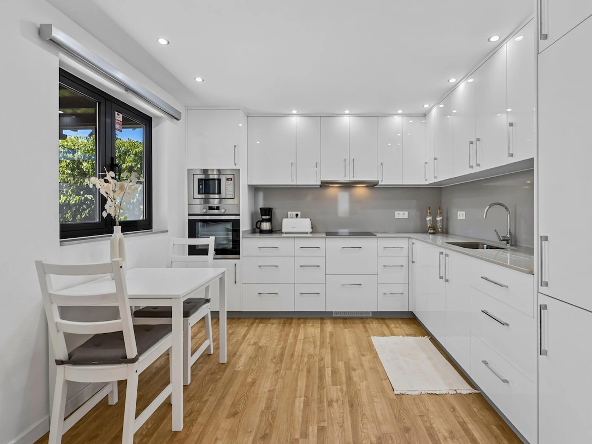 La cuisine, est équipée avec micro-ondes, four, ustensiles/cuisine et cafetière.