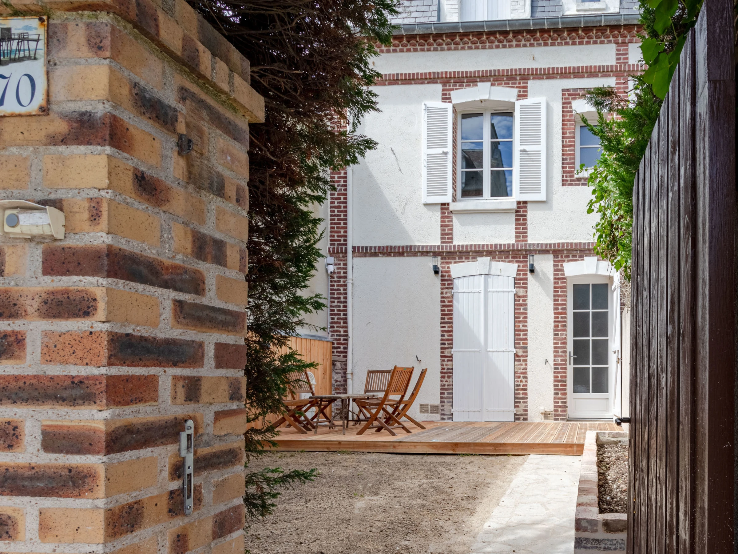 Deauville: Maison mitoyenne "Maison de ville", de 3 étages. Au centre de Deauville, à 700 m de la mer, à 700 m de la plage. Magasin d'alimentation 110 m, supermarché 2.7 km, restaurant 3 m, arrêt de bus "Deauville Art Station" 350 m, gare ferroviaire "Deauville-Trouville" 650 m, piscine couverte 450 m, centre thermal "Deauville" 1 km. Attractions à proximité: Hippodrome Deauville-La Touques 1 km, Centre International Deauville - CID 800 m, Mémorial de Caen 54 km, Plage du débarquement d'Arromanches 85 km. La remise des clés a lieu à l’agence de Deauville.