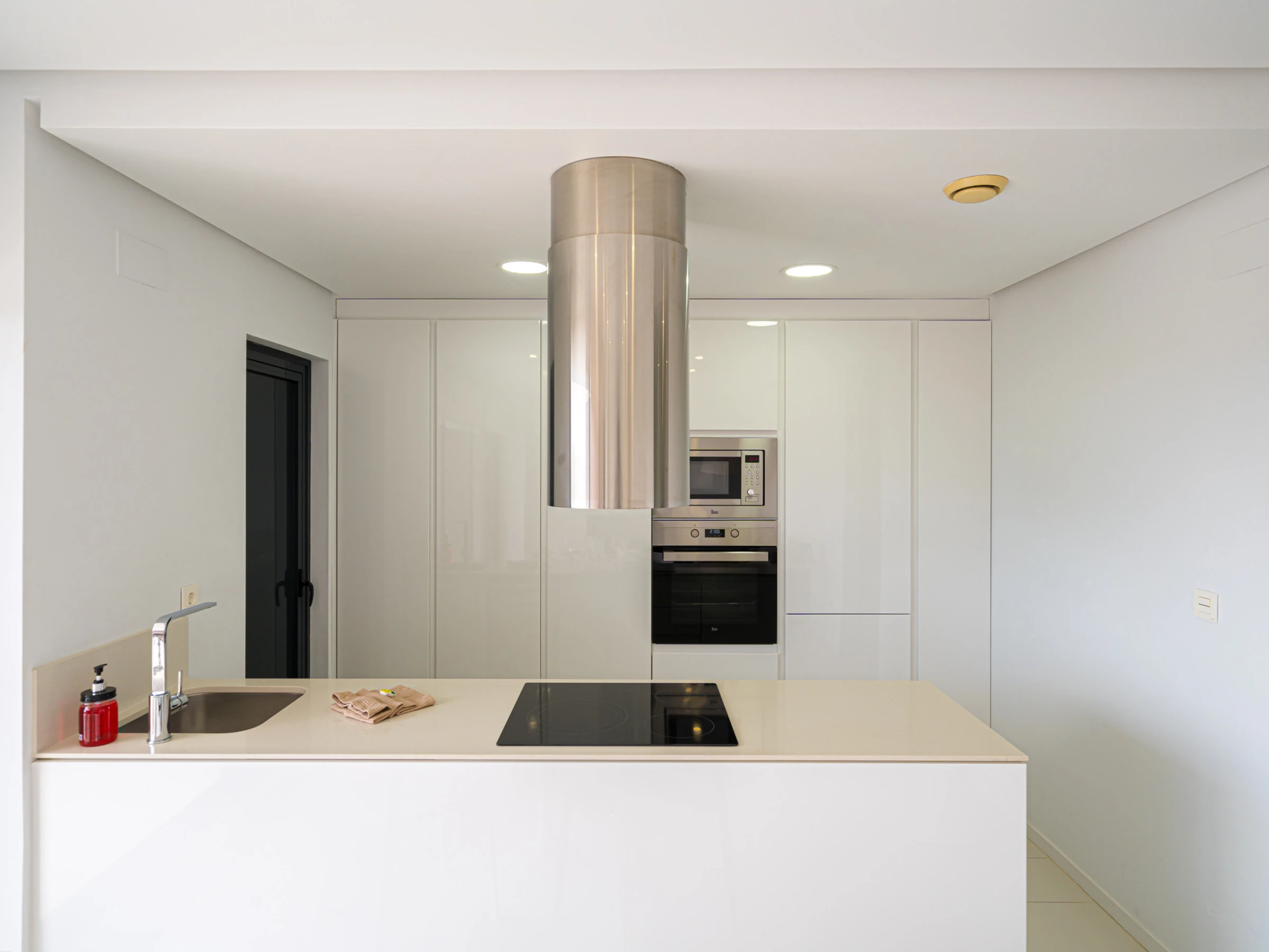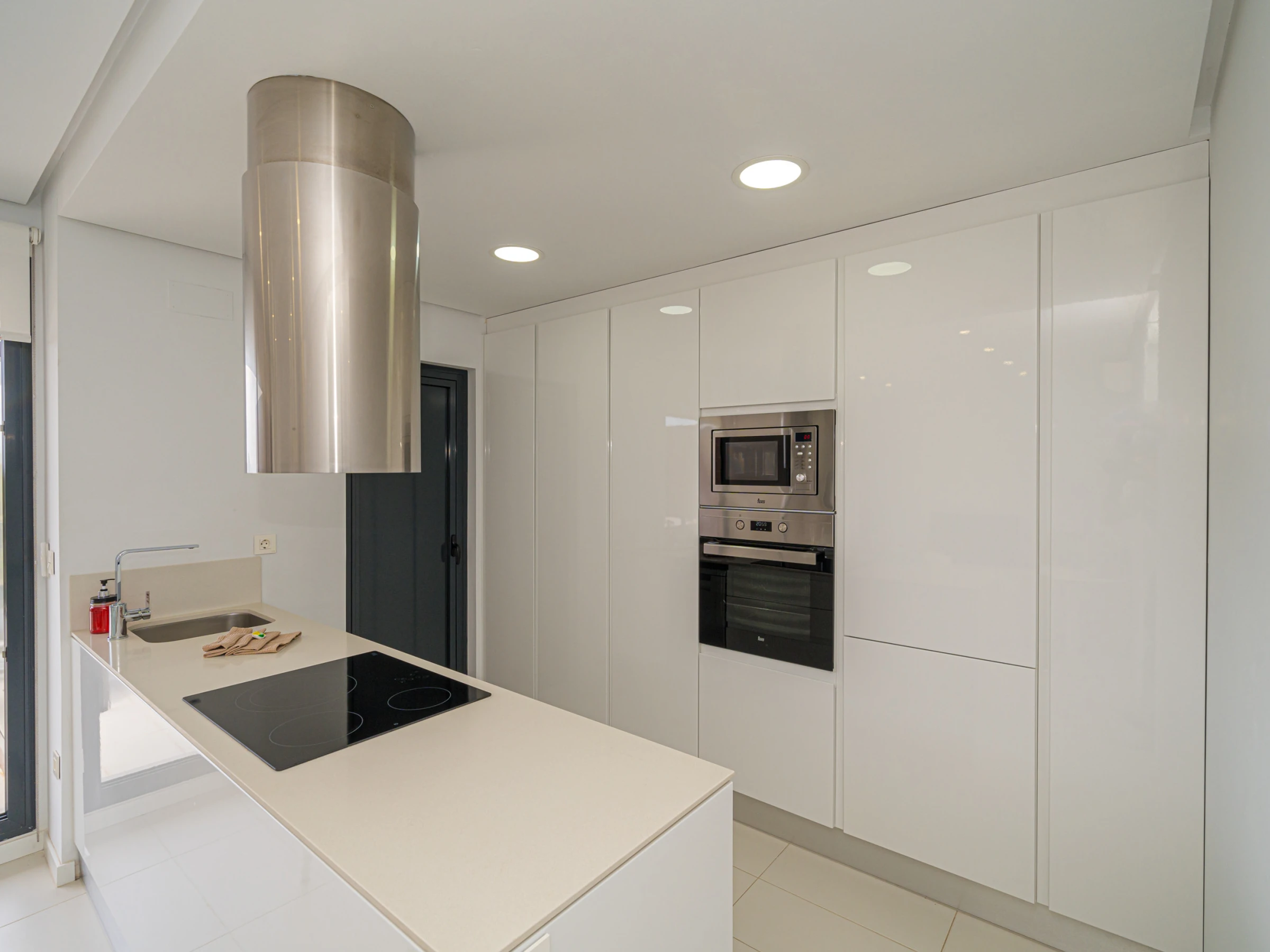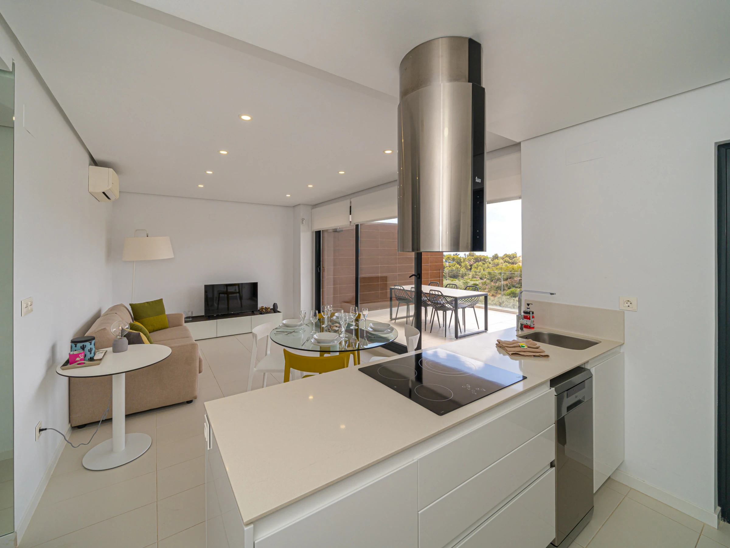 La cuisine américaine, à vitrocéramique, est équipée avec réfrigérateur, micro-ondes, four, congélateur, lave-vaisselle, vaisselle/couverts, ustensiles/cuisine, cafetière, grille pain, bouilloire et presse-agrumes.