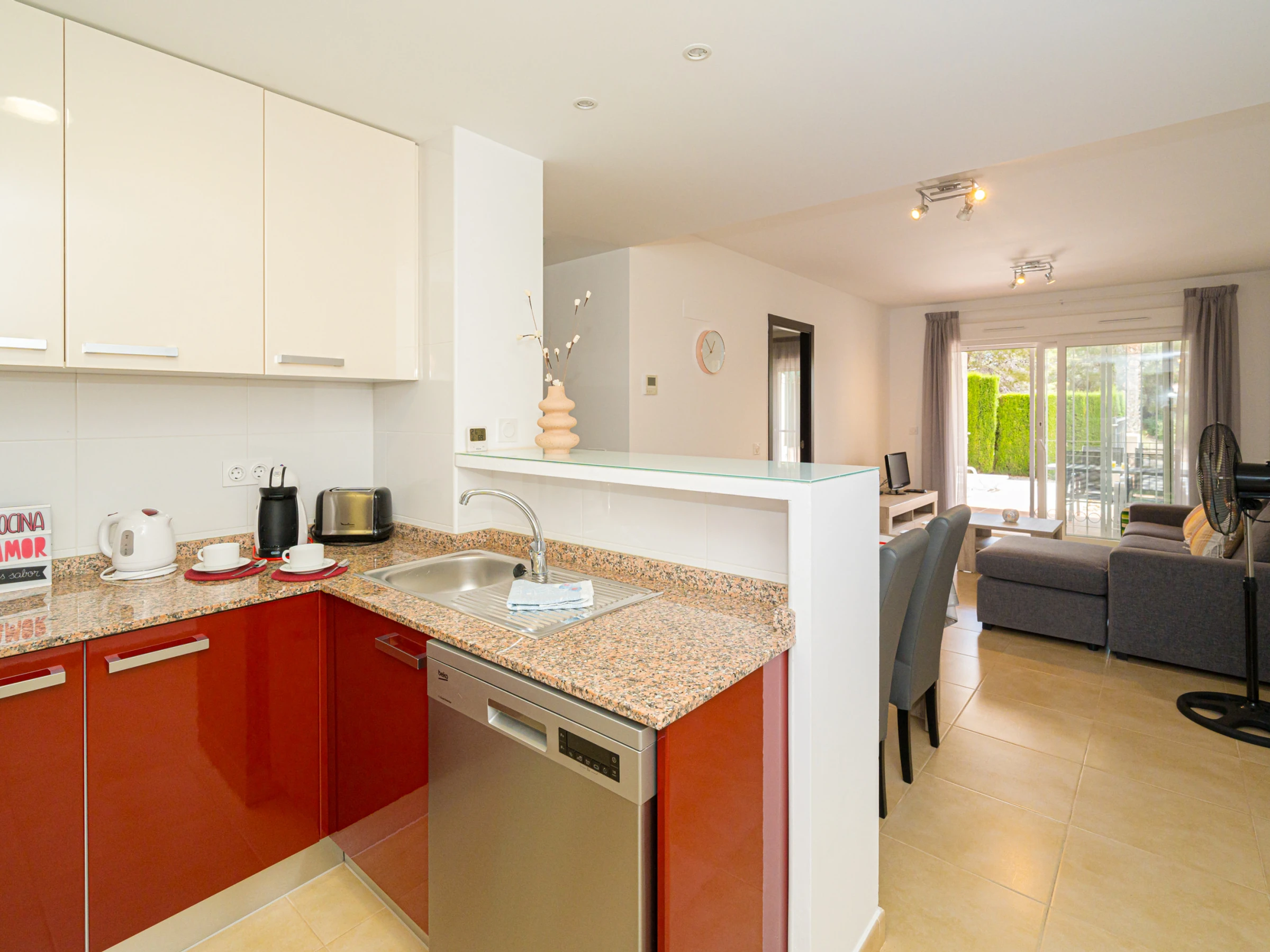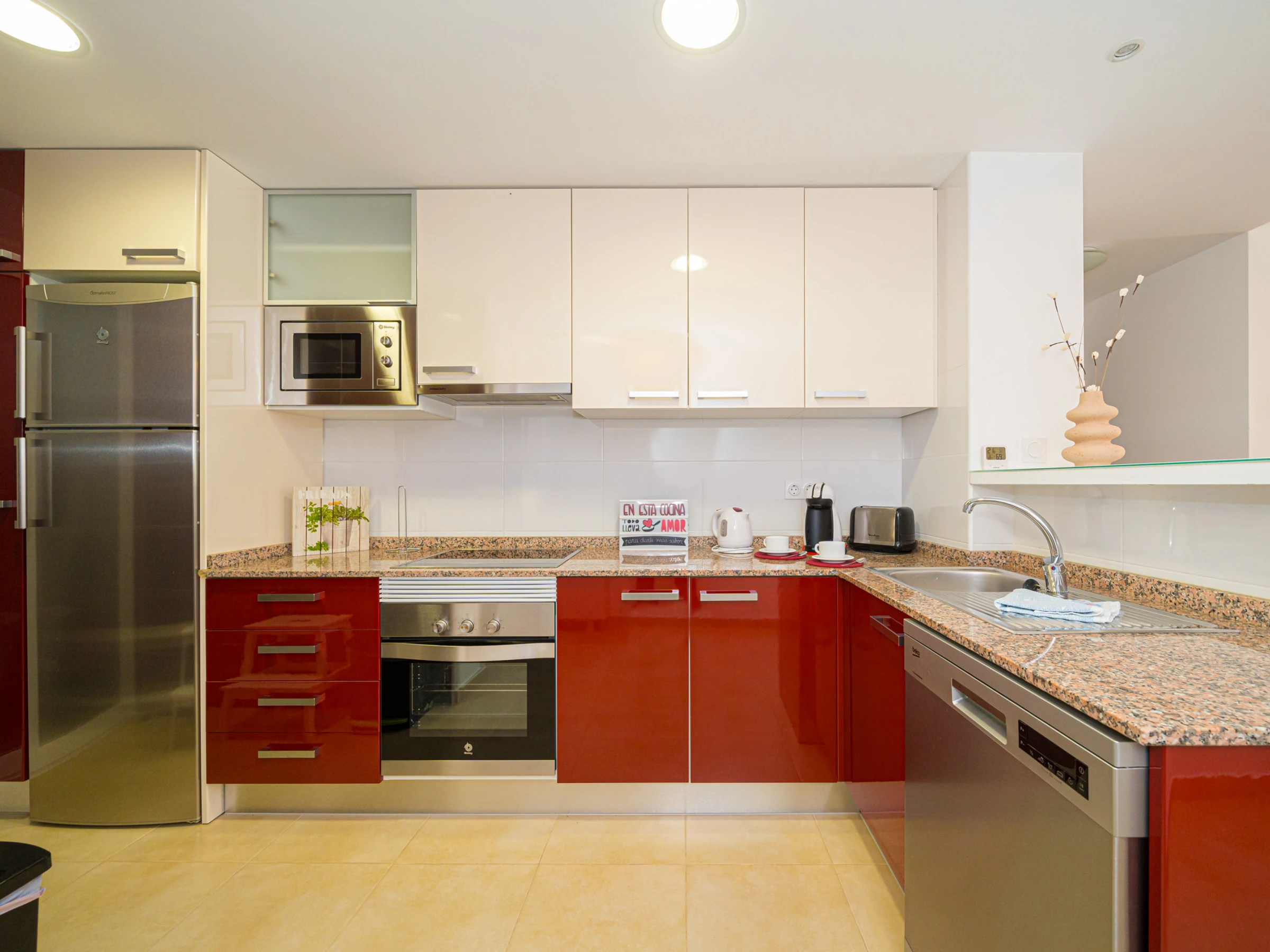 La cuisine américaine, à vitrocéramique, est équipée avec réfrigérateur, micro-ondes, four, congélateur, lave-vaisselle, vaisselle/couverts, ustensiles/cuisine, cafetière, grille pain, bouilloire et presse-agrumes.