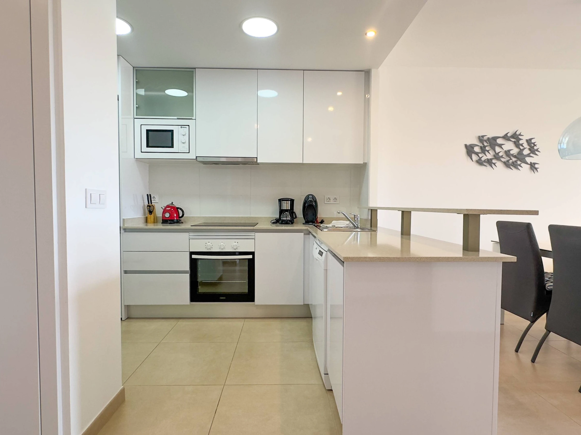 La cuisine américaine, à vitrocéramique, est équipée avec réfrigérateur, micro-ondes, four, congélateur, lave-vaisselle, vaisselle/couverts, ustensiles/cuisine, cafetière, grille pain, bouilloire et presse-agrumes.