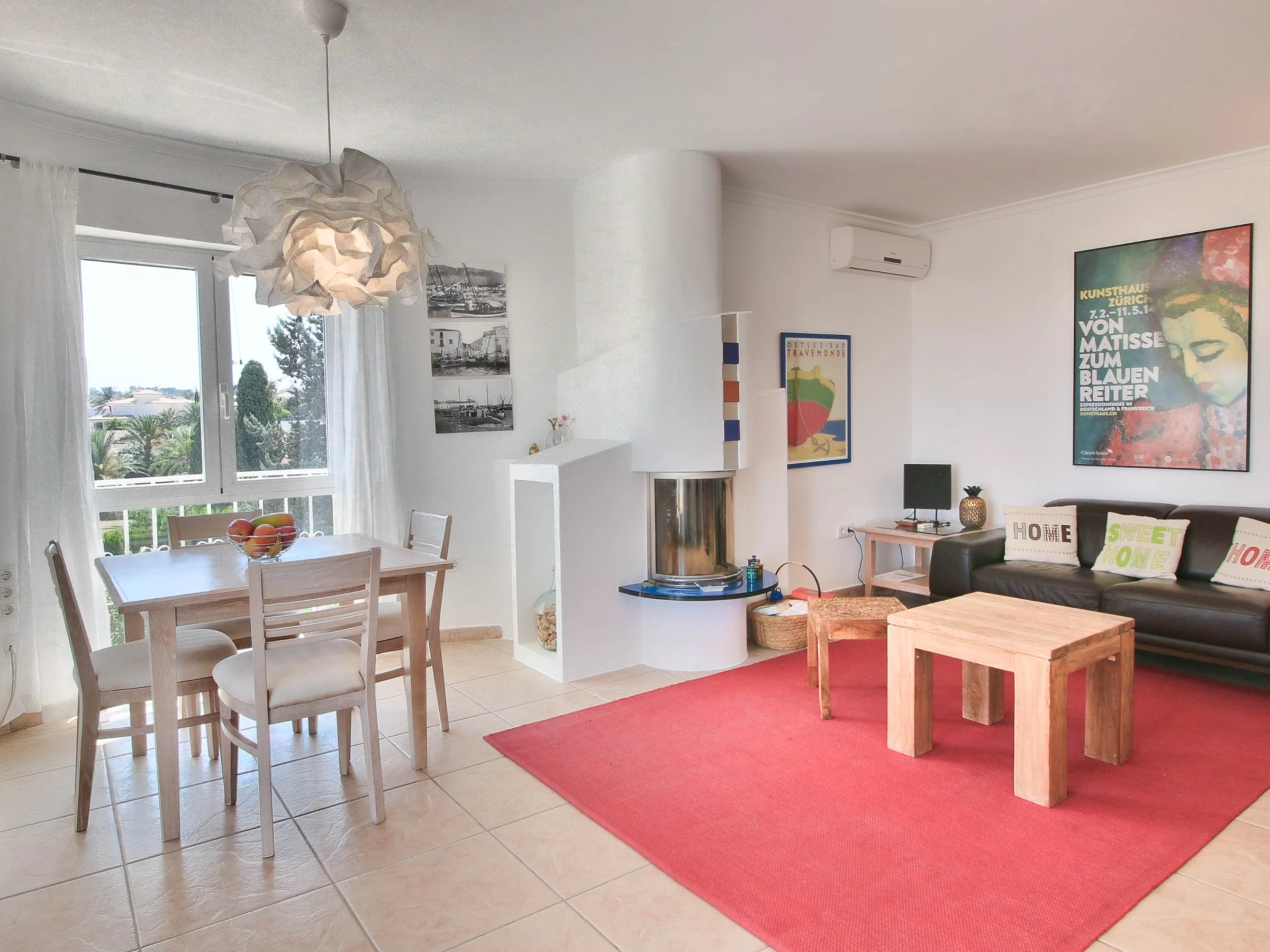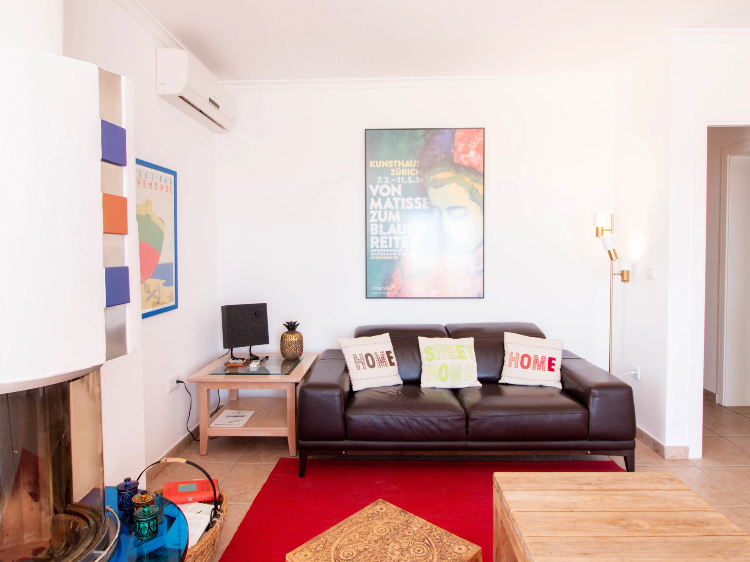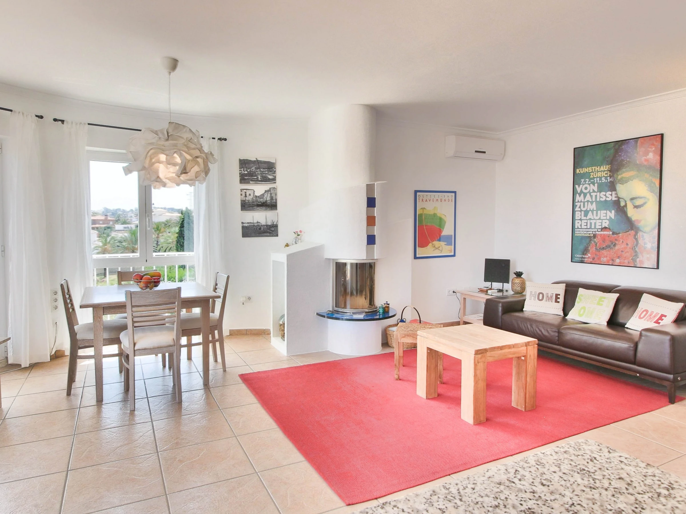 En montant les escaliers, on trouve le logement. Dès l'entrée se trouvent le salon/salle à manger et la cuisine avec un bar américain, il y a la climatisation, le wifi, la TV et une cheminée. De là, on accède à une terrasse idéale pour profiter de la vue.