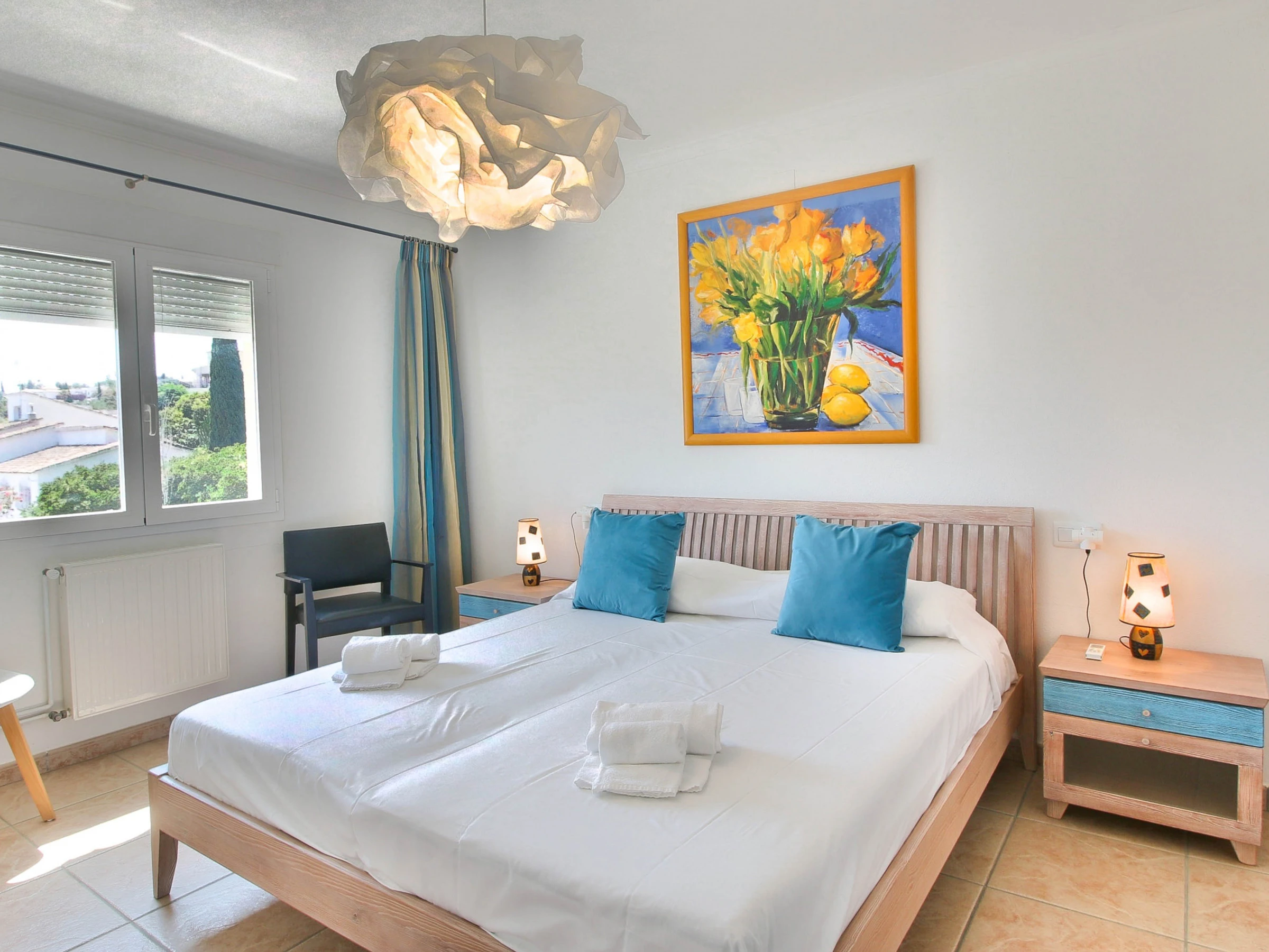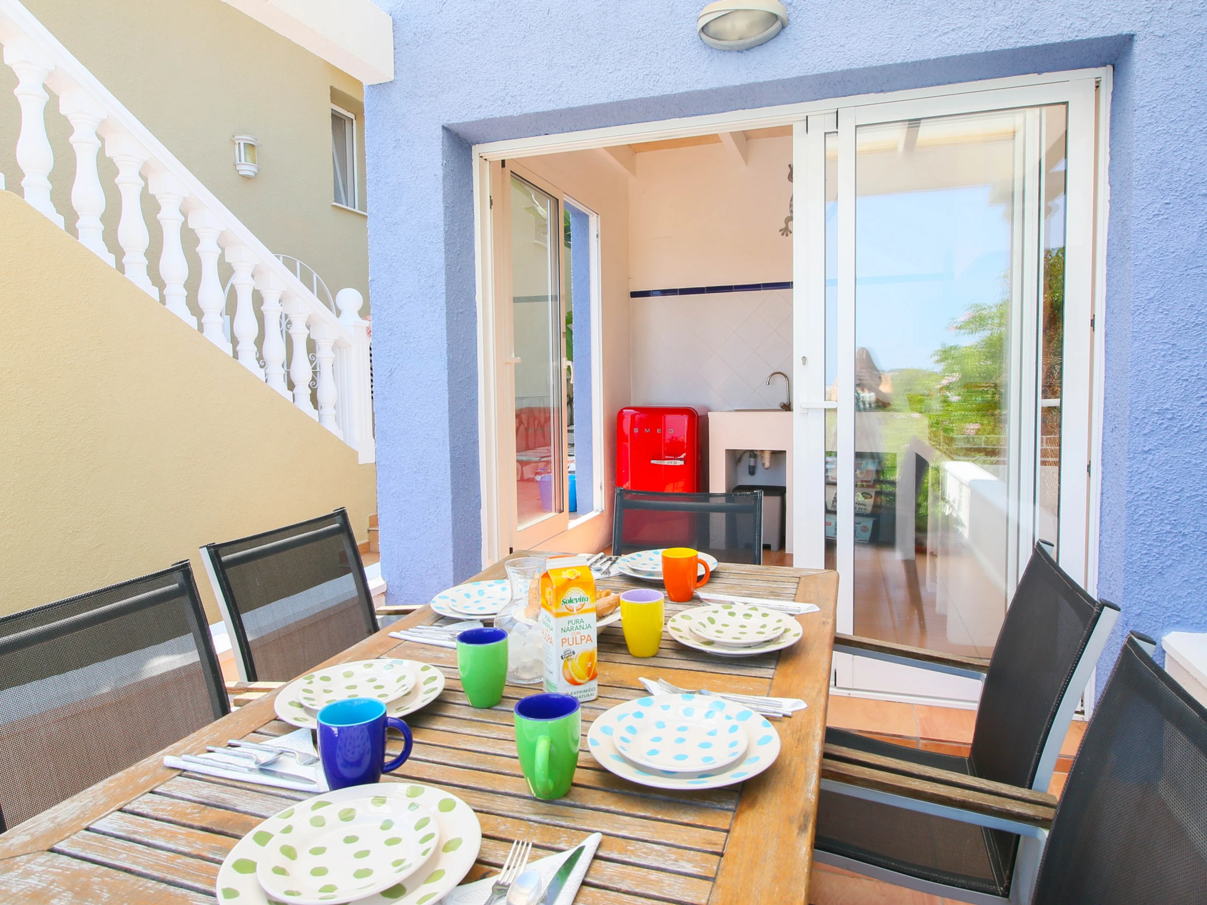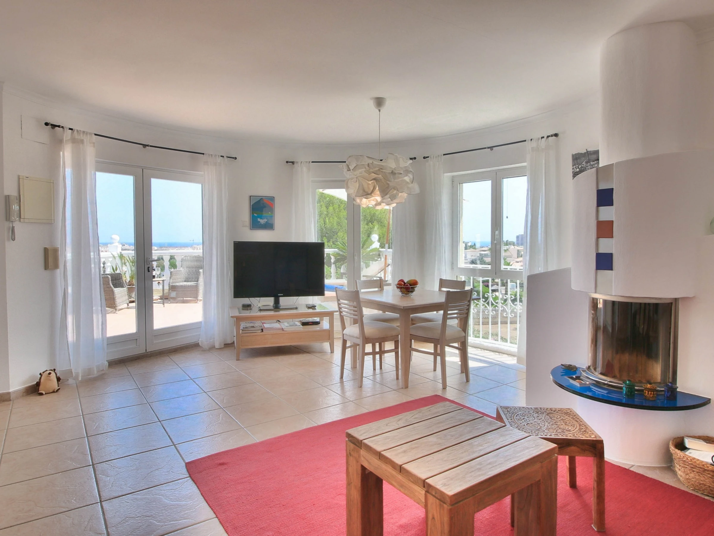 En montant les escaliers, on trouve le logement. Dès l'entrée se trouvent le salon/salle à manger et la cuisine avec un bar américain, il y a la climatisation, le wifi, la TV et une cheminée. De là, on accède à une terrasse idéale pour profiter de la vue.
