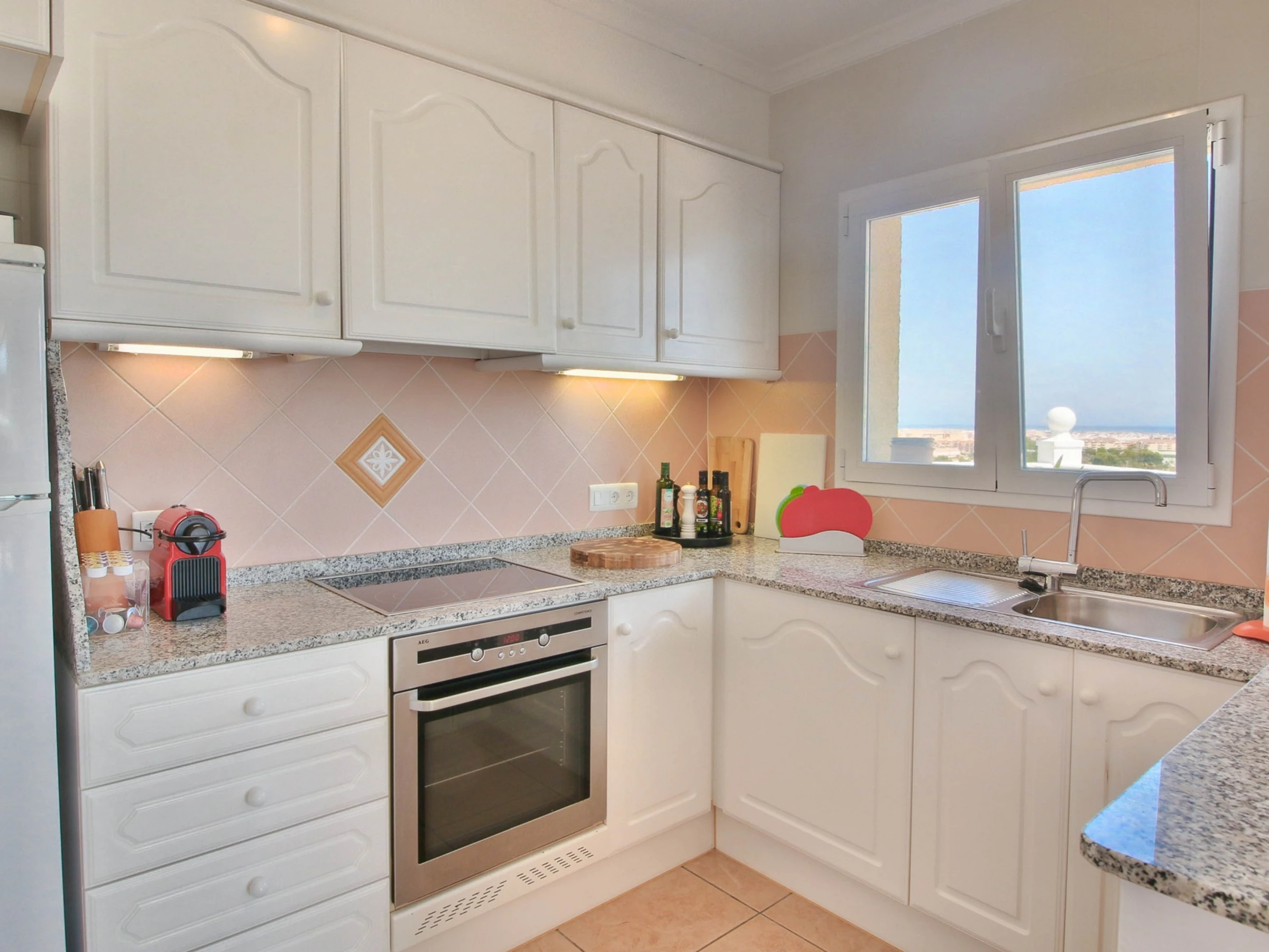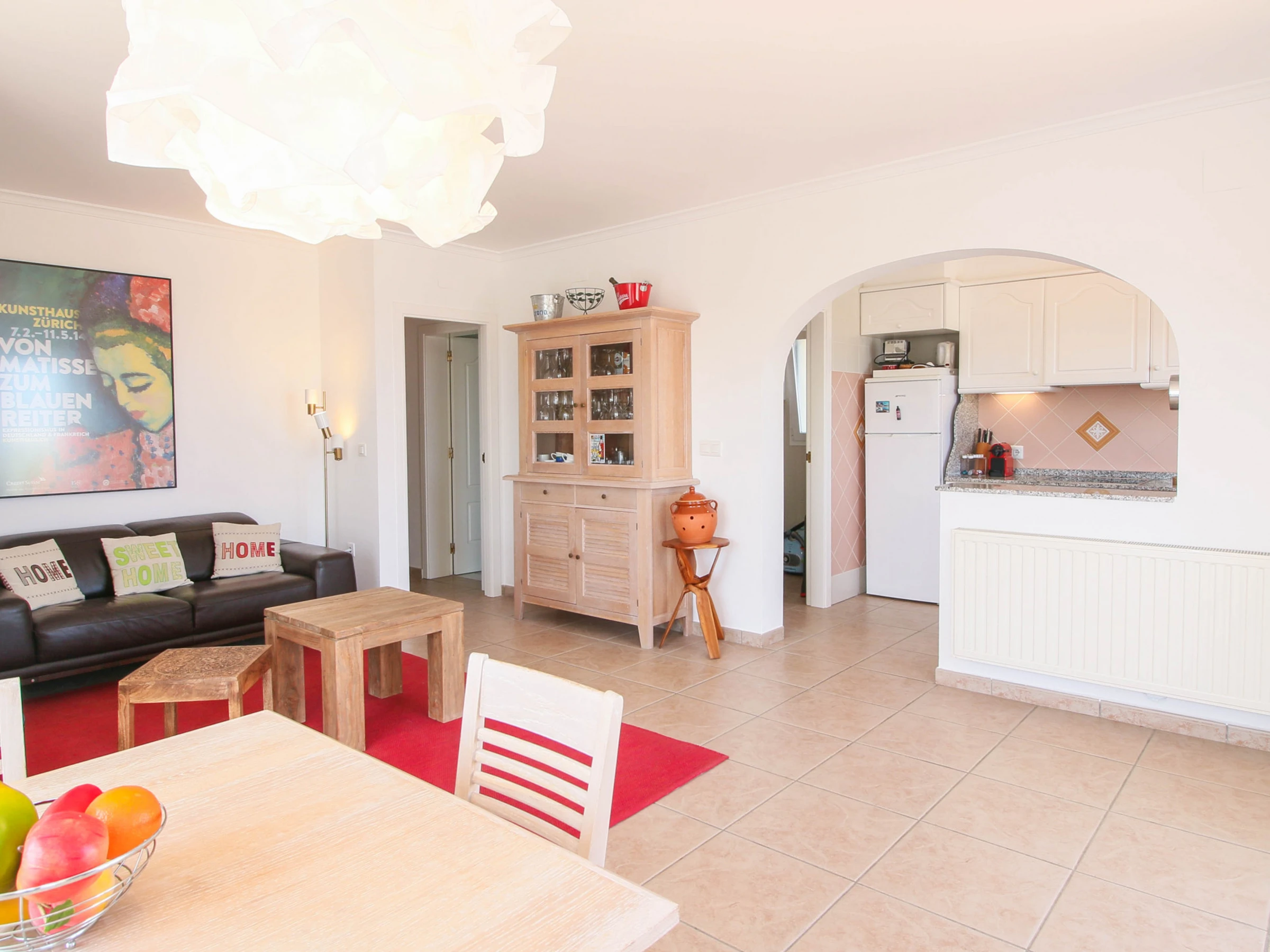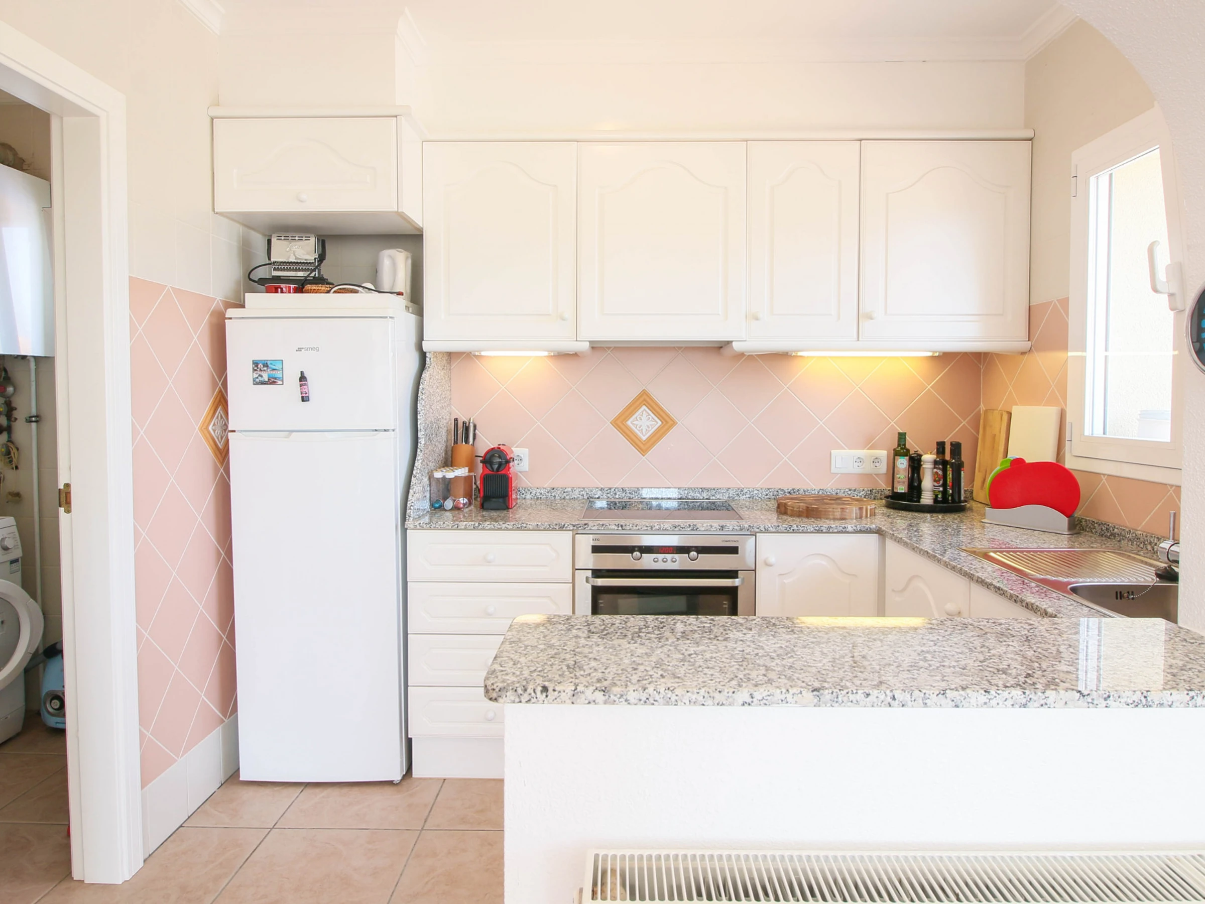 À gauche dans le salon-salle à manger se trouve la cuisine, entièrement équipée avec four, plaque vitrocéramique, réfrigérateur, congélateur, cafetière, etc., et tout le nécessaire.