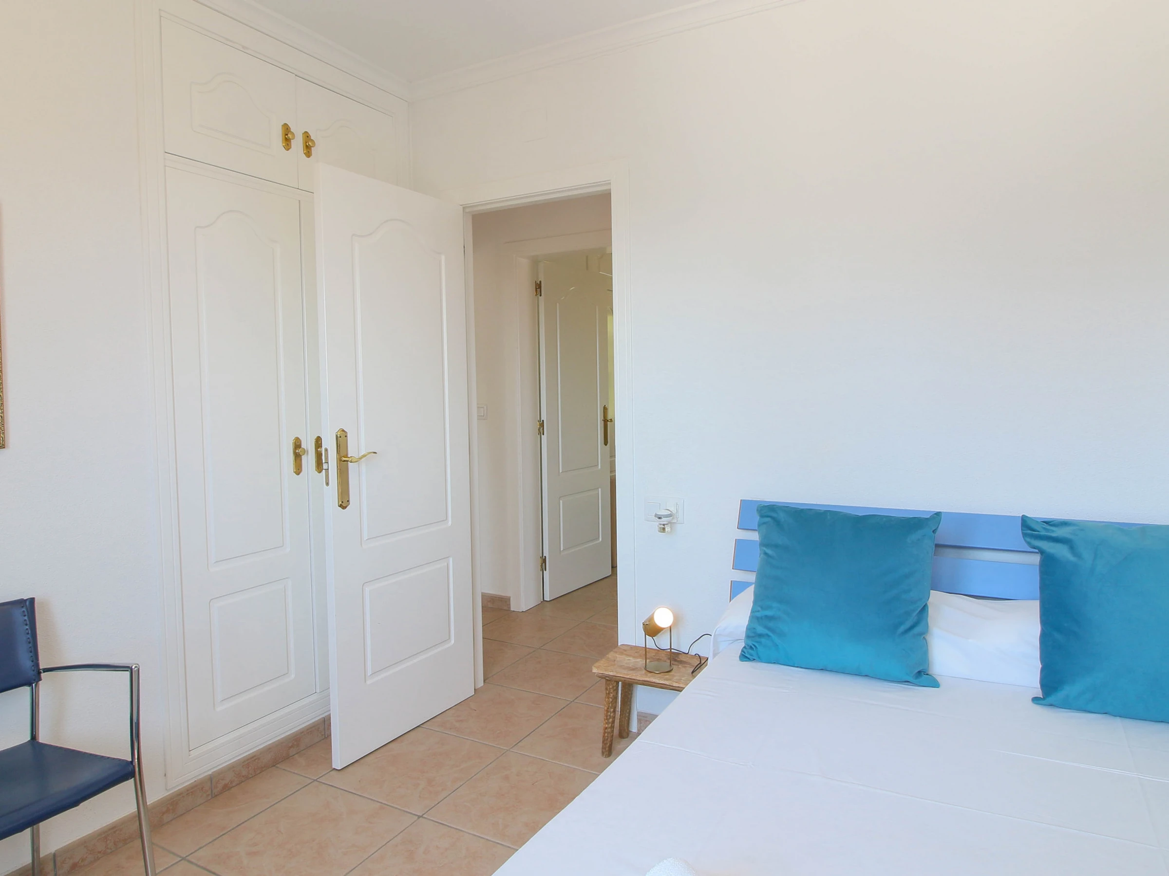 On trouve la deuxième chambre, avec un lit de 150 cm et un placard. À côté de la porte se trouve une salle de bain avec douche.