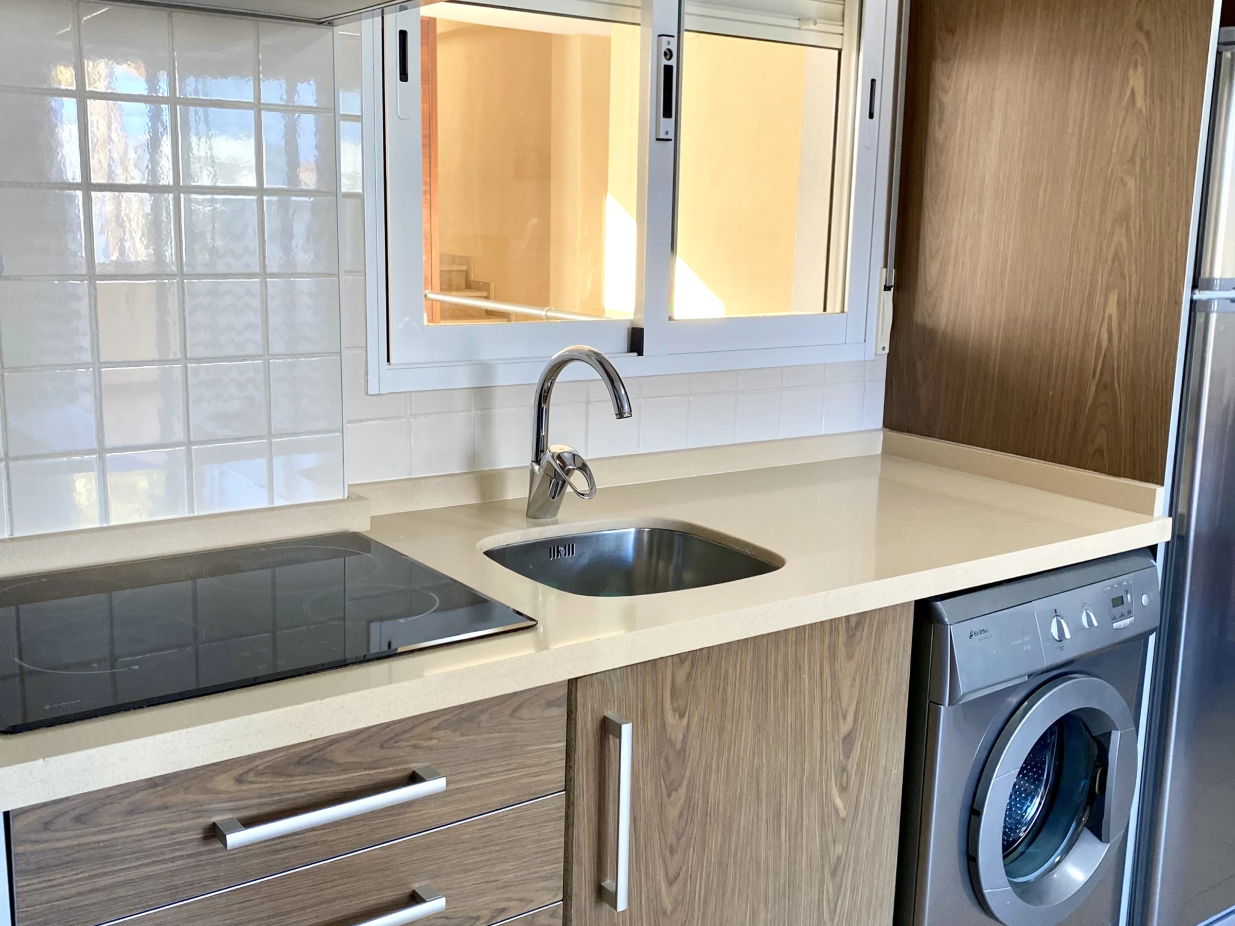 La cuisine américaine est équipée de plaques vitrocéramiques, réfrigérateur, micro-ondes, four, congélateur, lave-linge, lave-vaisselle, vaisselle/couvert, ustensiles/cuisine, cafetière, grille pain, bouilloire.