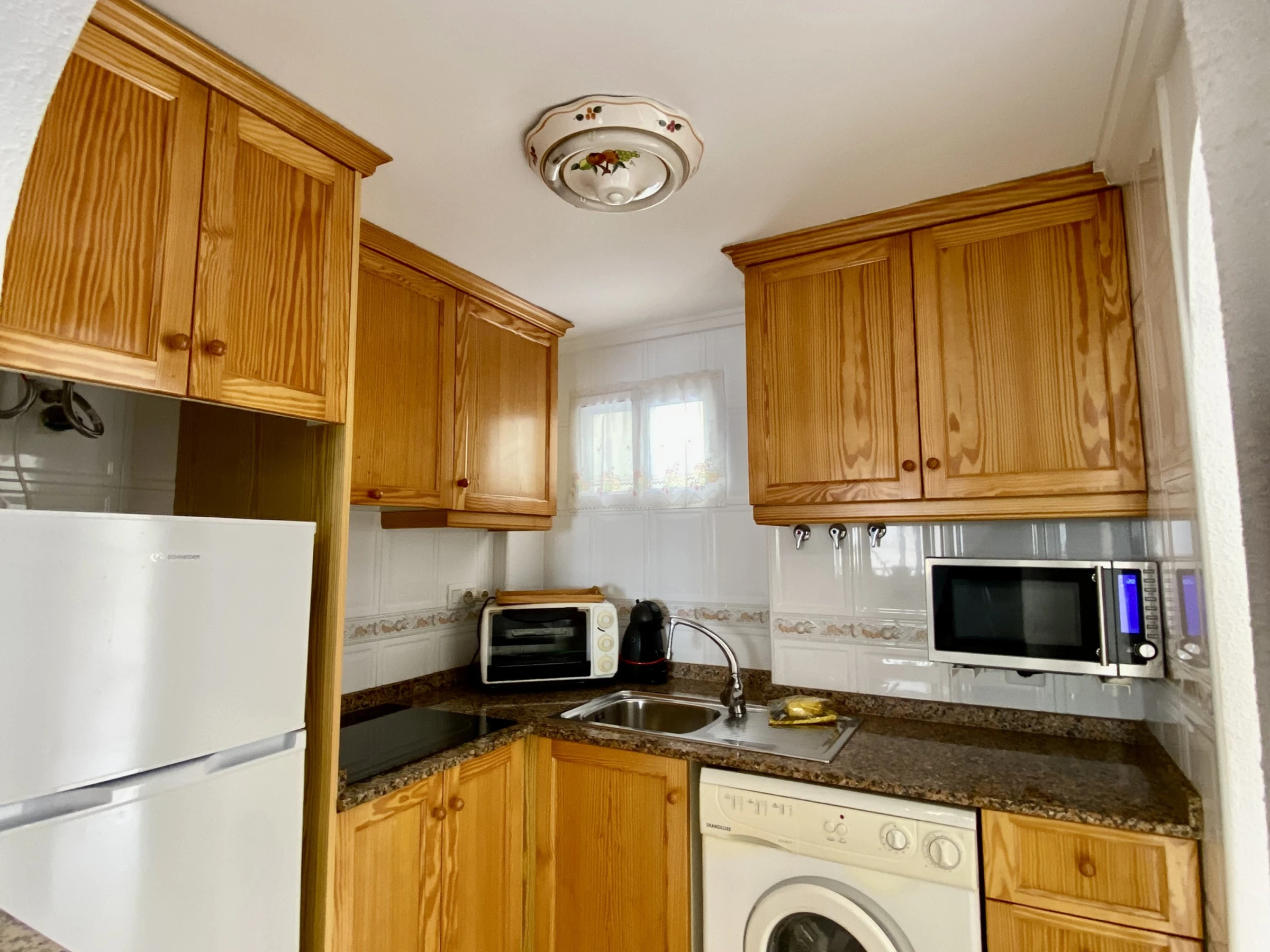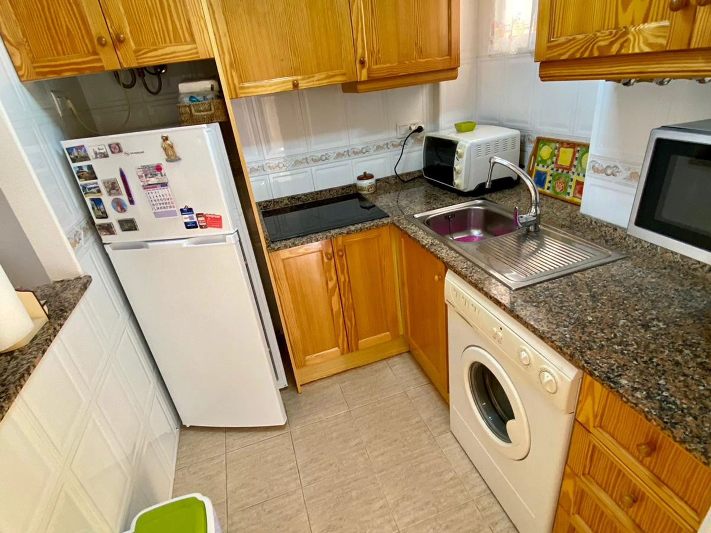 La cuisine, est équipée avec réfrigérateur, micro-ondes, congélateur, vaisselle/couverts, ustensiles/cuisine et cafetière.