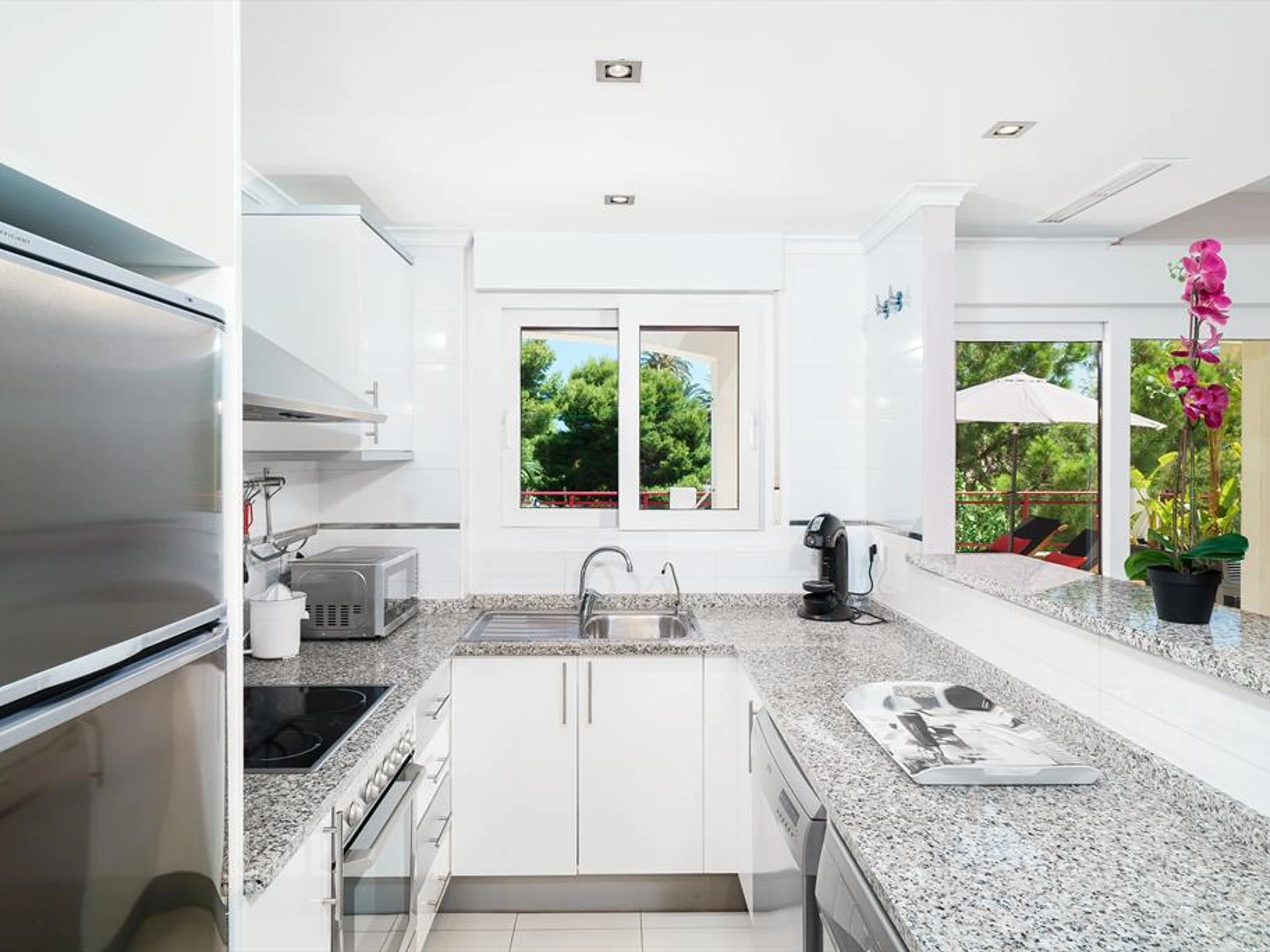 La cuisine, est équipée avec micro-ondes, four, congélateur, lave-vaisselle, cafetière et grille pain.