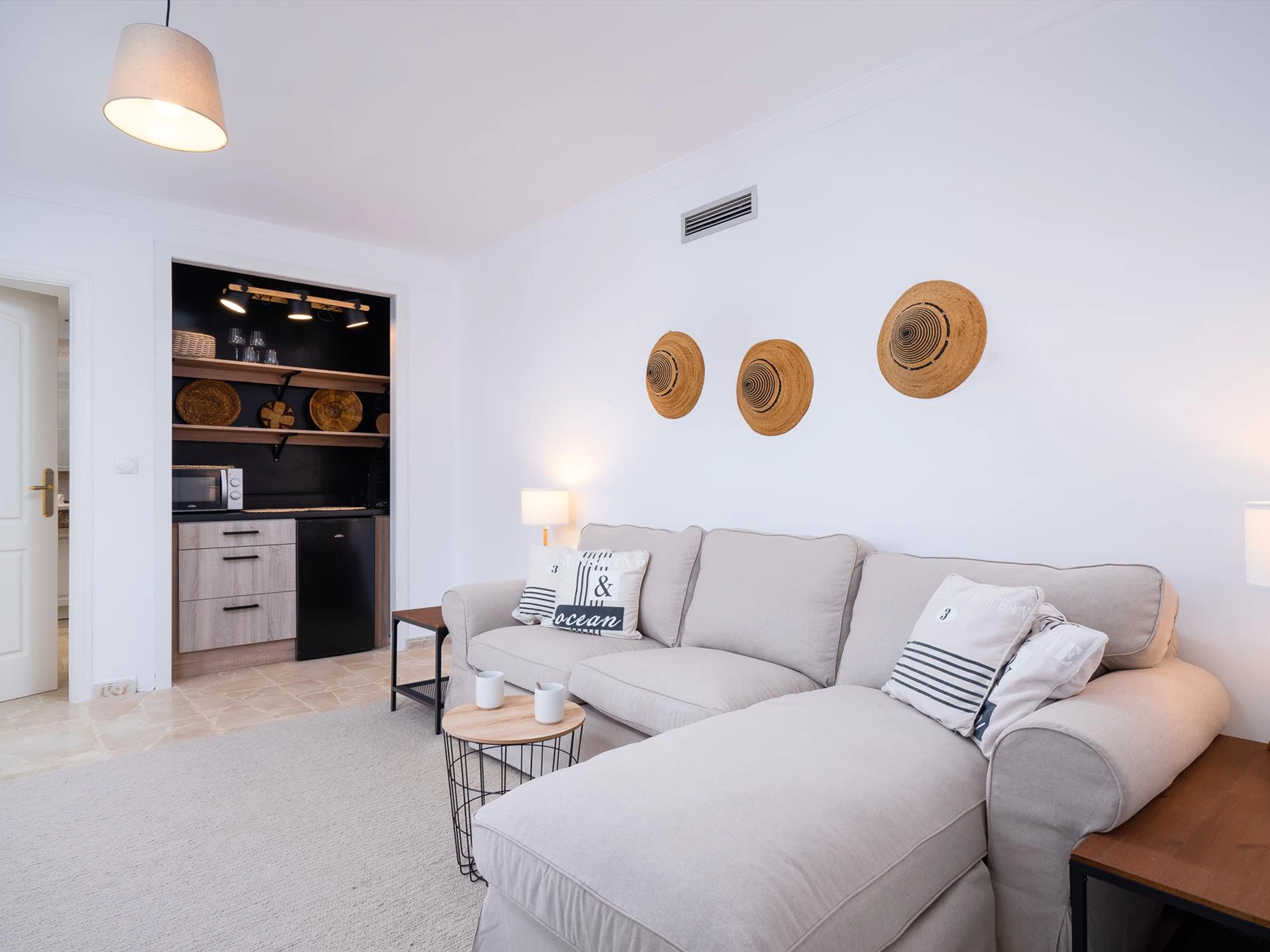 La cuisine, est équipée avec micro-ondes, four, congélateur, lave-vaisselle, cafetière et grille pain.