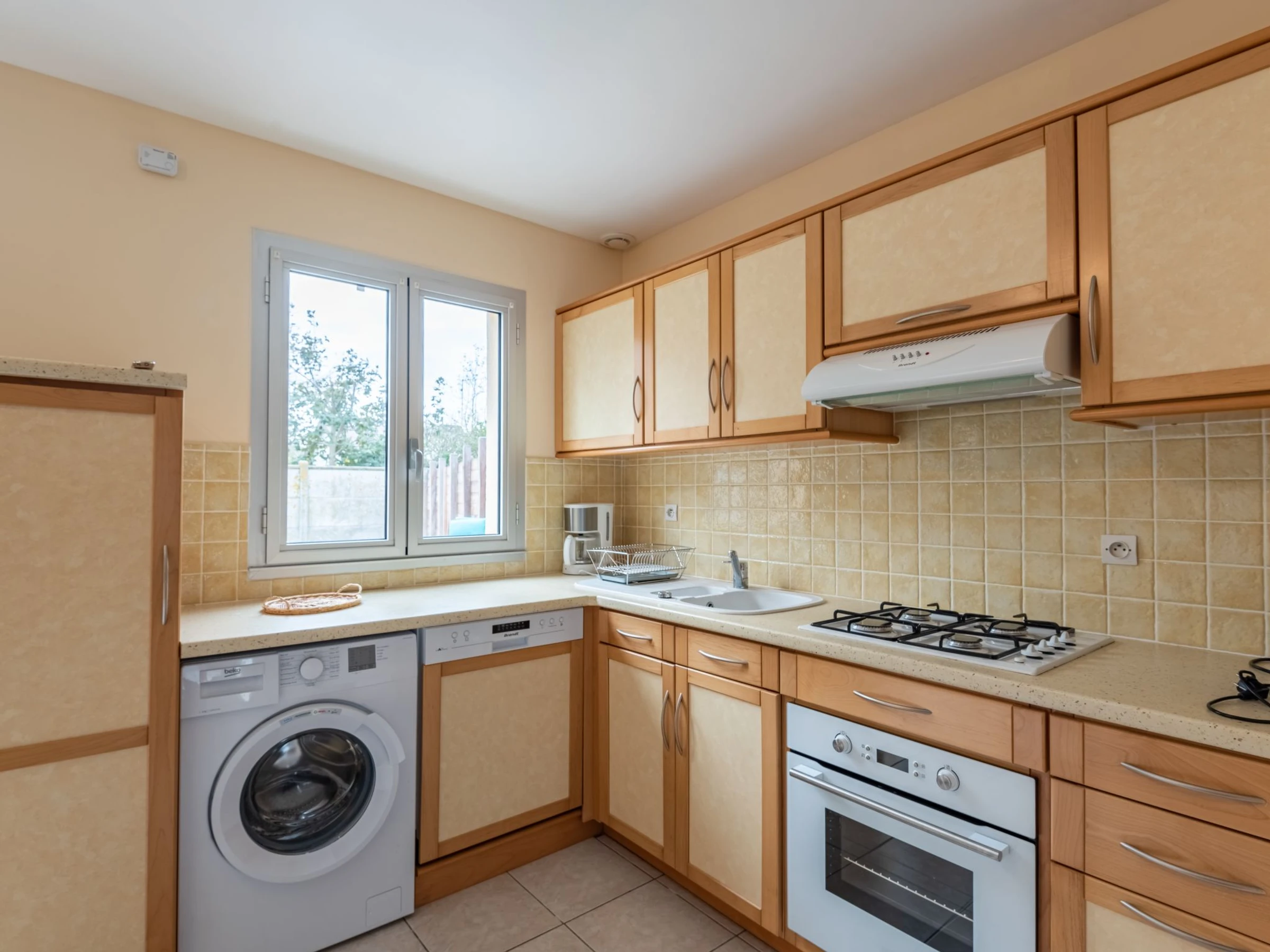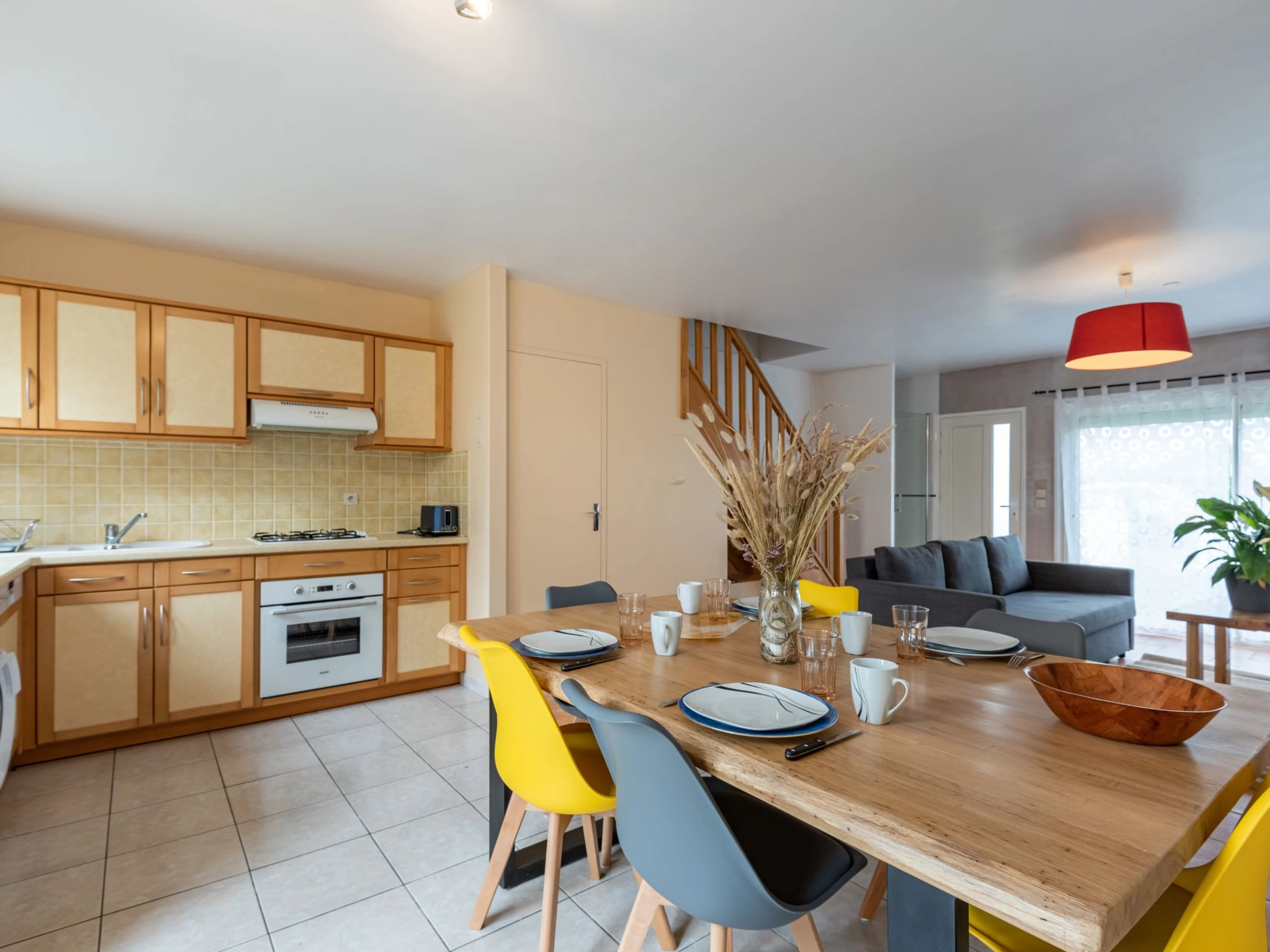 Maison mitoyenne 4 pièces 80 m2 sur 2 niveaux. Aménagement confortable et agréable: séjour/salle à manger avec coin-cuisine et TV (satellite) (écran plat). Sortie sur la terrasse. Cuisine ouverte (four, lave-vaisselle, 4 feux, grille-pain, bouilloire électrique, cafetière électrique). Douche/WC. À l'étage supérieur: 1 chambre, mansardée avec 1 grand-lit (140 cm, longueur 190 cm). 1 chambre, mansardée avec 1 grand-lit (160 cm, longueur 200 cm). 1 chambre, mansardée avec 1 x 2 lits superposés (90 cm, longueur 190 cm). Terrasse. Meubles de terrasse. A disposition: lave-linge, lit bébé. Internet (Connexion WIFI, gratuit). Veuillez noter: maison non-fumeur. Maximum 1 animal/ chien autorisé. Détecteur de fumée.