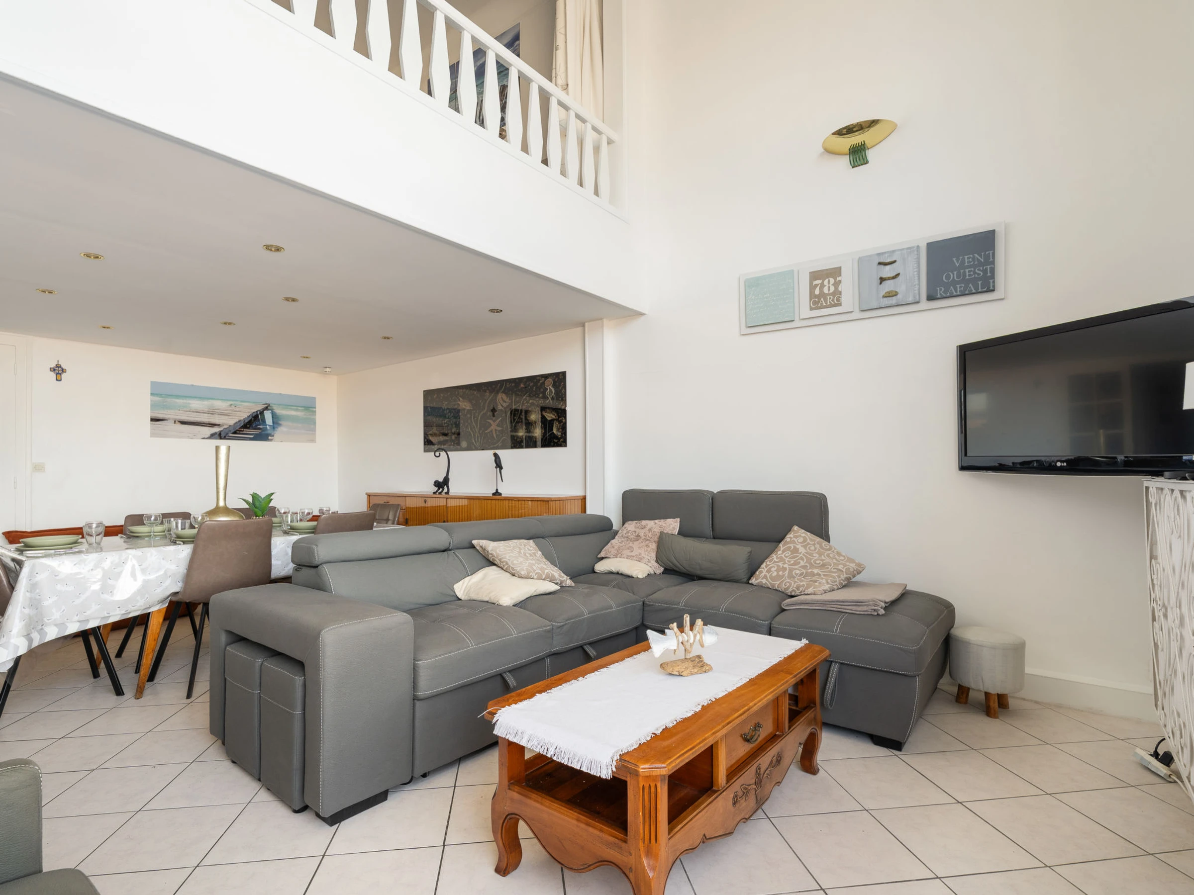 Apt 5 pièces 104 m2 sur 2 niveaux, au rez-de-chaussée. Entrée. Séjour/salle à manger avec TV (écran plat). 1 chambre, fenêtre donnant sur la cour avec 2 lits (90 cm, longueur 190 cm), douche. Cuisine ouverte (4 plaques de cuisson, four, lave-vaisselle, grille-pain, bouilloire électrique, micro-ondes, cafetière électrique, Capsules pour machine à café (Nespresso) (NON INCLUSES)). WC séparé. À l'étage supérieur: 1 chambre, ouverte avec 1 grand-lit (1 x 180 cm, longueur 200 cm). 1 chambre, ouverte avec 1 grand-lit (1 x 180 cm, longueur 200 cm). 1 chambre, fenêtre donnant sur la cour avec 1 grand-lit (1 x 180 cm, longueur 200 cm). Bain/WC. Chauffage au gaz. Belle vue sur la mer. A disposition: lave-linge. Internet (Connexion WIFI). Place de parking (3 Voitures). Veuillez noter: logement non-fumeur. Détecteur de fumée. Veuillez noter les chambres en mezzanine situées à l’étage comportent une rambarde d’une hauteur de 60 cm.