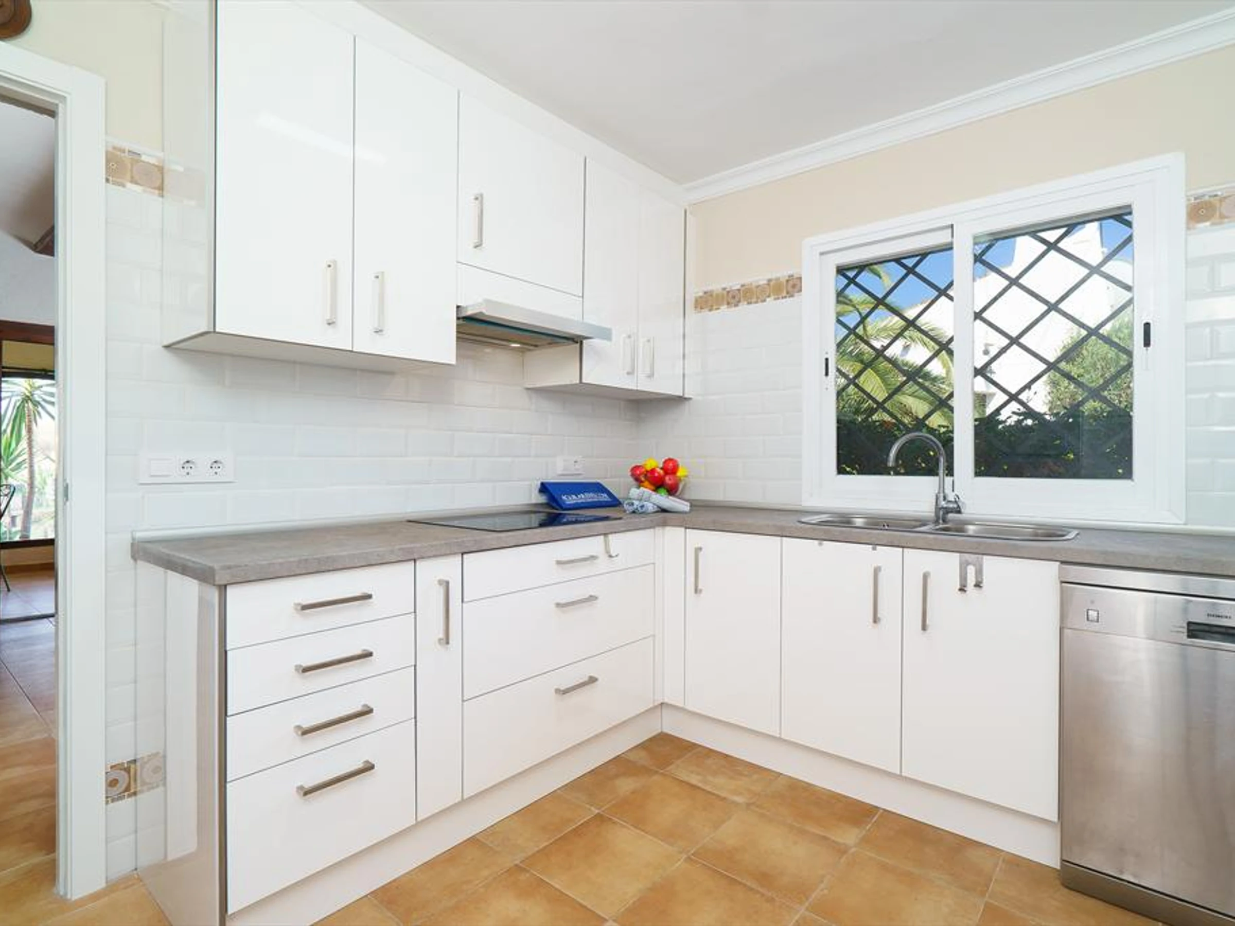La cuisine, est équipée avec micro-ondes, four, congélateur, lave-vaisselle, cafetière et grille pain.