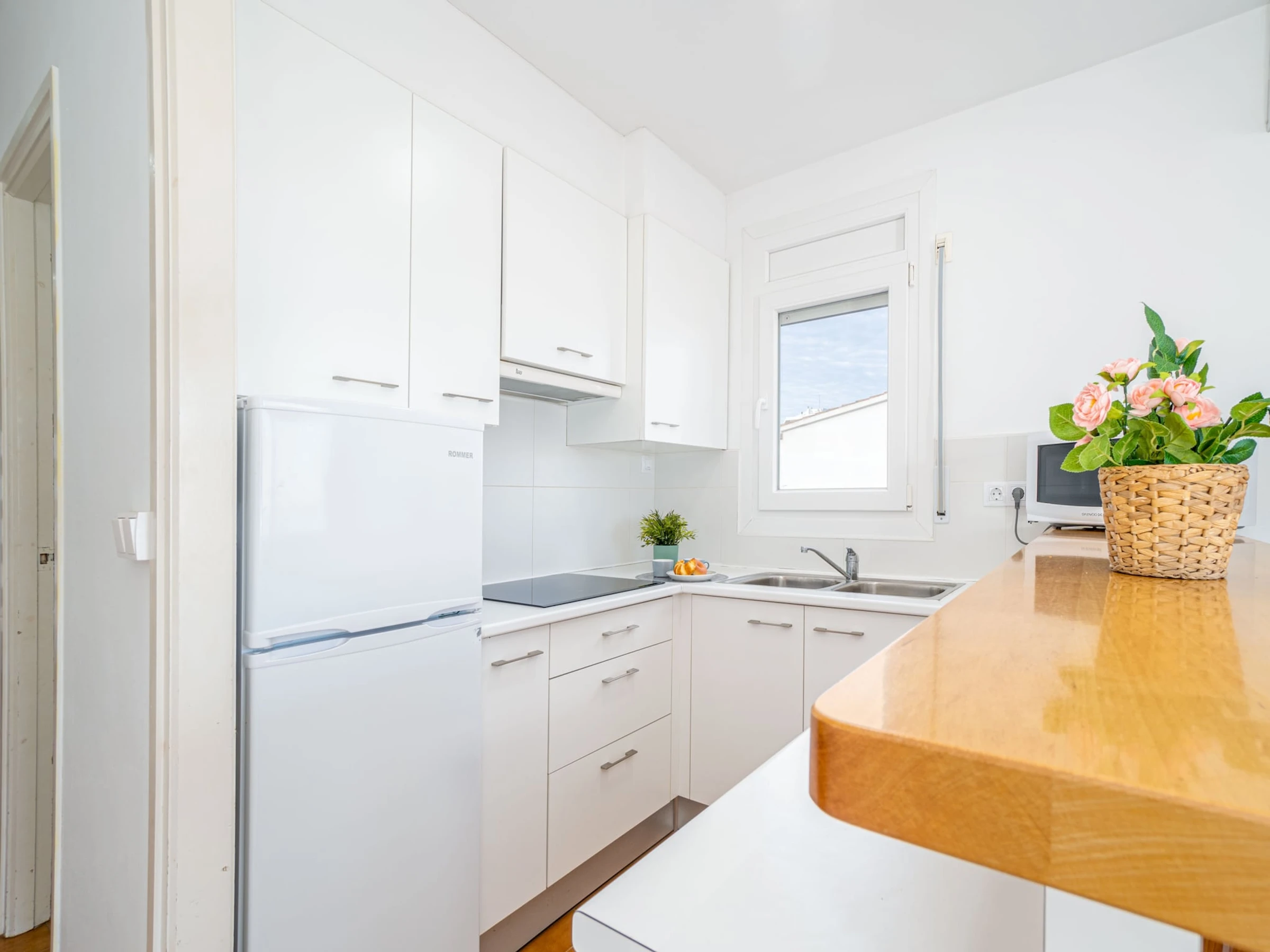 La cuisine, est équipée avec réfrigérateur, micro-ondes, cafetière et grille pain.