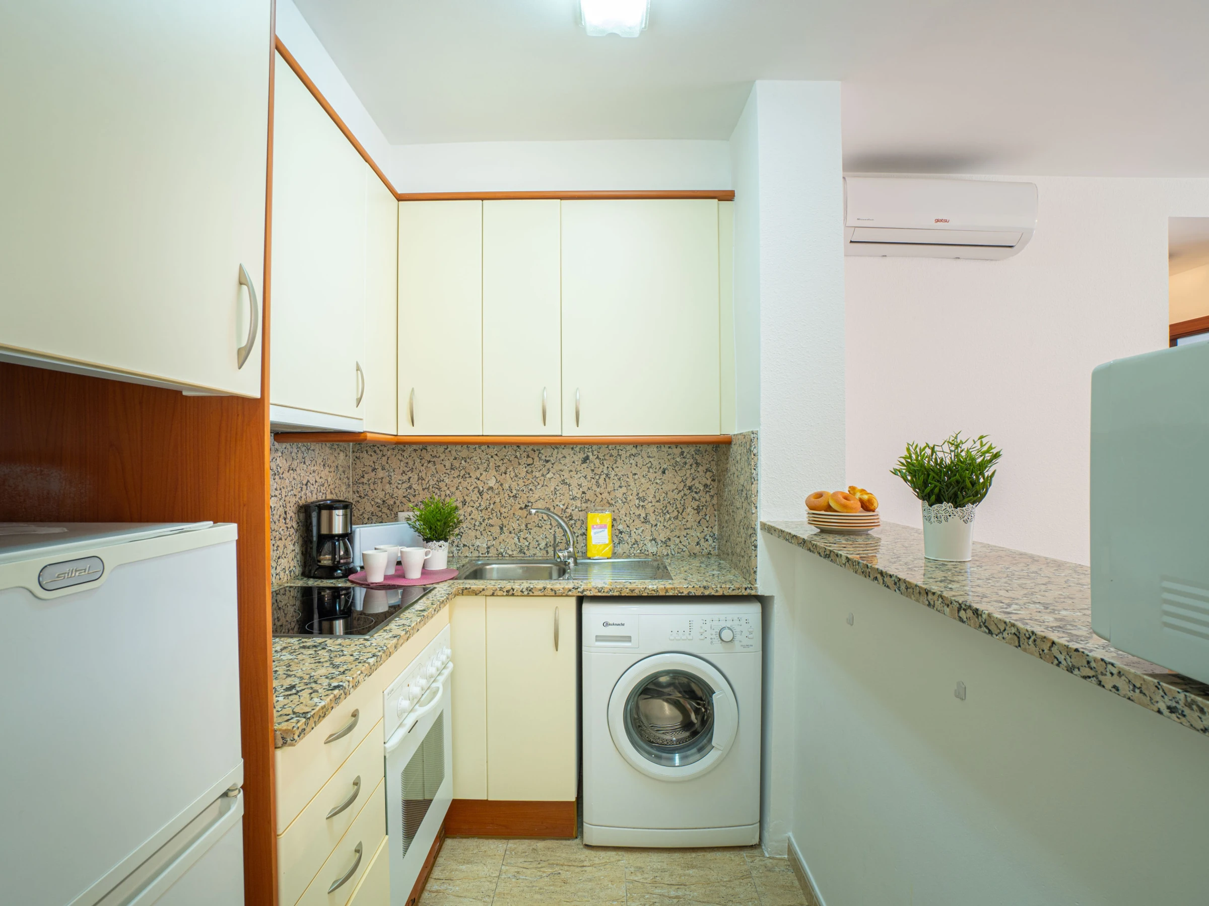 La cuisine américaine, avec plaques vitrocéramiques, est équipée d’un réfrigérateur, micro-ondes, four, vaisselle/couverts, ustensiles de cuisine, cafetière, grille-pain et bouilloire.