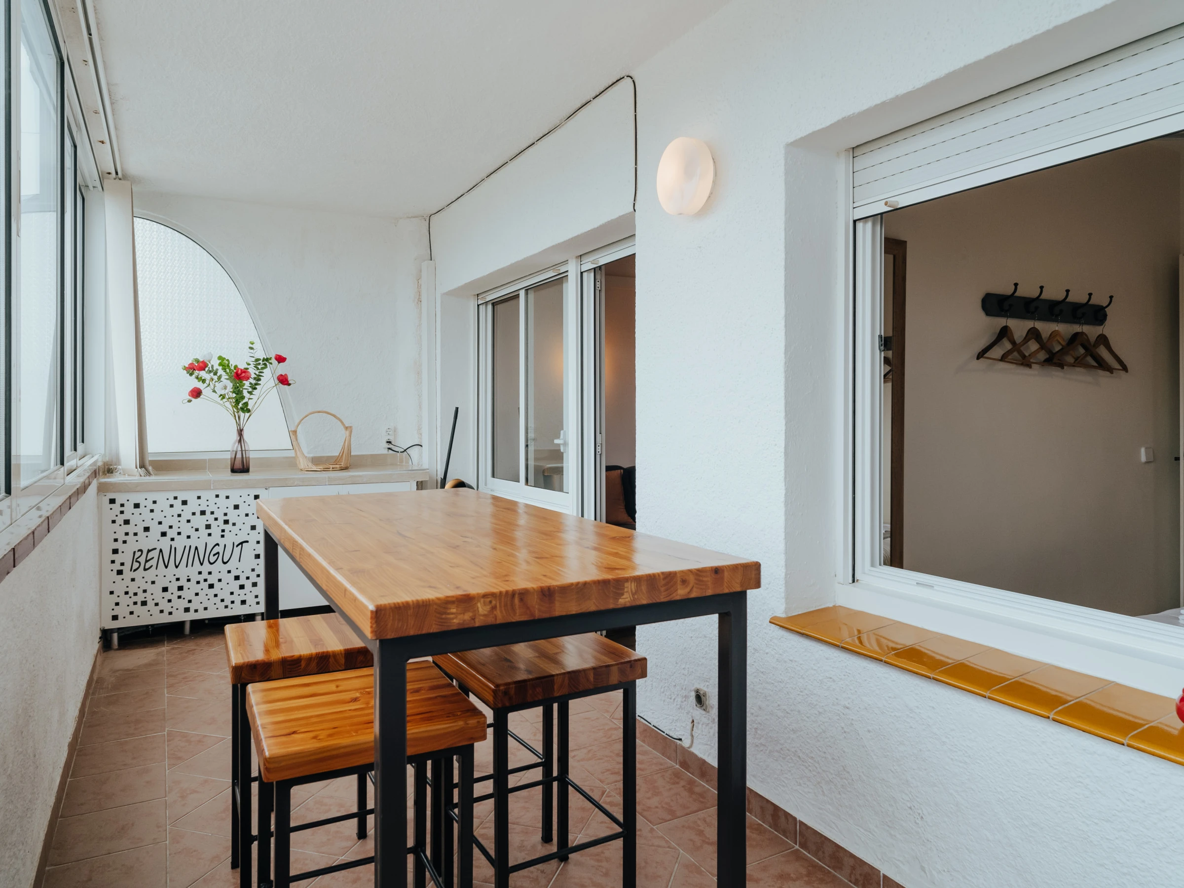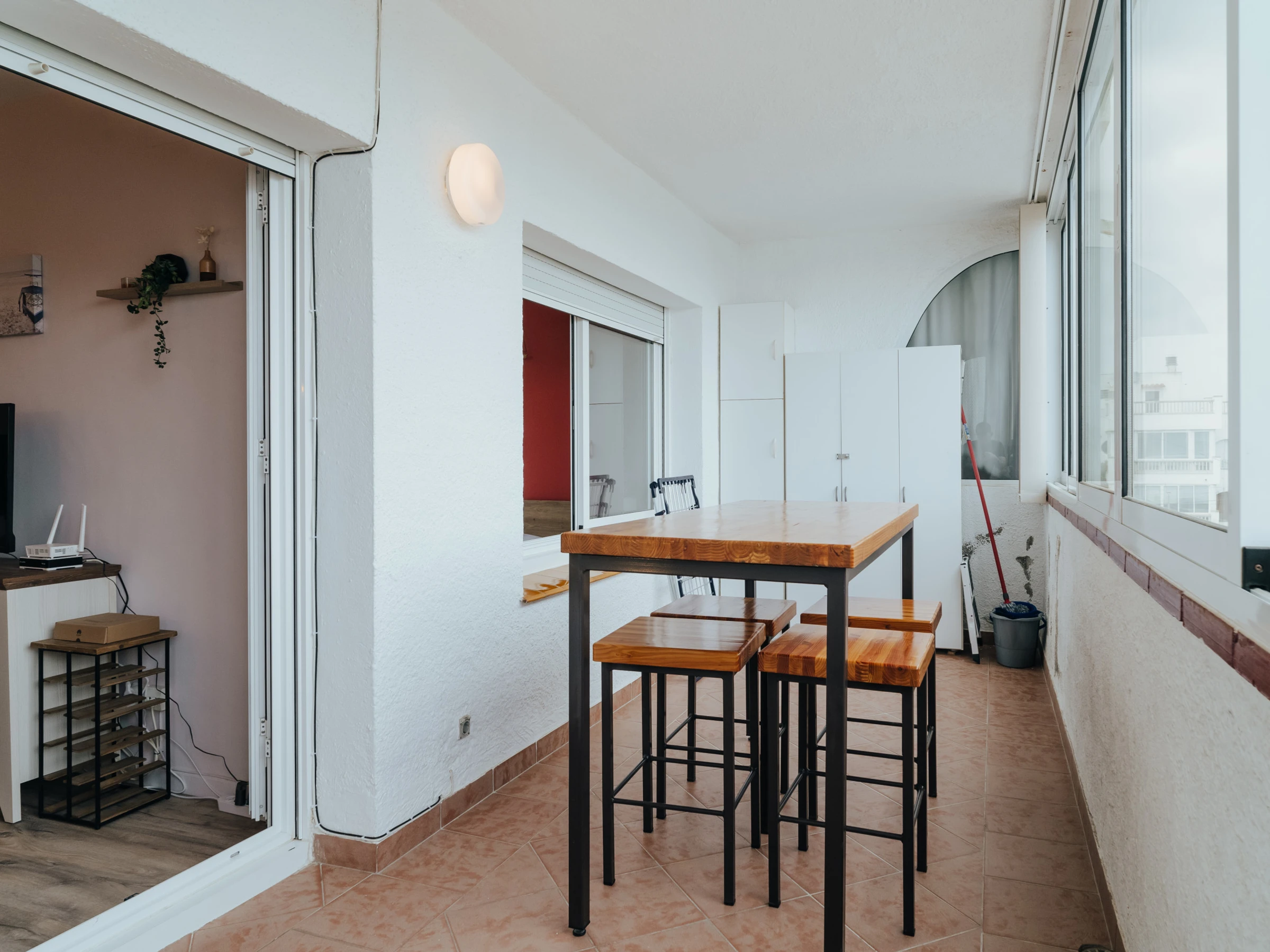 Un vaste et lumineux salon avec coin repas et un confortable canapé-lit. Le salon est également équipé d'une télévision avec Smart TV et d\'un climatiseur, et vous pourrez accéder à la terrasse meublée, où vous pourrez vous détendre avec une tasse de café.