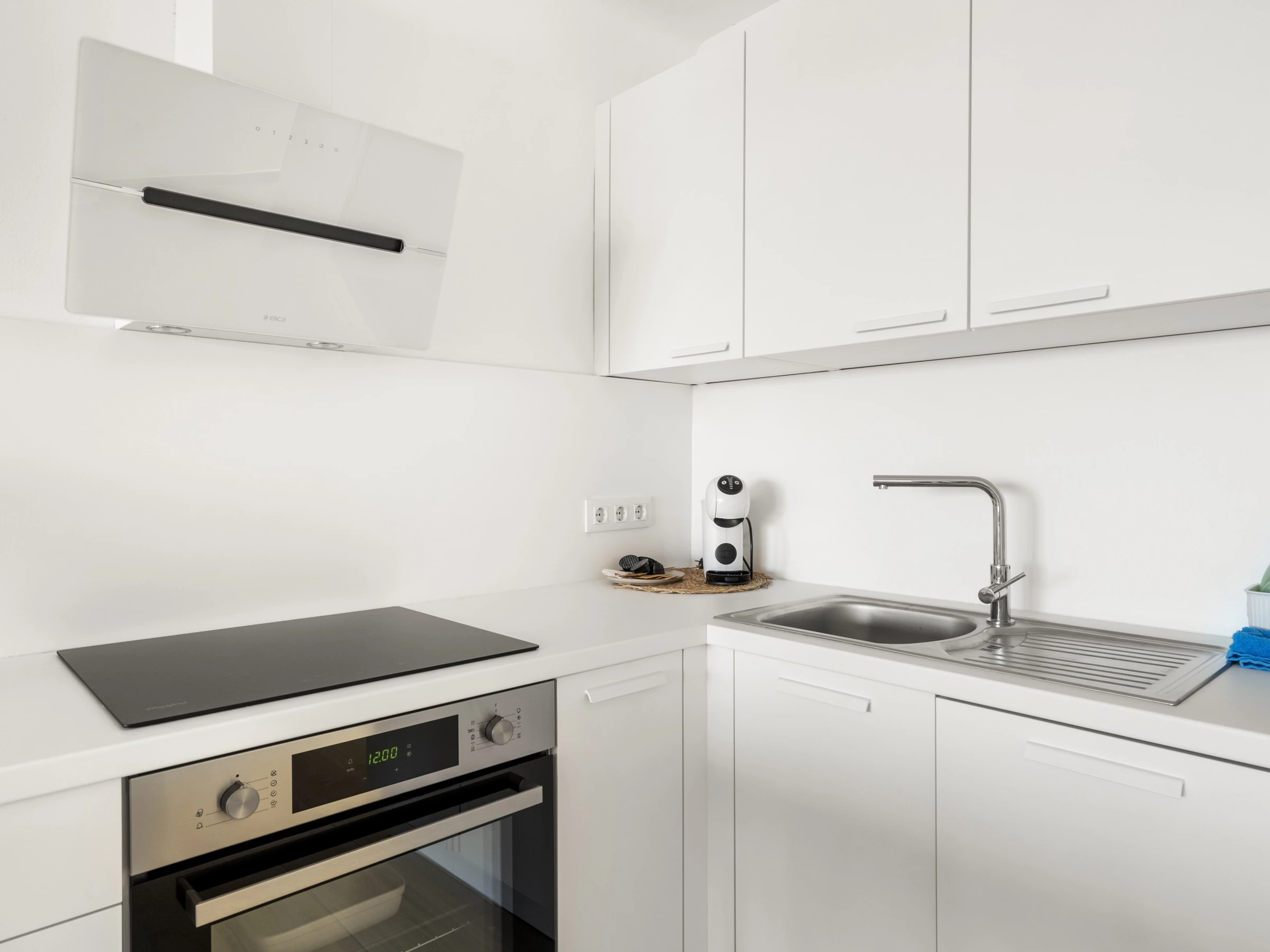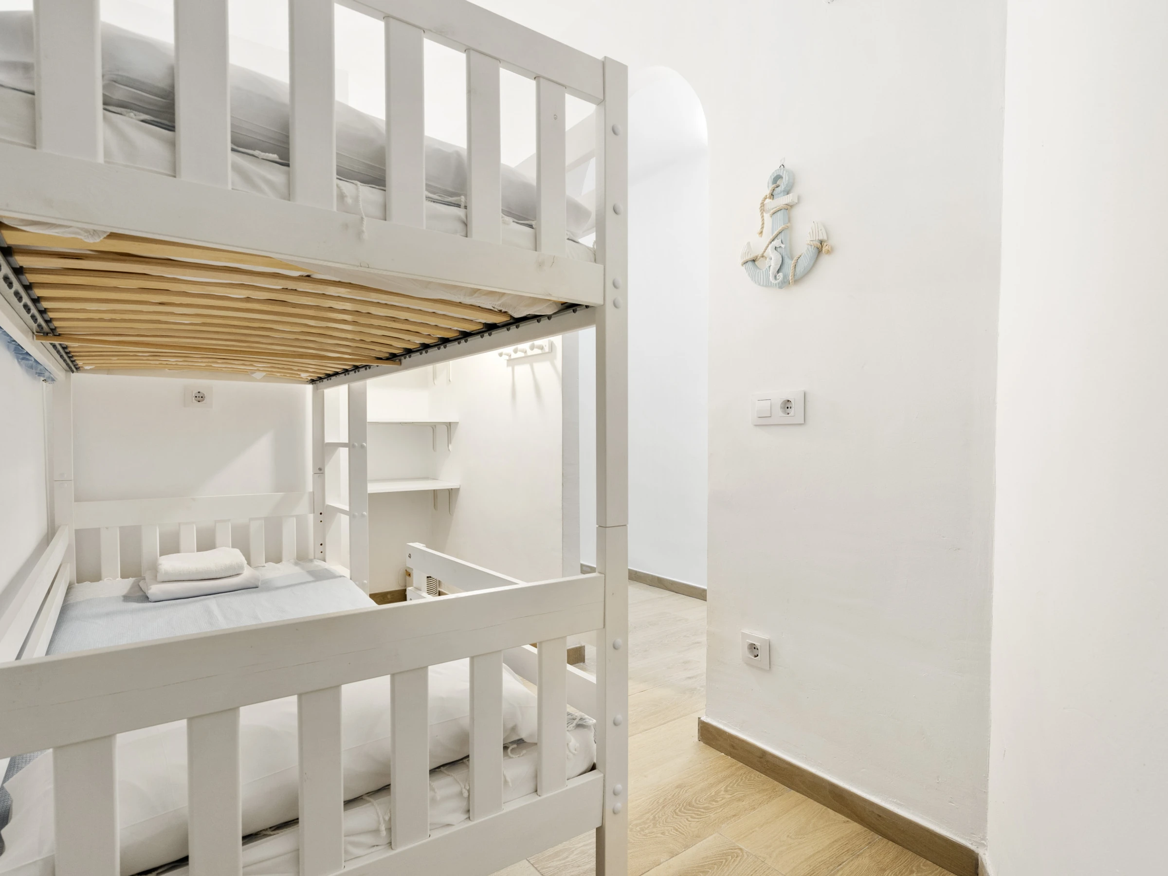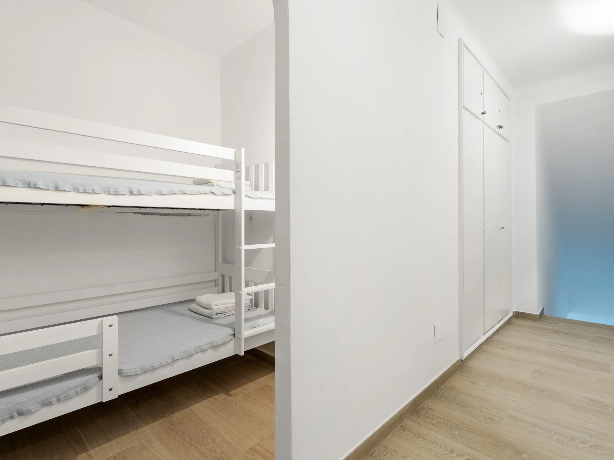 L'appartement dispose de deux zones de couchage. La première chambre comprend un lit double, des meubles et la climatisation. La deuxième chambre est équipée d'un lit superposé. Il y a une salle de bains.