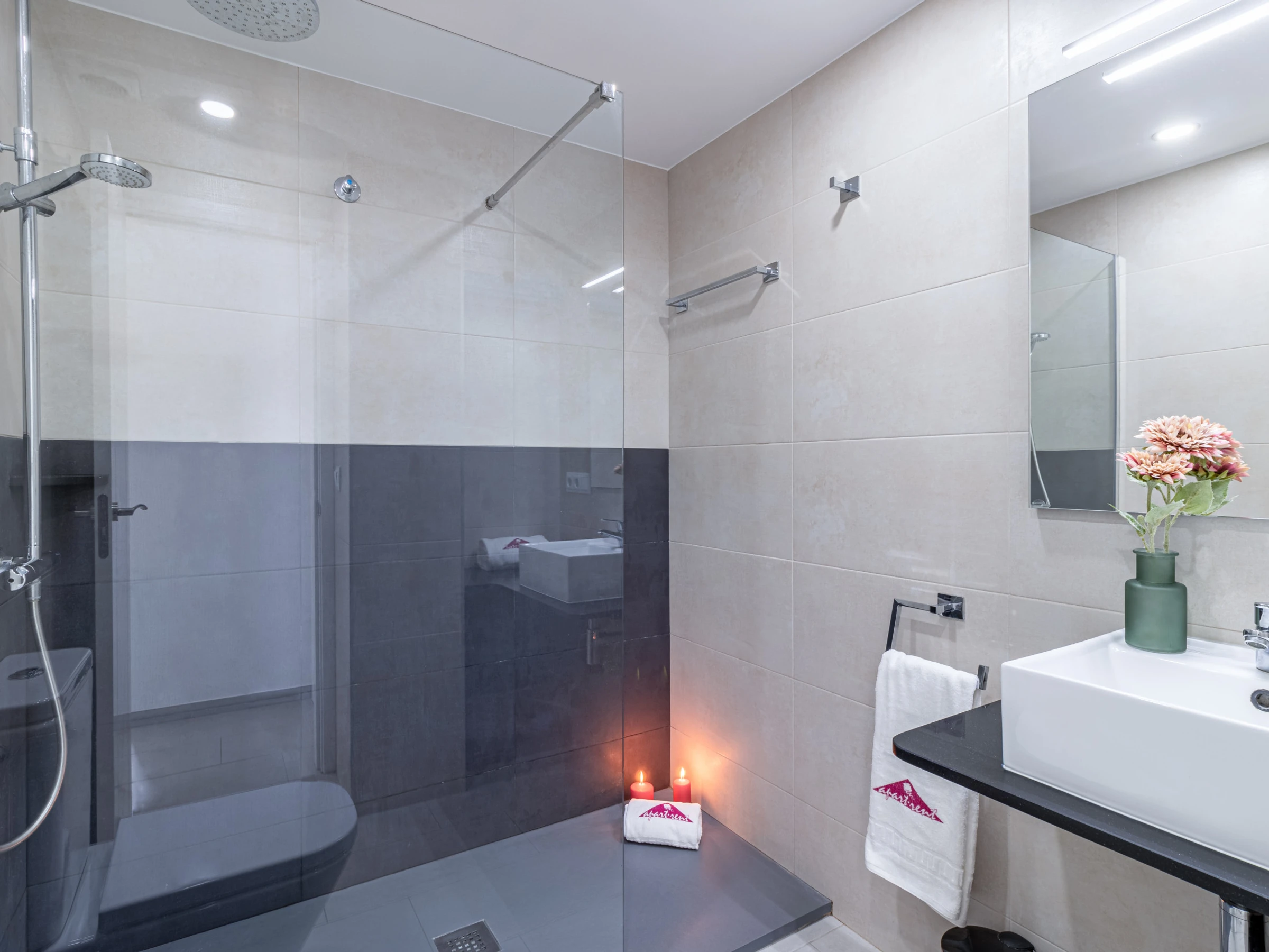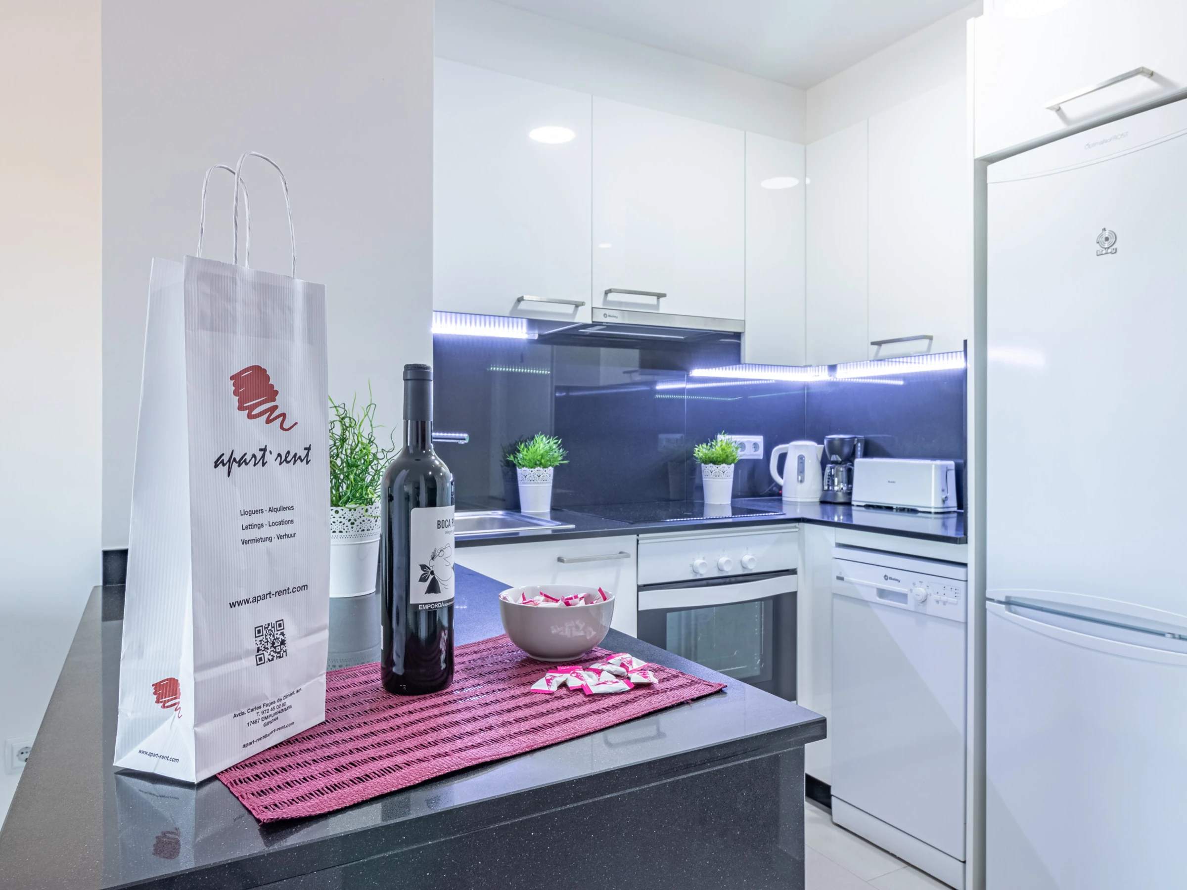La cuisine américaine avec plaques vitrocéramiques est équipée d’un réfrigérateur, micro-ondes, four, congélateur, lave-linge, lave-vaisselle, vaisselle/couverts, ustensiles de cuisine, cafetière et grille-pain.