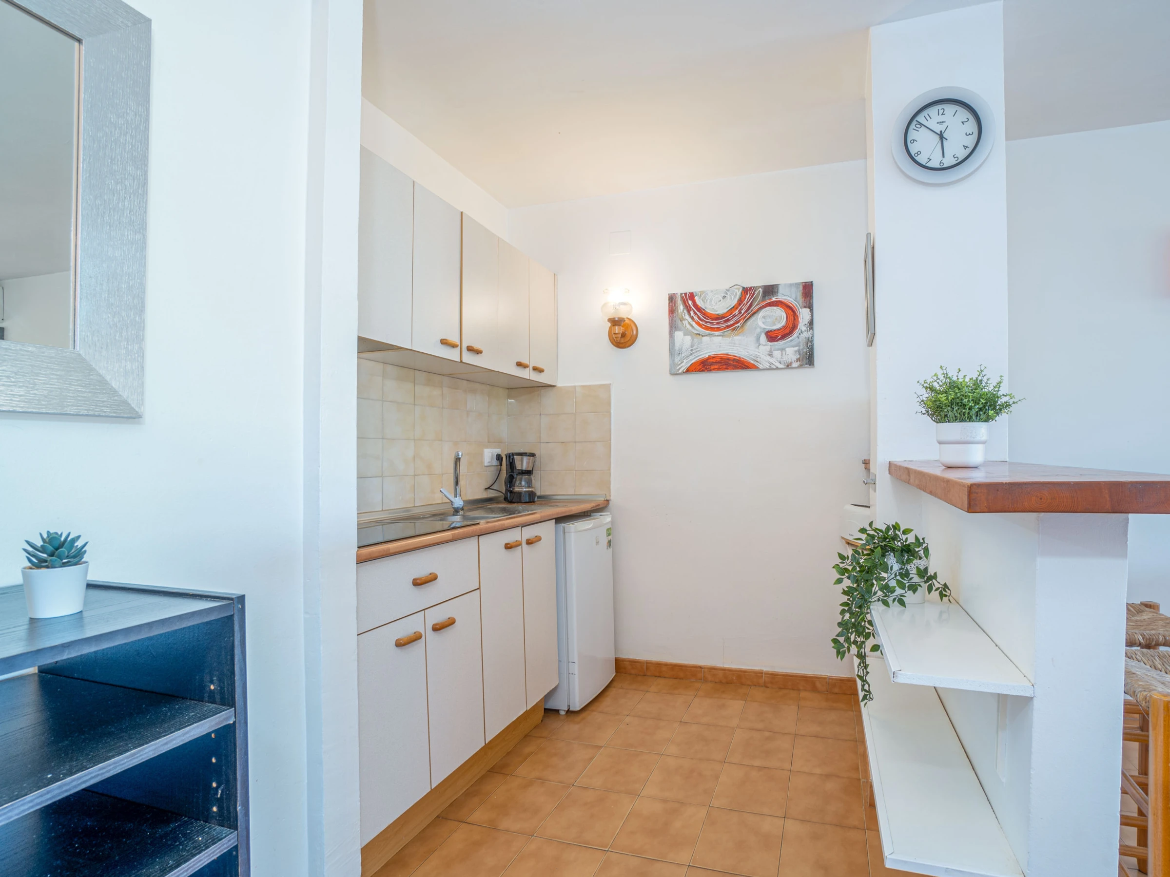 La cuisine américaine avec plaques vitrocéramiques est équipée d’un réfrigérateur, micro-ondes, lave-linge, vaisselle, ustensiles de cuisine et cafetière.