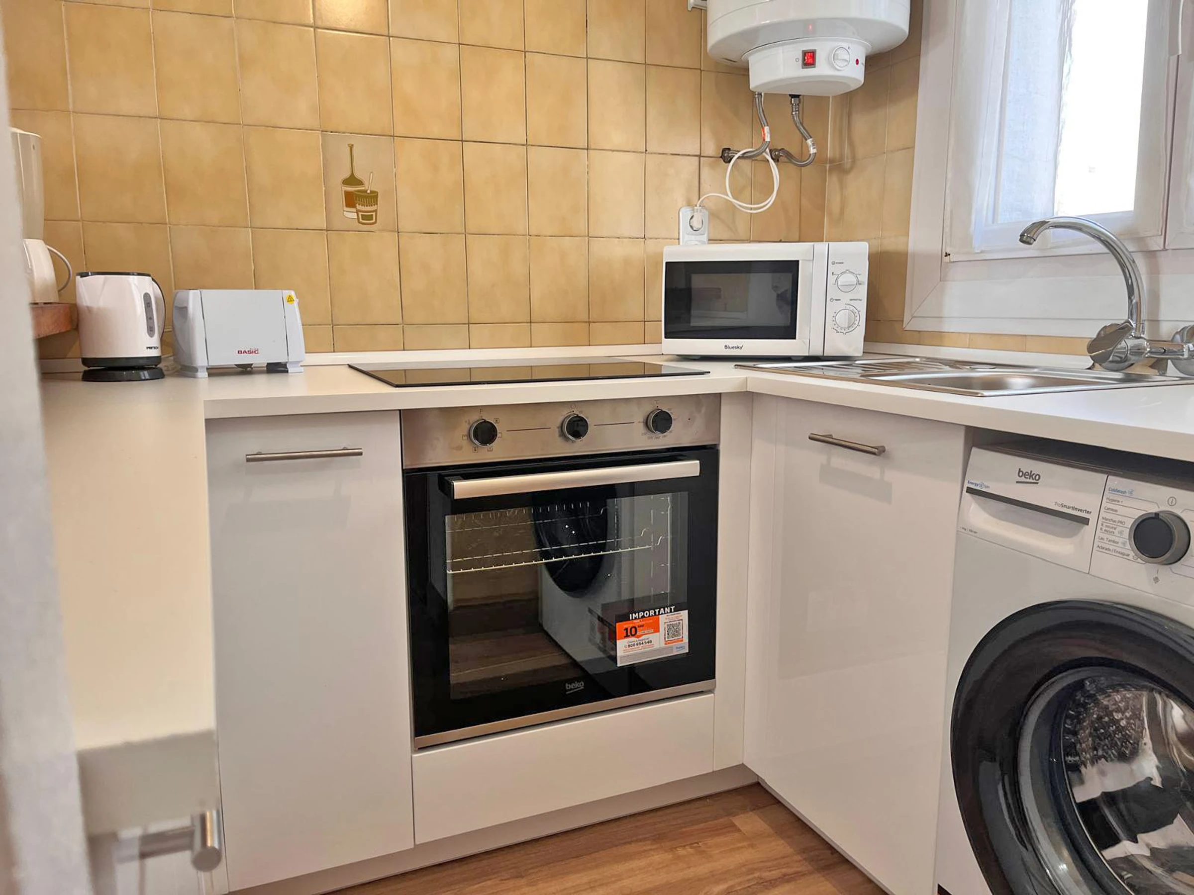 La cuisine américaine avec plaques vitrocéramiques est équipée d’un réfrigérateur, micro-ondes, four, congélateur, lave-linge, vaisselle/couverts, ustensiles de cuisine, cafetière, grille-pain et bouilloire.