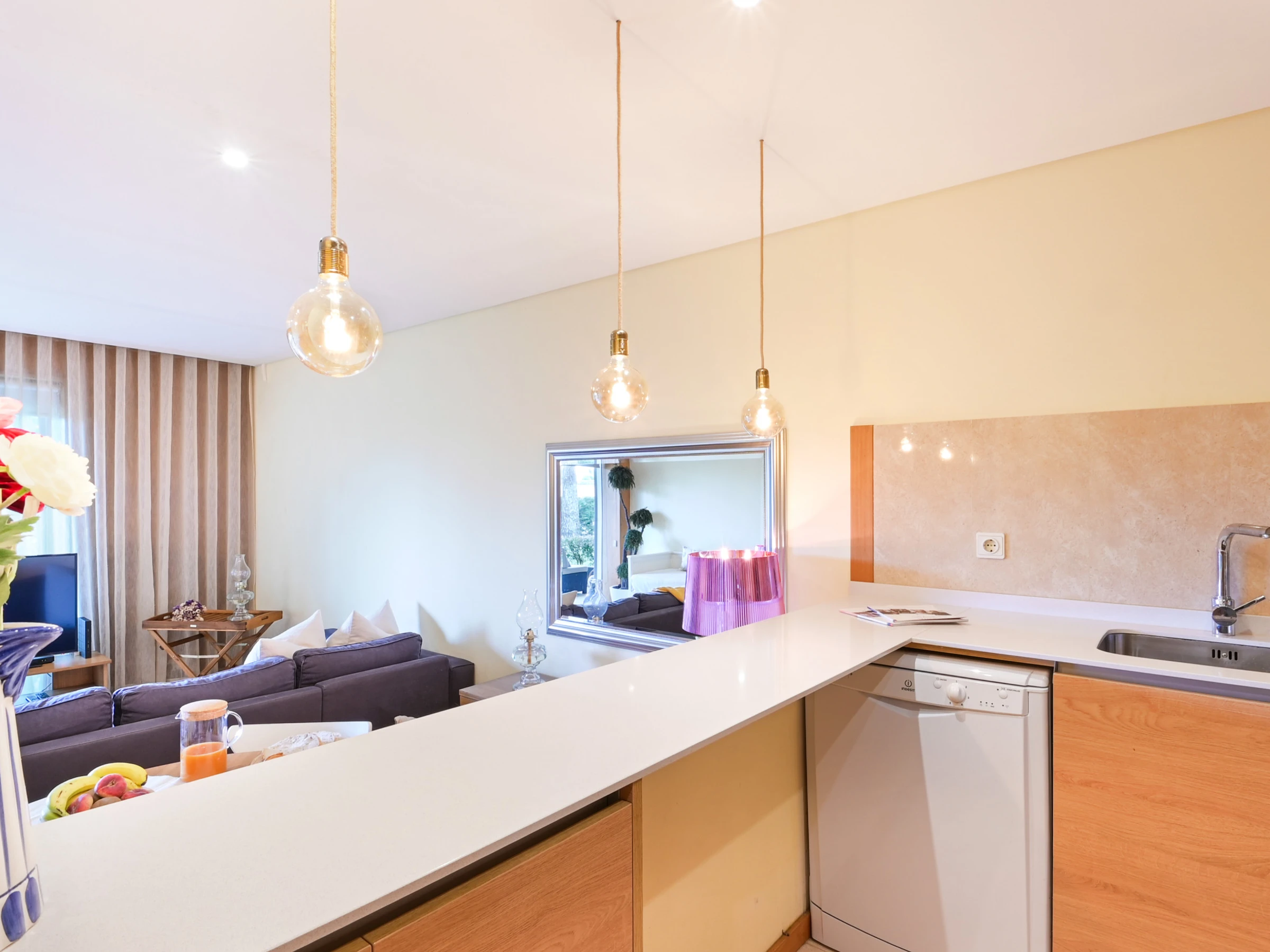 La cuisine, est équipée avec réfrigérateur, micro-ondes, four, congélateur, lave-vaisselle, vaisselle/couverts, ustensiles/cuisine, cafetière, grille pain et bouilloire.