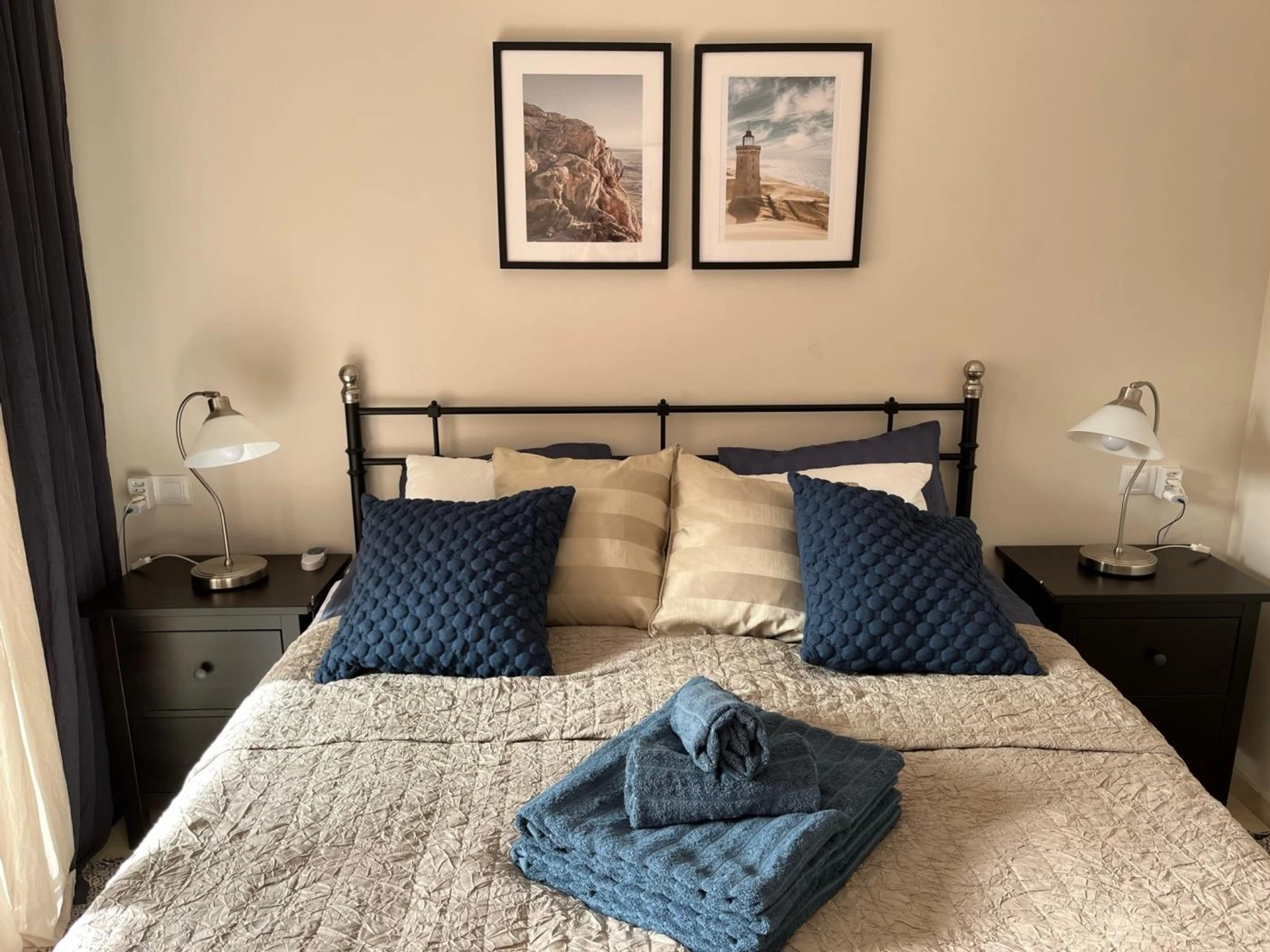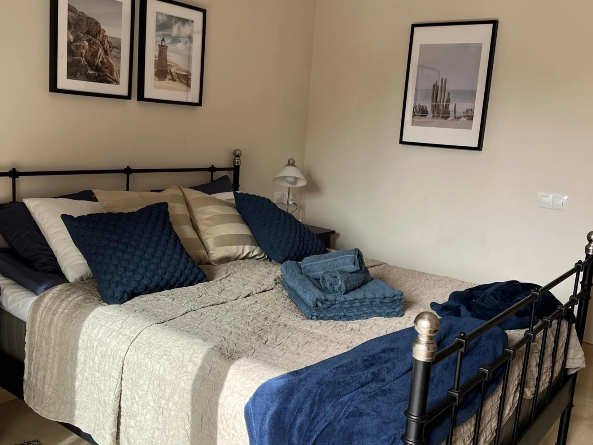 L'appartement comprend trois chambres spacieuses et deux salles de bains, dont une suite parentale avec un lit double, une salle de bains privative et un accès à la terrasse. Les deux autres chambres offrent des espaces plus intimes – l'une avec un lit double et l'autre avec deux lits simples – idéales pour un séjour en famille ou entre amis.