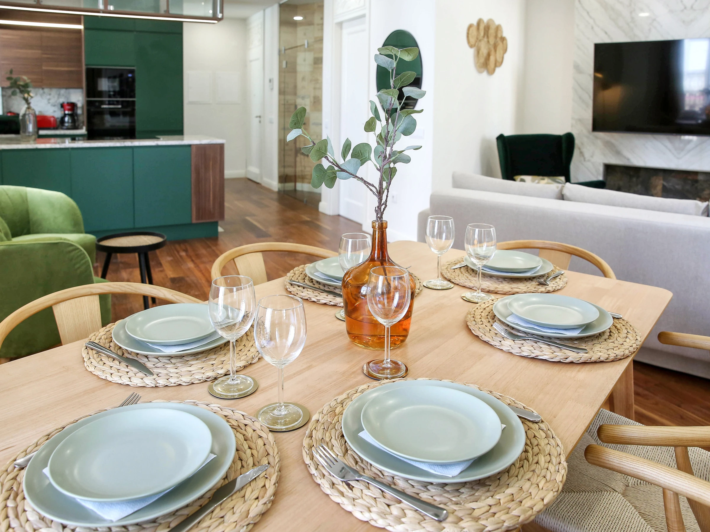 La cuisine américaine, à vitrocéramique, est équipée avec réfrigérateur, micro-ondes, four, congélateur, lave-vaisselle, vaisselle/couverts, ustensiles/cuisine, cafetière, grille pain et bouilloire.