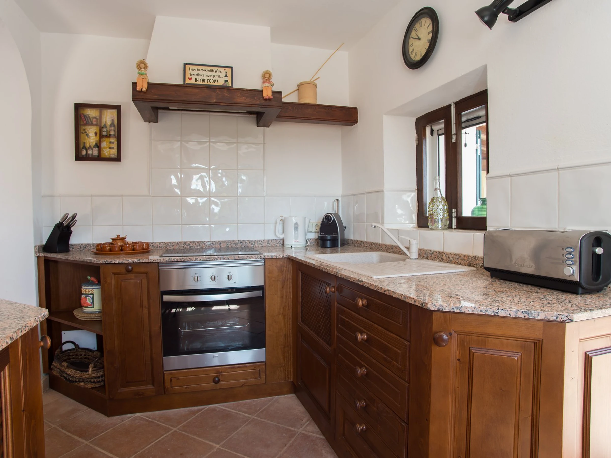 La cuisine, est équipée avec réfrigérateur, micro-ondes, four, cafetière, grille pain et bouilloire.