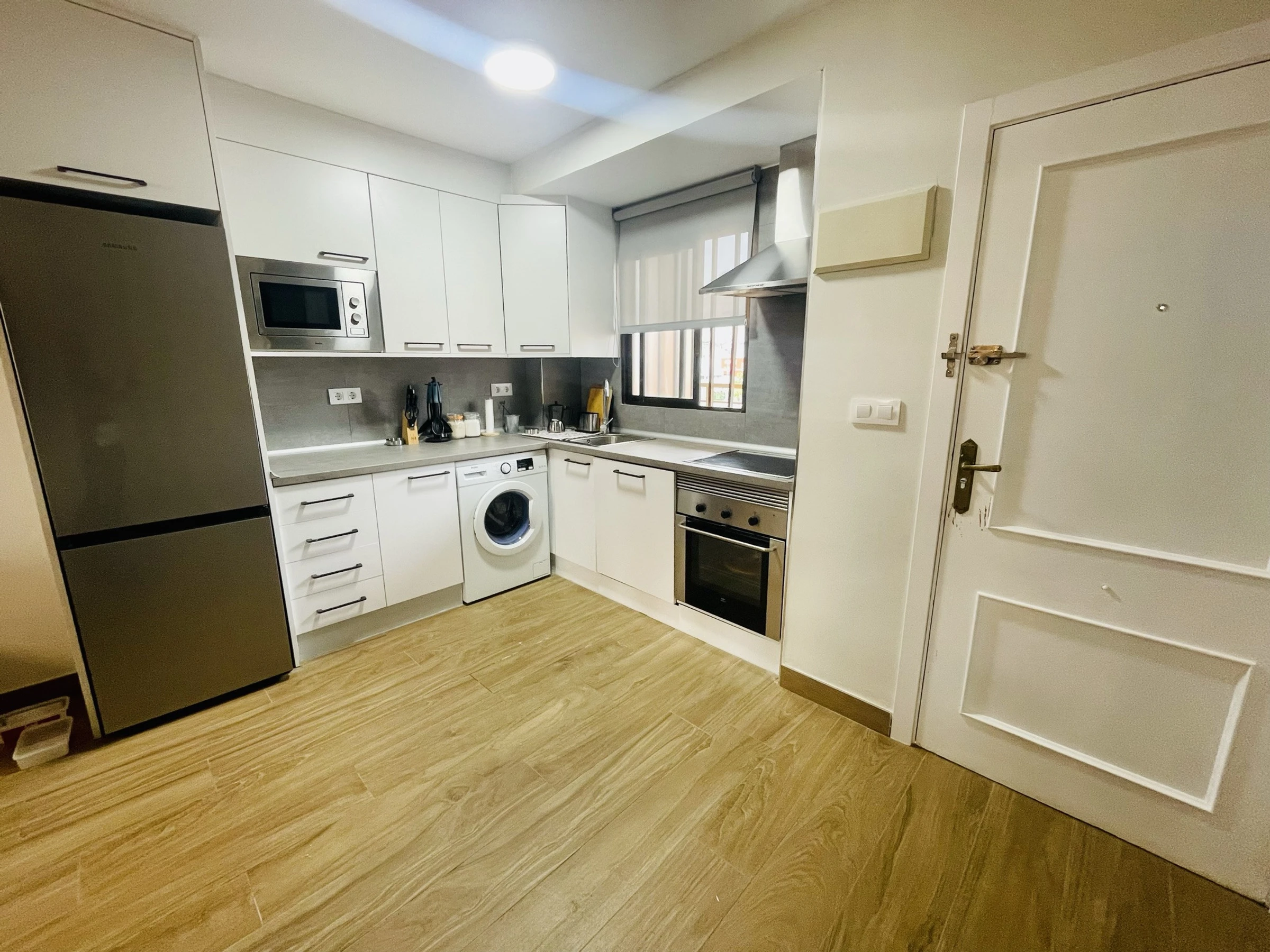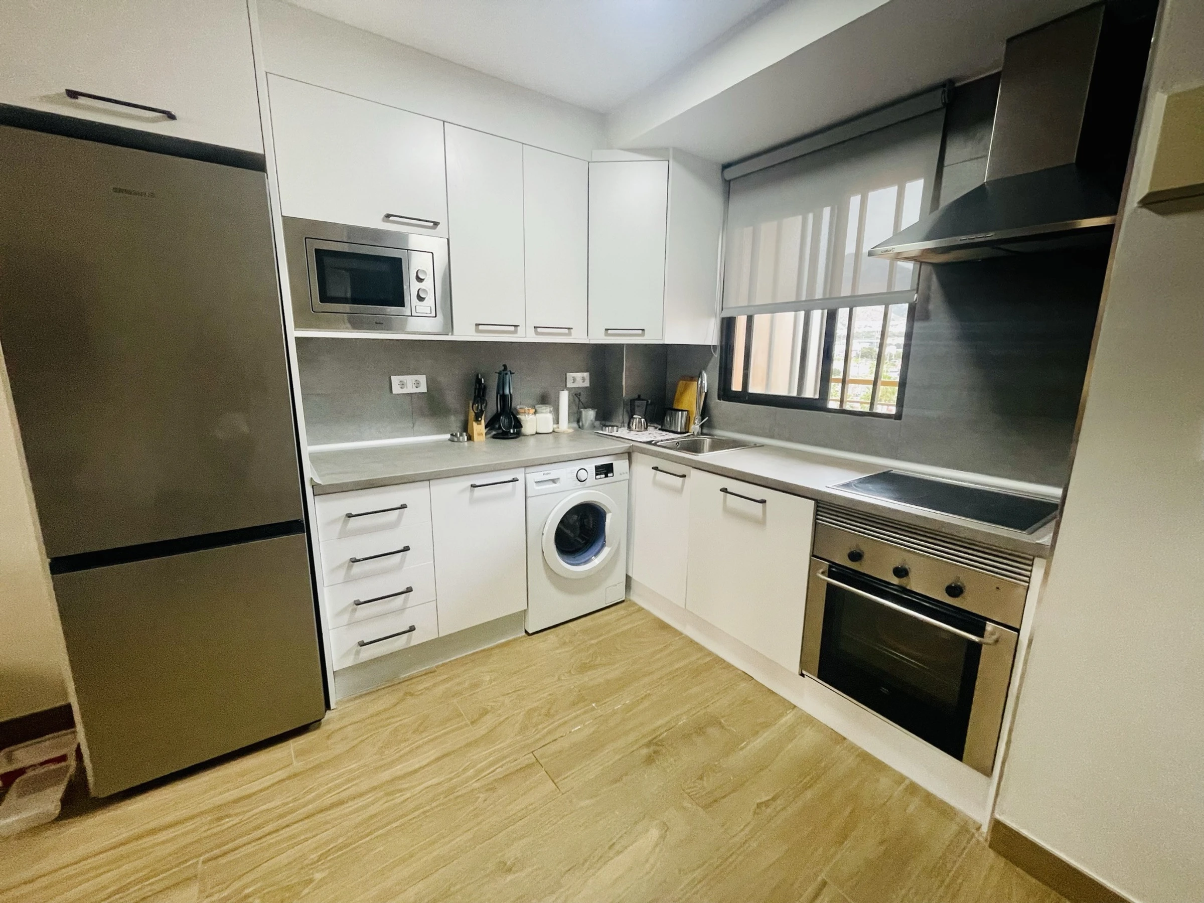 Cuisine équipée avec plaque vitrocéramique, réfrigérateur, micro-ondes, four, congélateur et tous les ustensiles nécessaires.