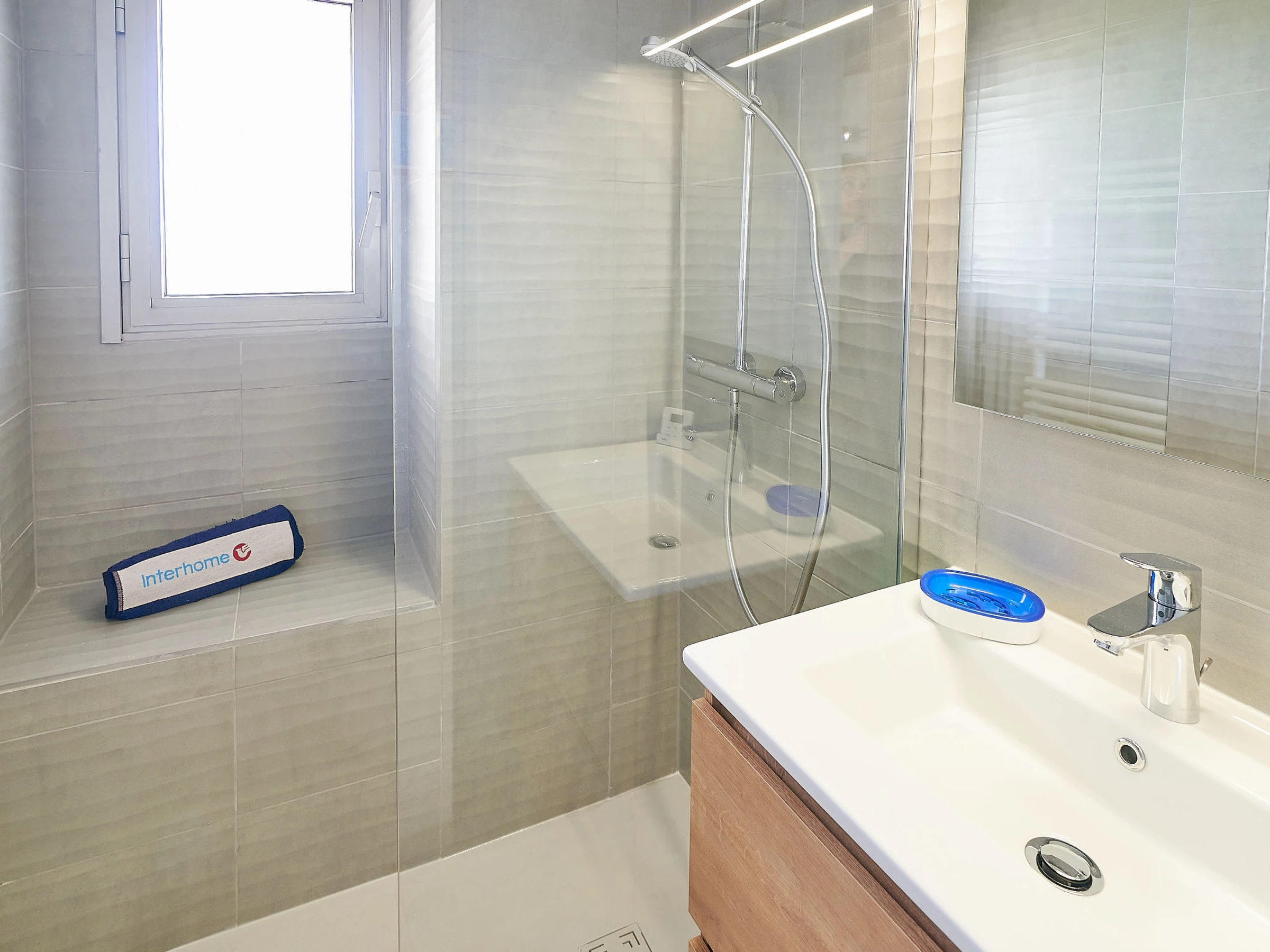 Apt 2 pièces 27 m2 au 3ème étage. Séjour/salle à manger avec 1 divan-lit double (1 x 140 cm, longueur 190 cm), TV, chauffage électrique et air-conditionné. Sortie sur la terrasse. 1 chambre avec 1 grand-lit (1 x 140 cm, longueur 190 cm), air-conditionné. Coin cuisine (2 plaques vitrocéramiques, grille-pain, bouilloire électrique, cafetière électrique, combiné micro-ondes). Douche, WC séparé. Chauffage électrique. Terrasse 12 m2, situation sud-est terrasse 6 m2, situation sud-ouest. Vue sur la mer. A disposition: lave-linge, fer à repasser, sèche-cheveux. Internet (Connexion WIFI, en sus). Place de parking No 6. Veuillez noter: logement non-fumeur. Maximum 1 animal/ chien autorisé. Détecteur de fumée.