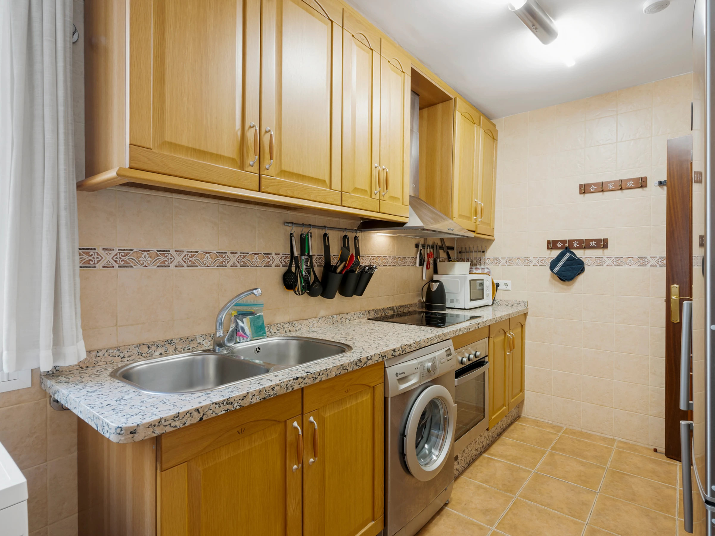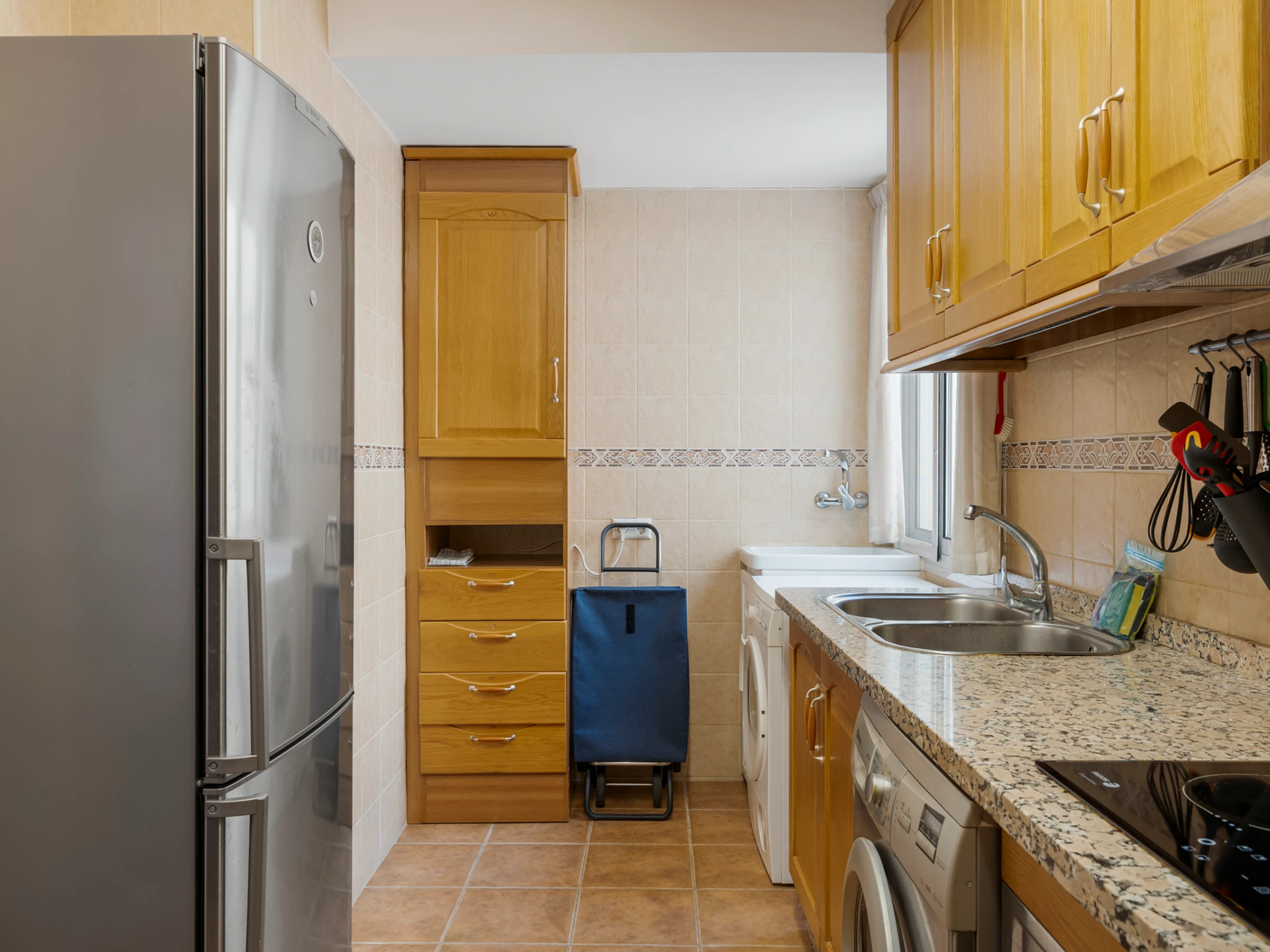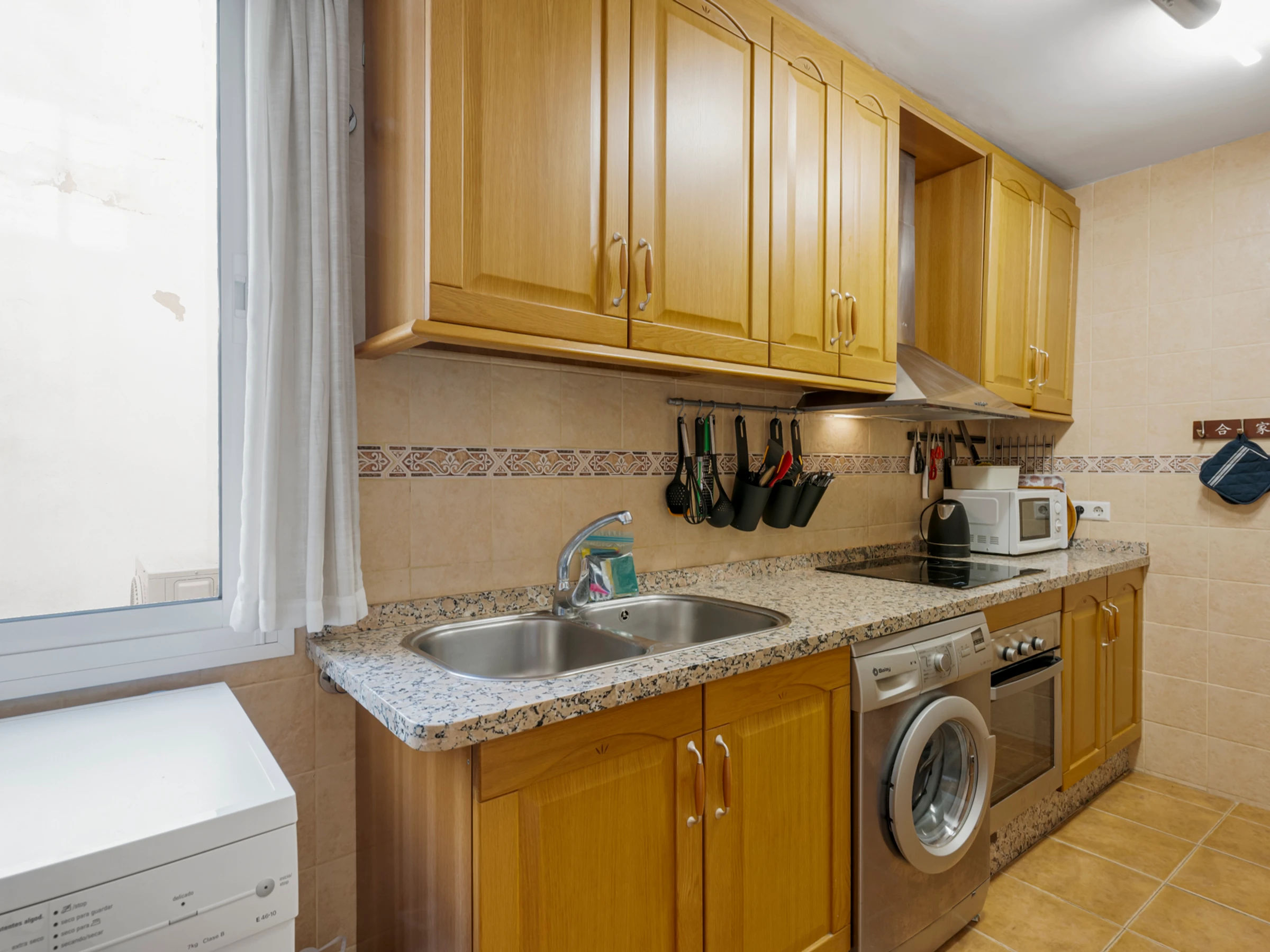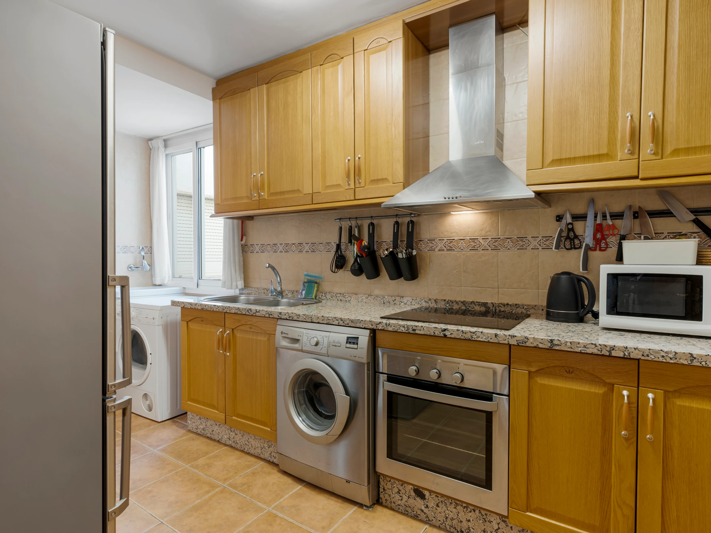 La cuisine, est équipée avec réfrigérateur, micro-ondes, four, congélateur, ustensiles/cuisine, cafetière, grille pain et bouilloire.